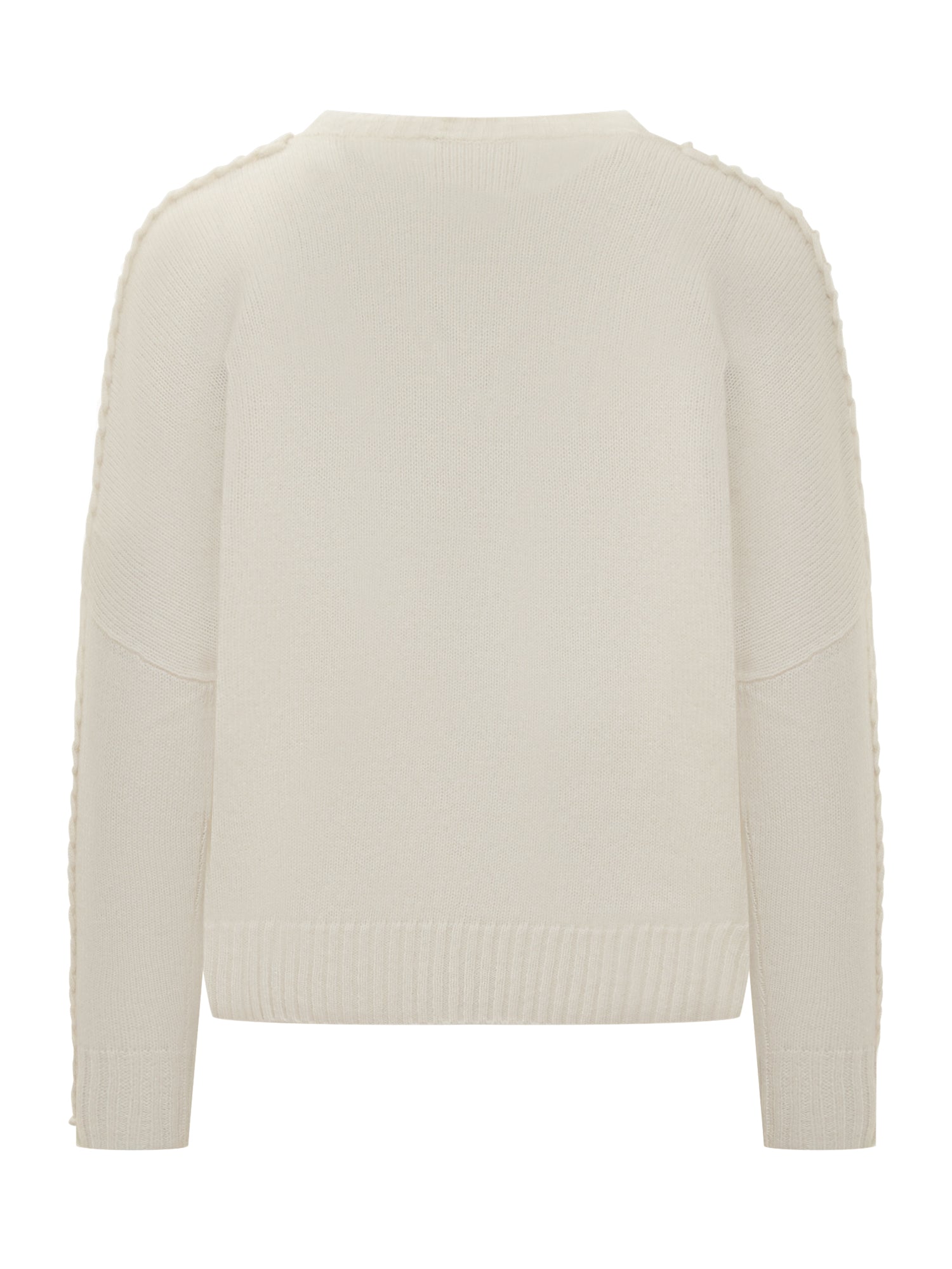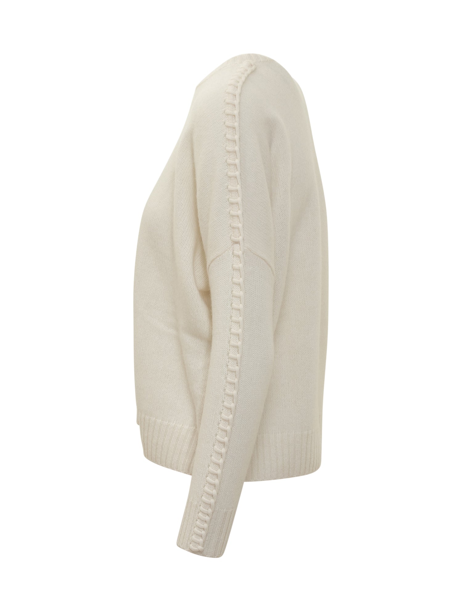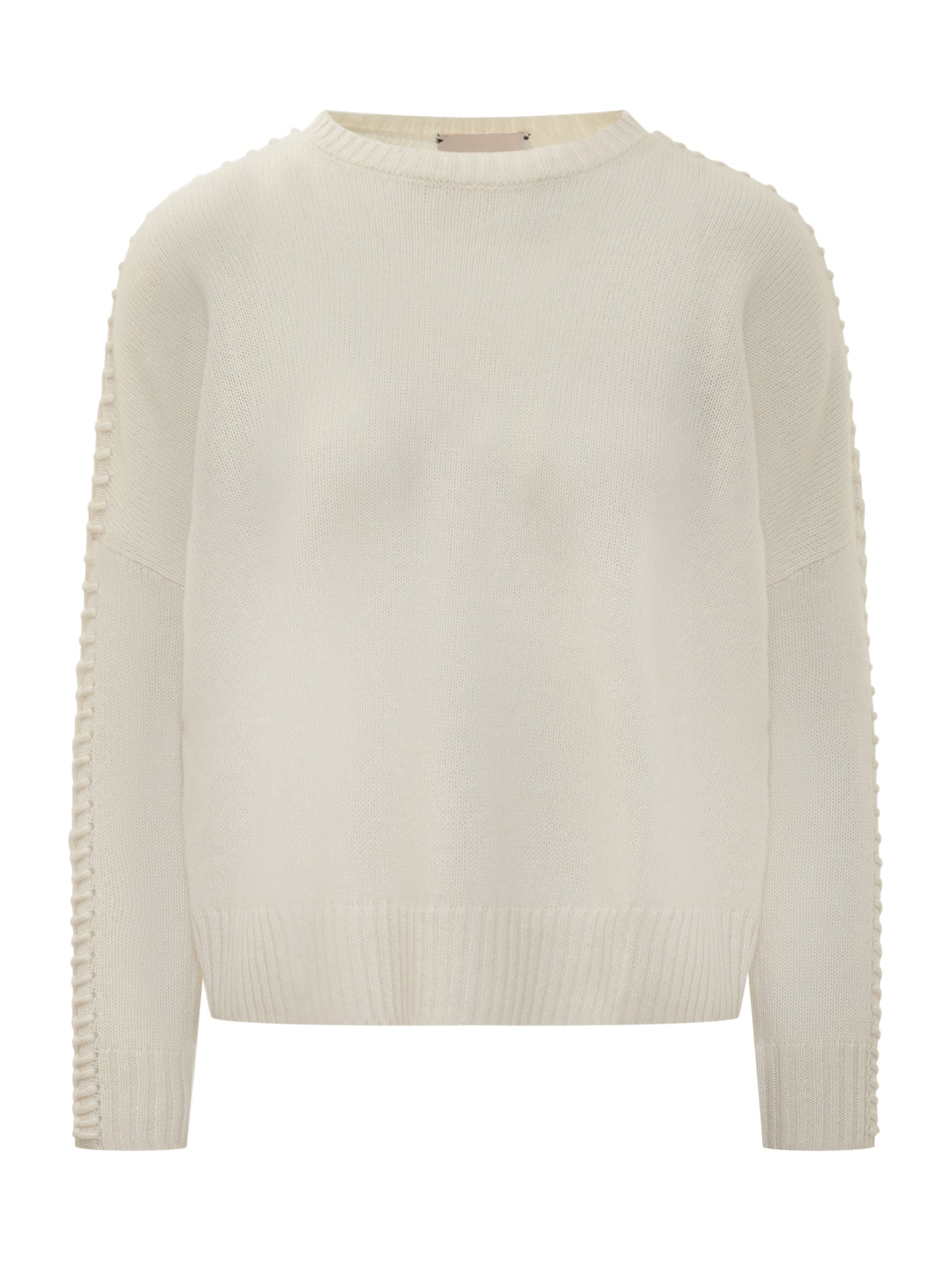 Kujten white cashmere sweater with crew neck and textured detailing along the sleeves.