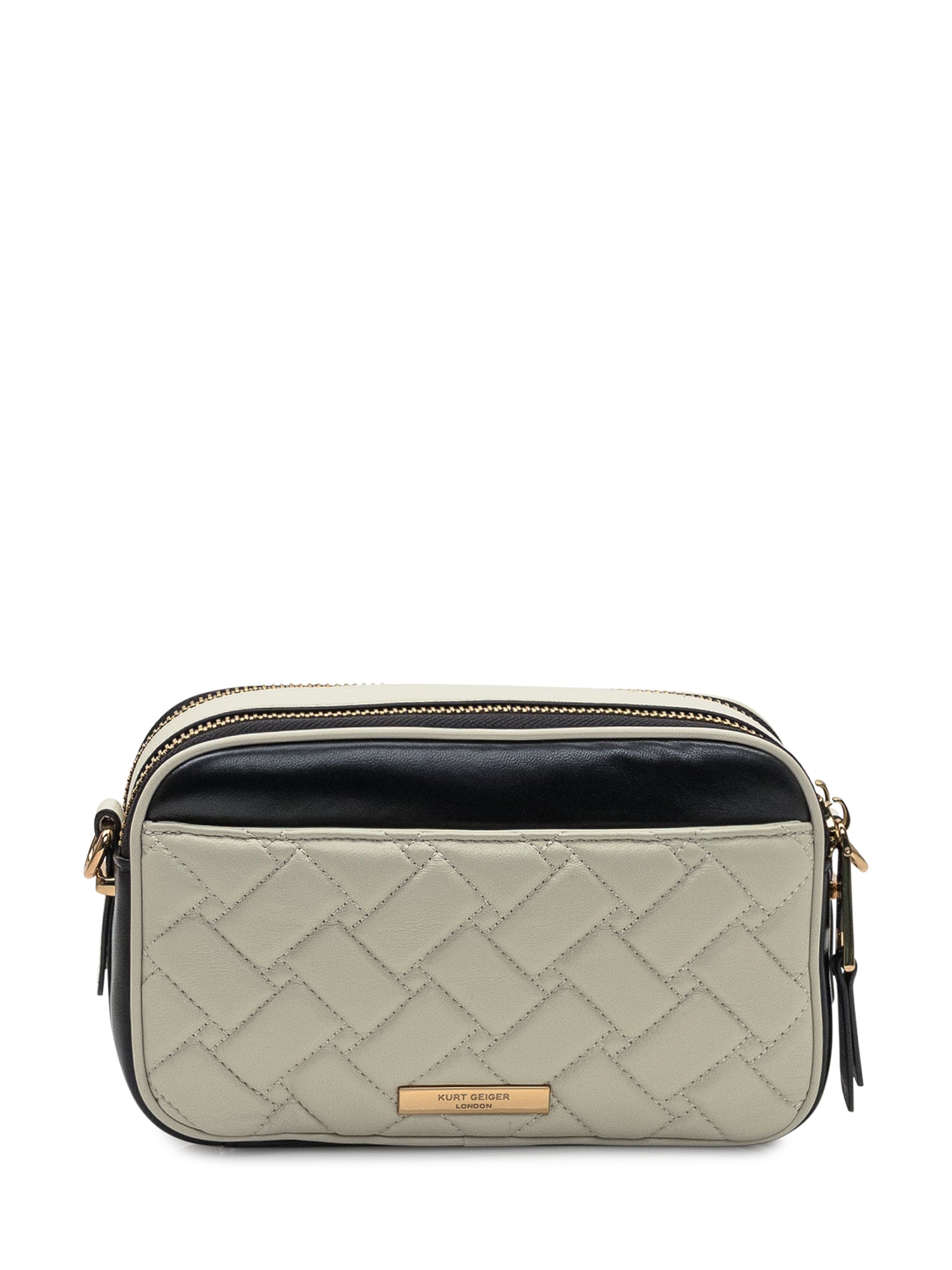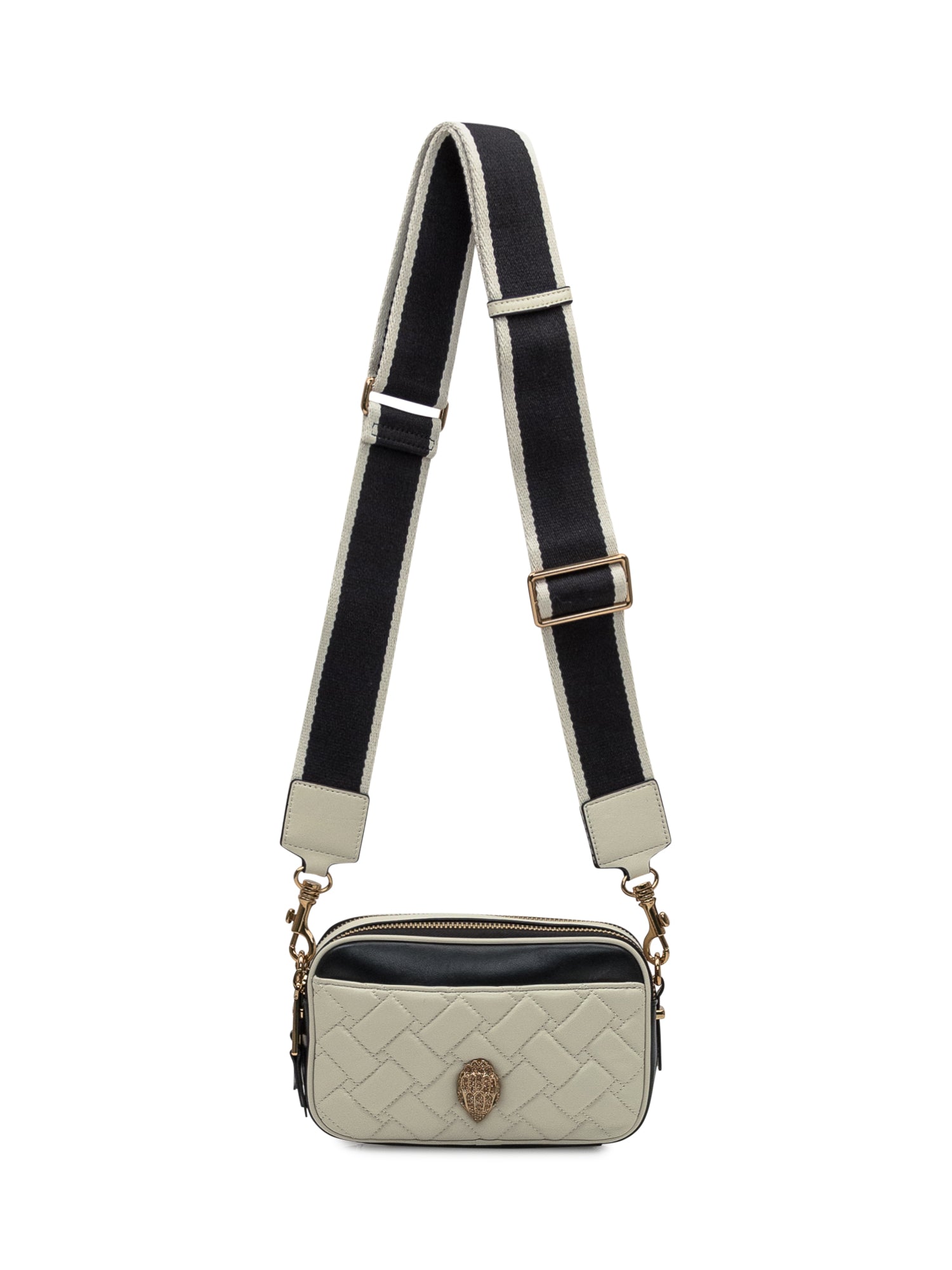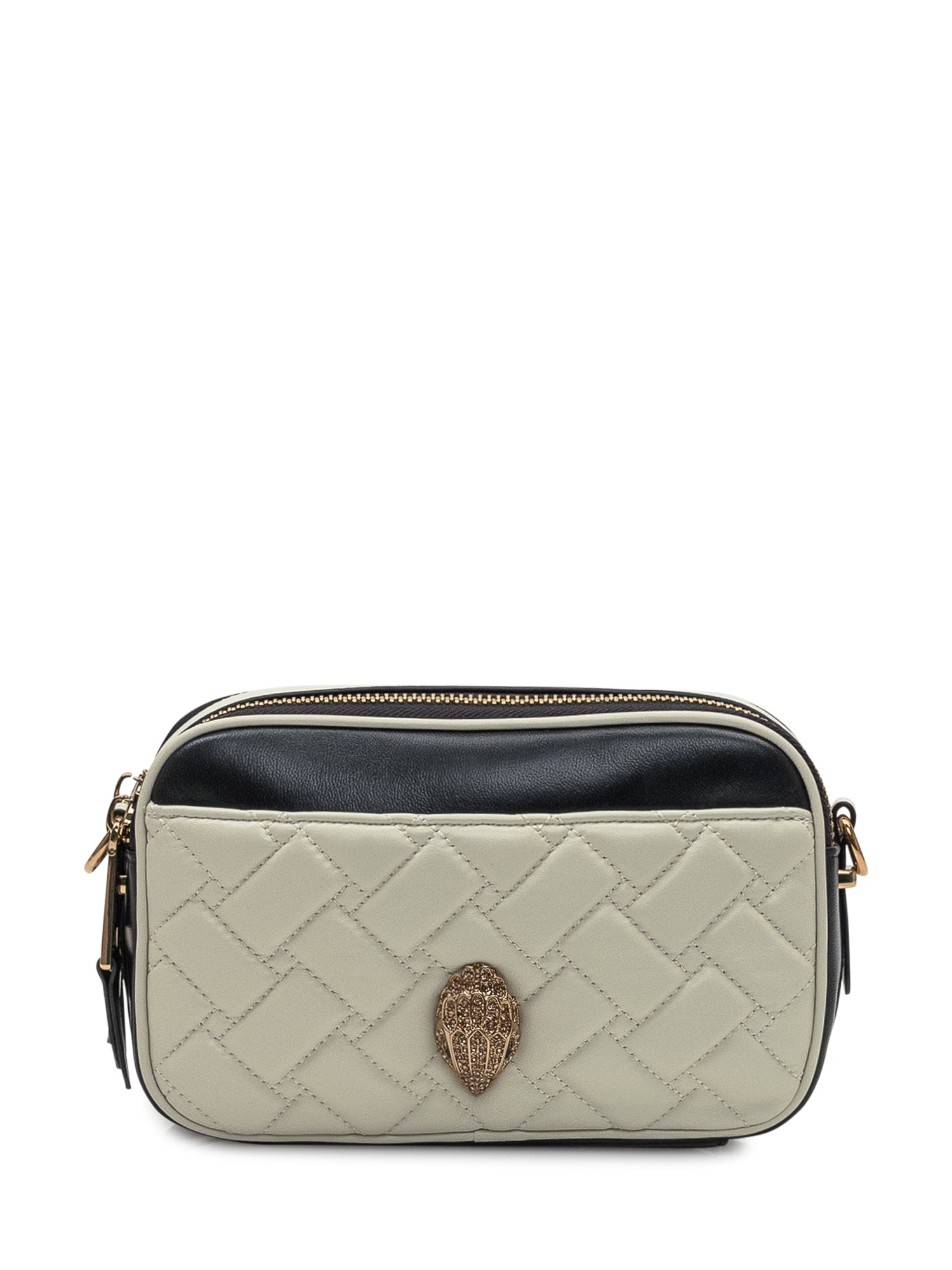 Kurt Geiger Kensington crossbody bag in beige and black quilted leather. Compact design with zip closure, gold-tone details and the iconic eagle emblem on the front.