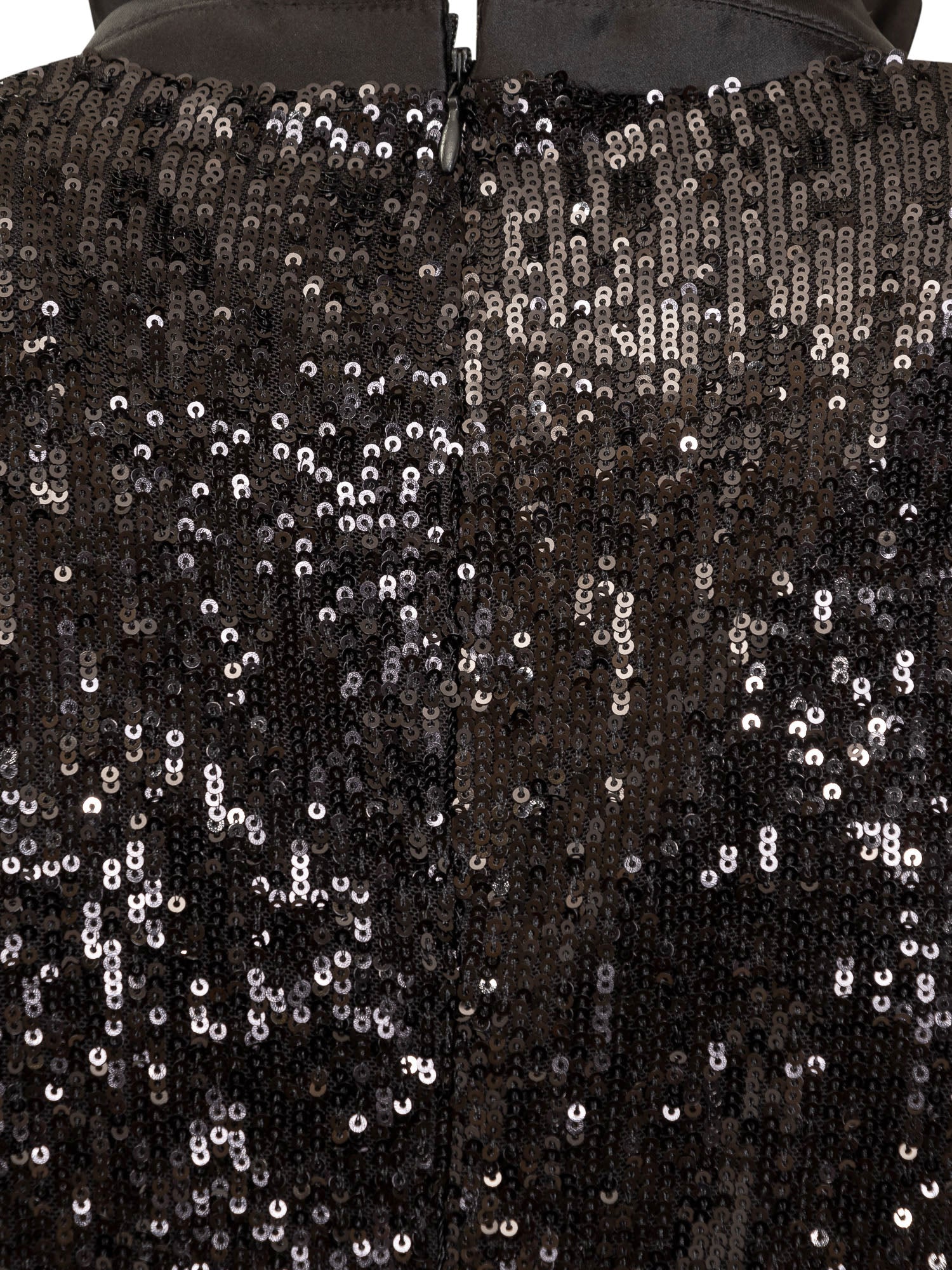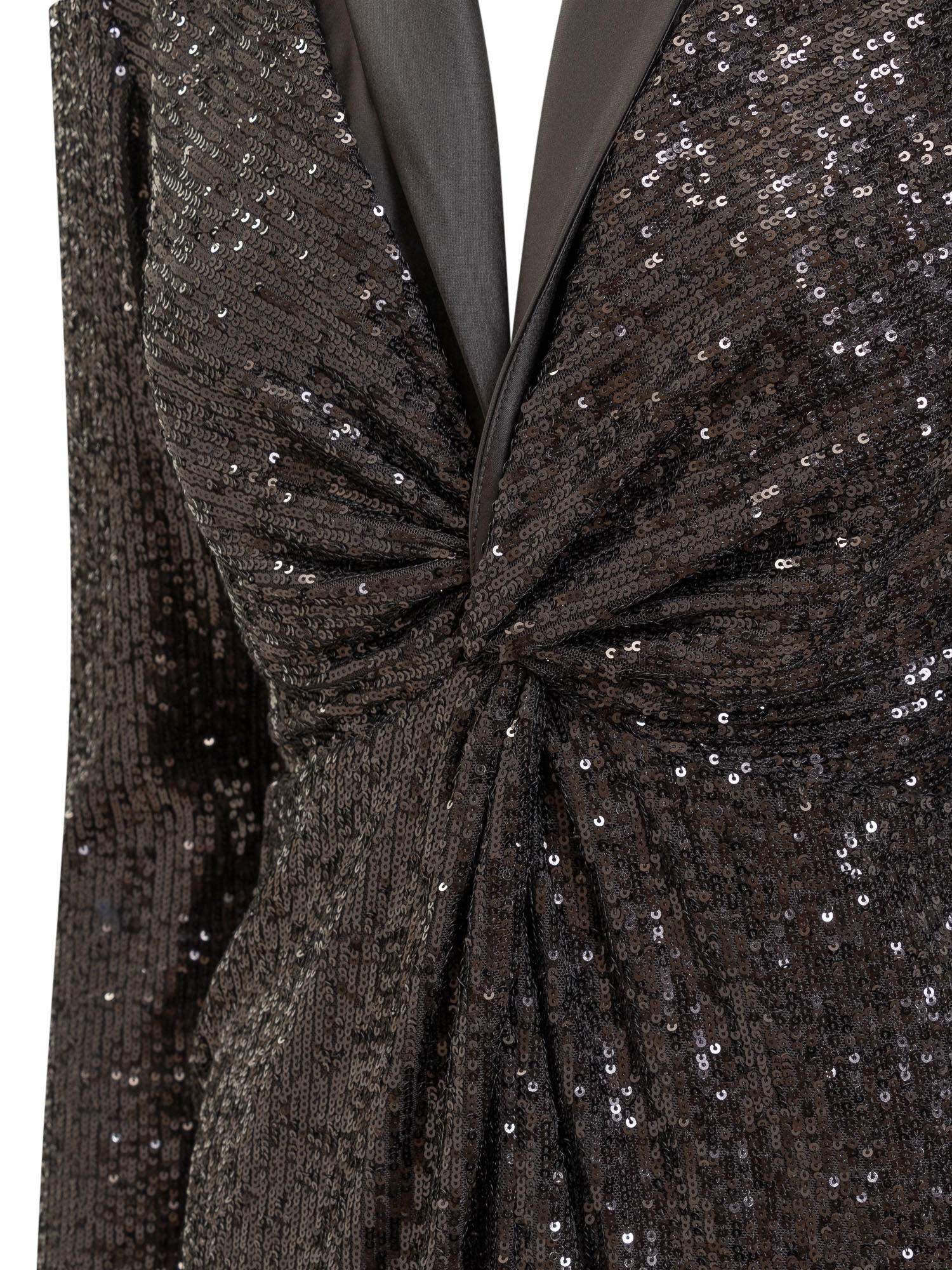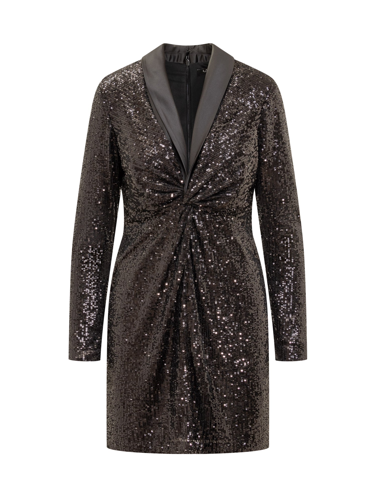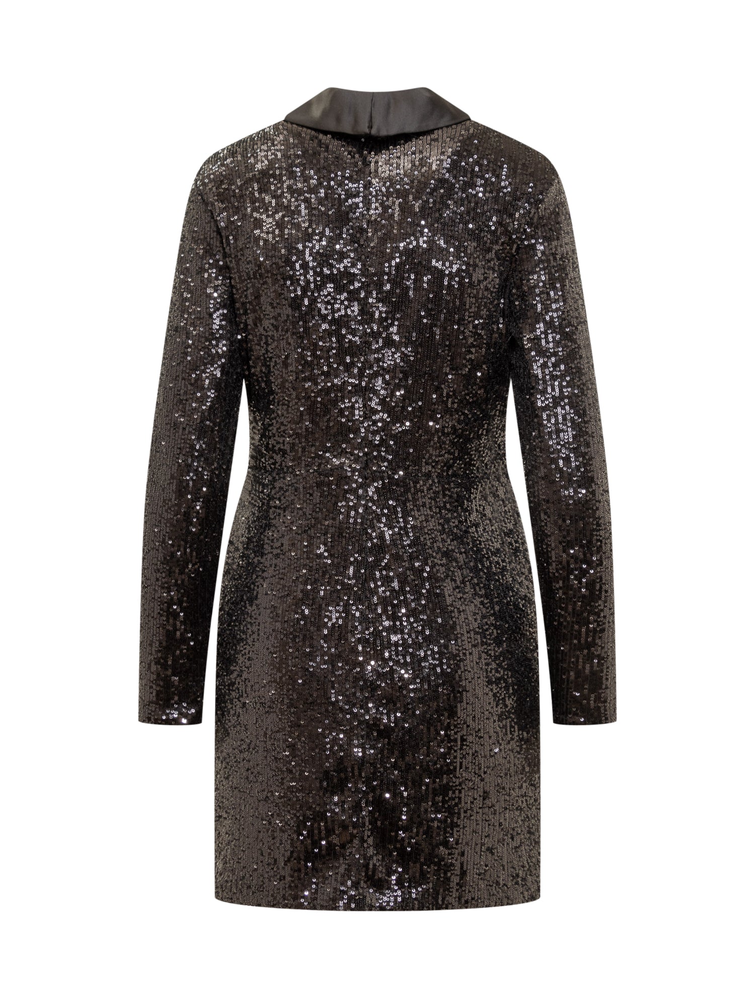 Long-sleeved midi dress. V-neckline. Back zipper closure. Curling at front. Sequins appliqué on front.