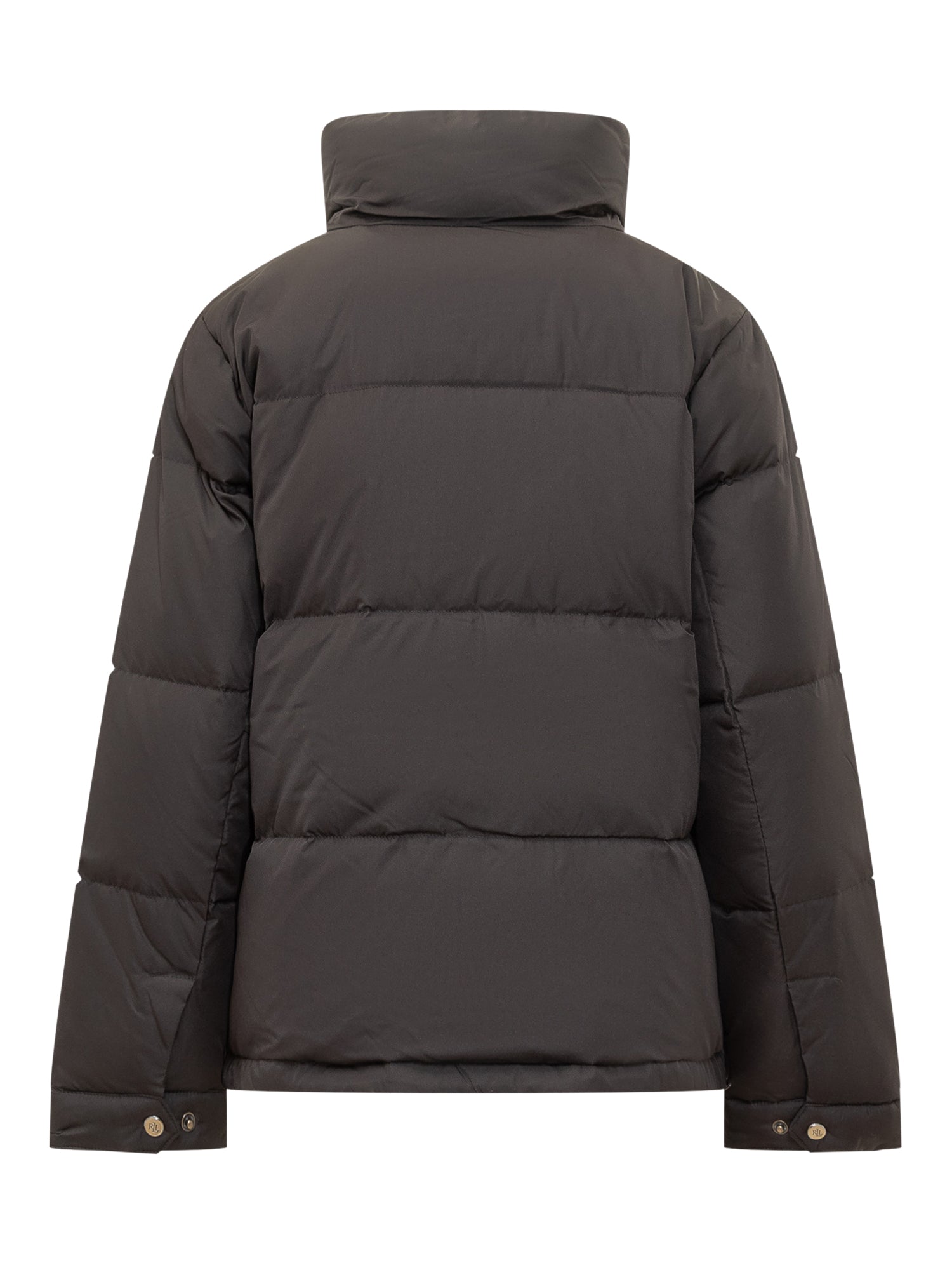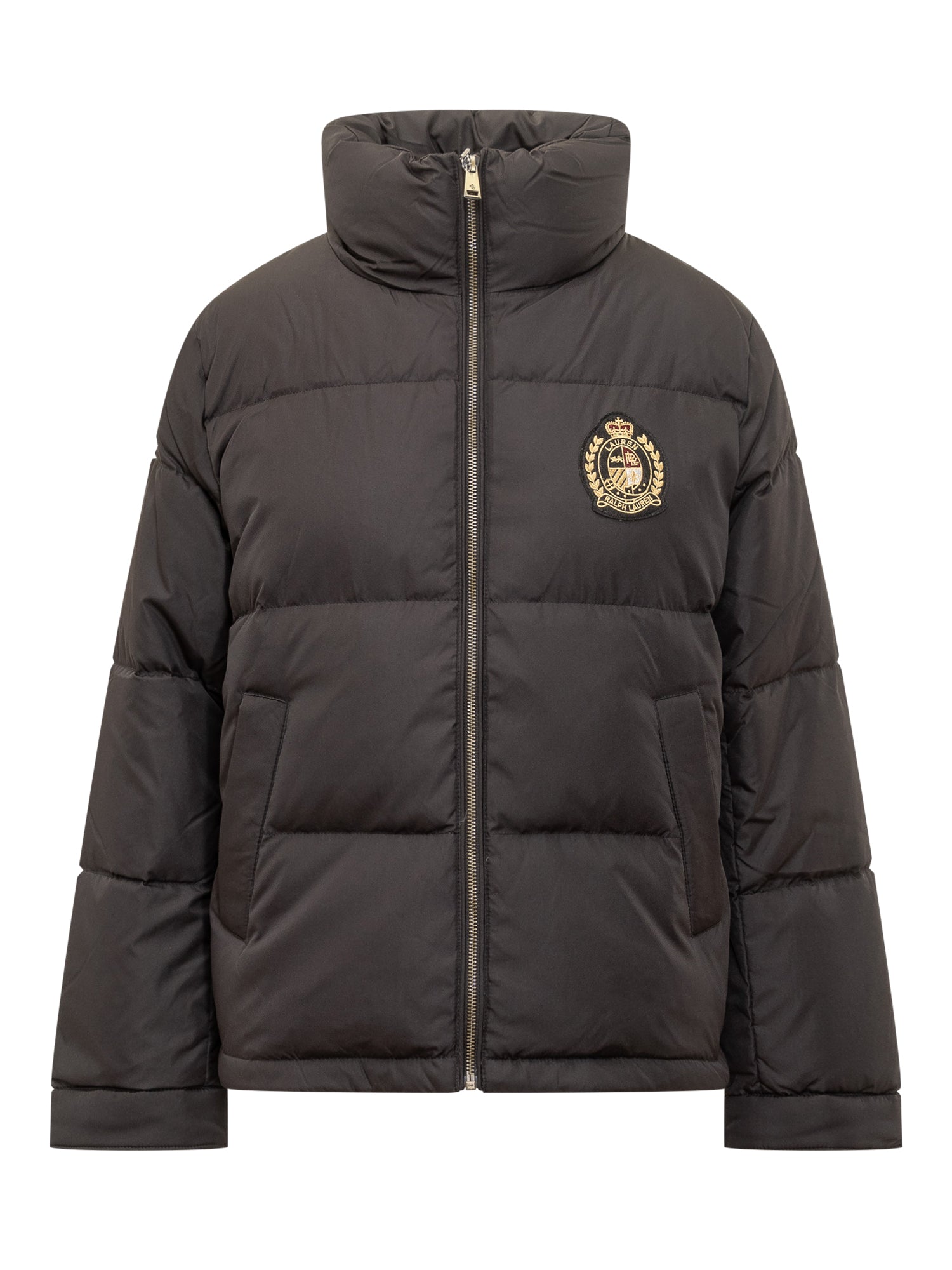 Lauren Ralph Lauren black puffer jacket with front zip and embroidered crest logo on the chest.