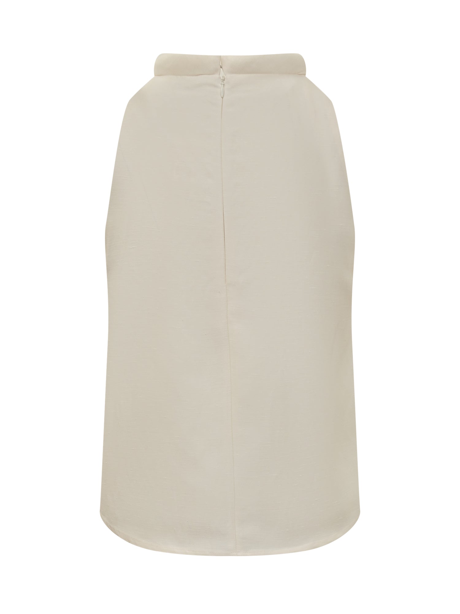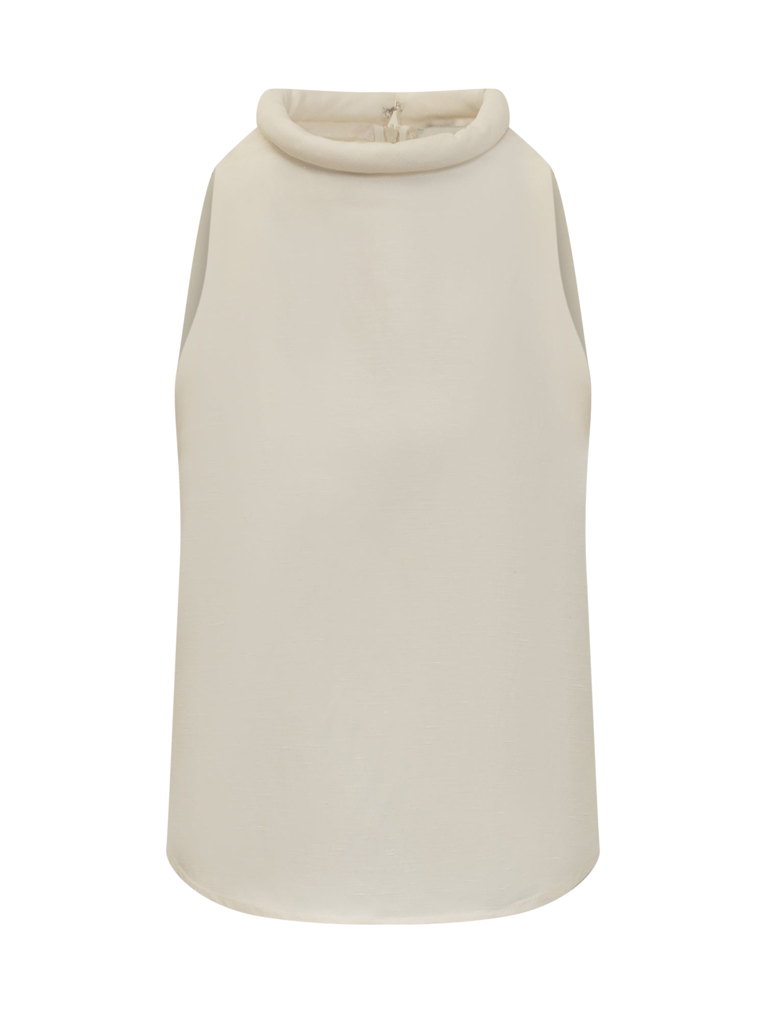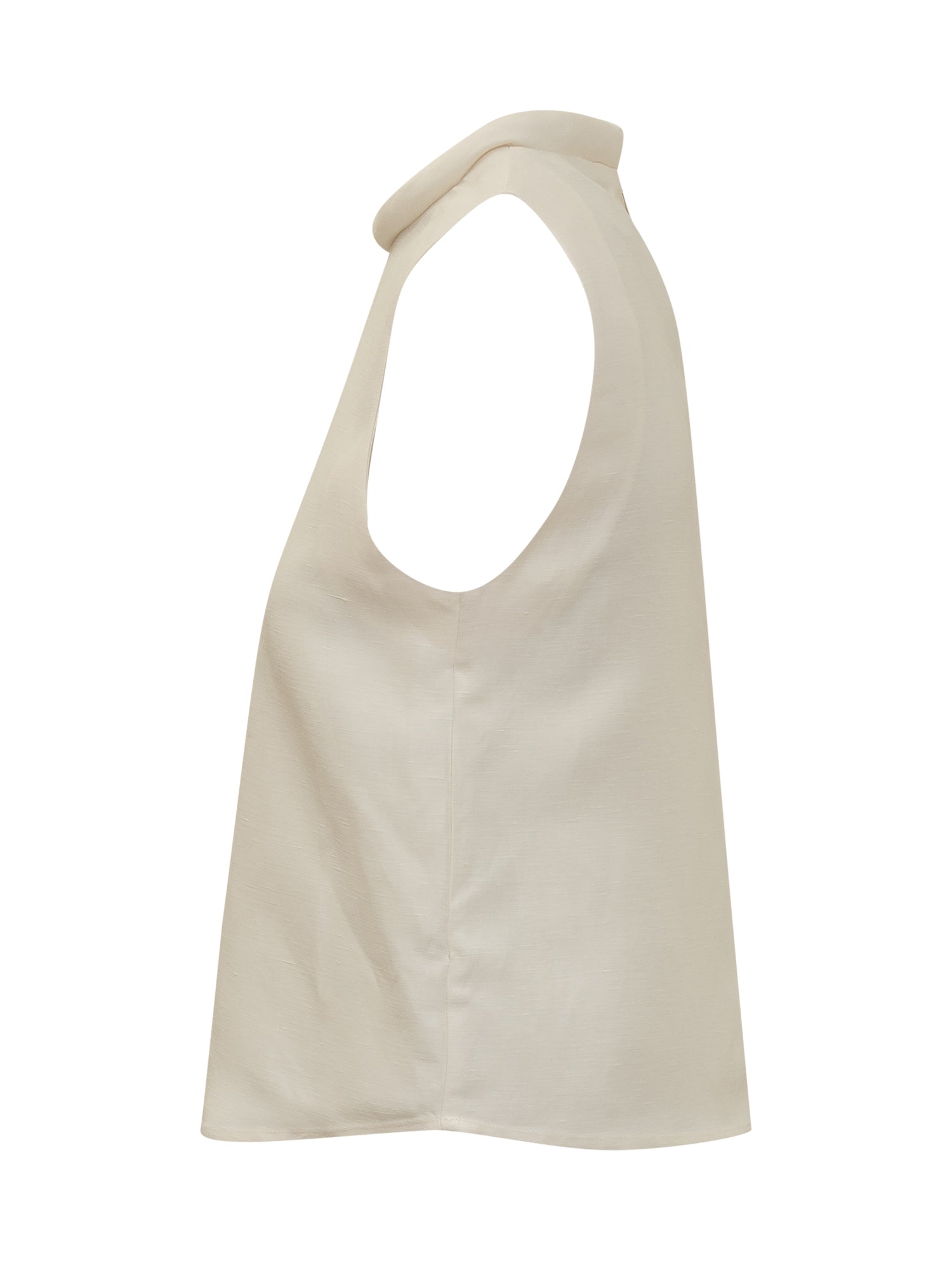 Linen-blend sleeveless top. Padded crew neck. Back zipper closure.