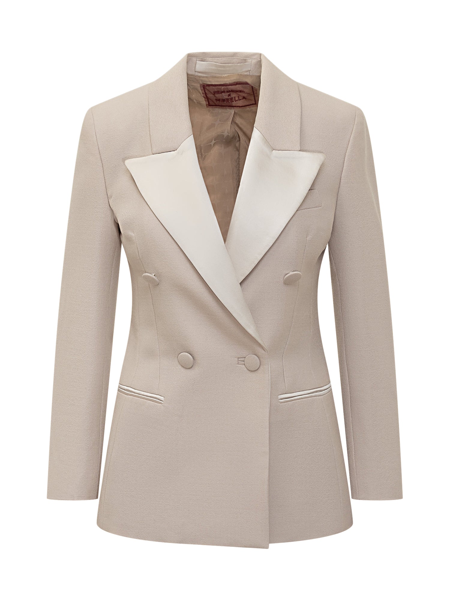 Blazer Marella Assoluto doppiopetto in beige con revers a contrasto in raso bianco e tasche a filetto.
