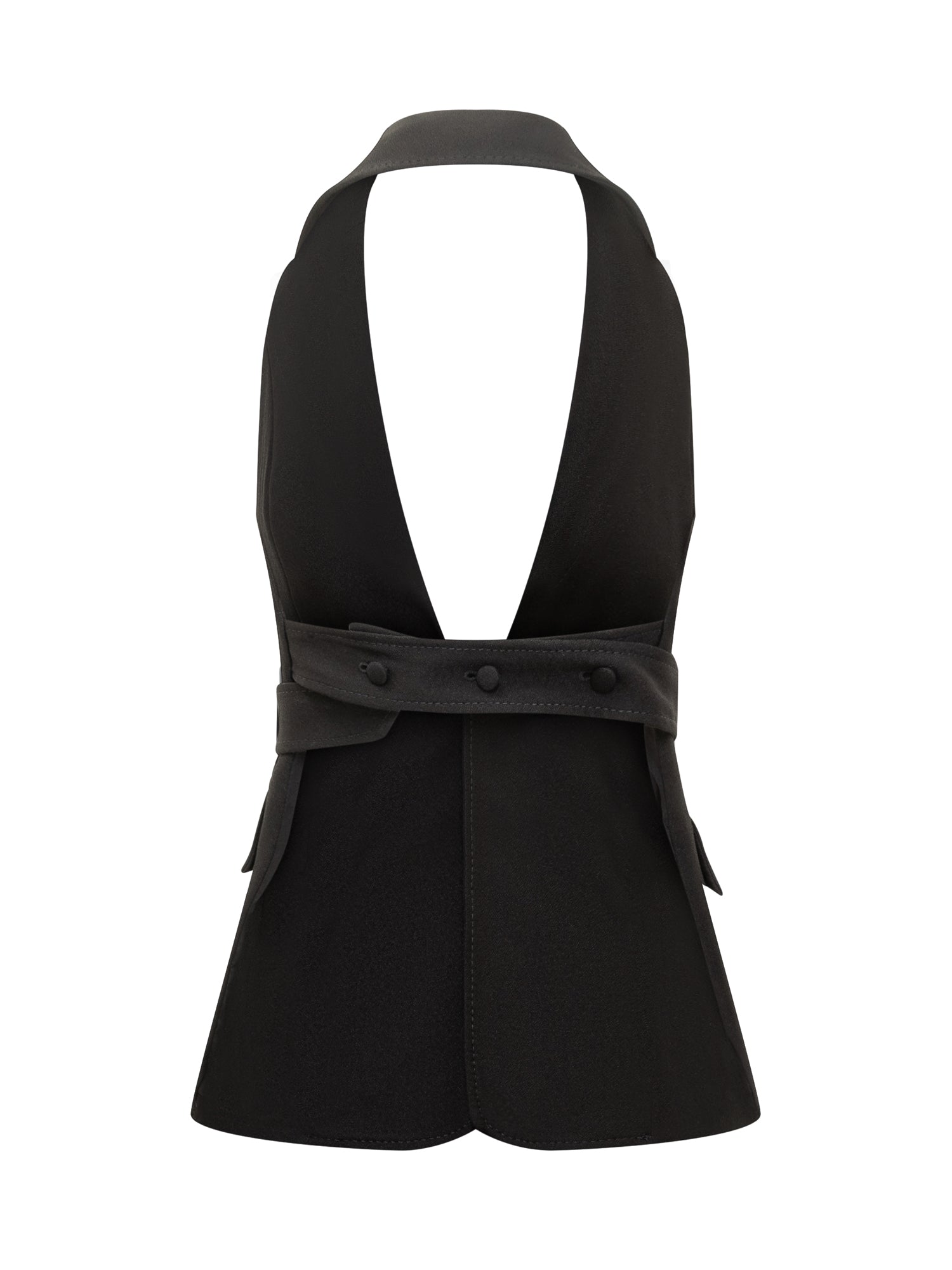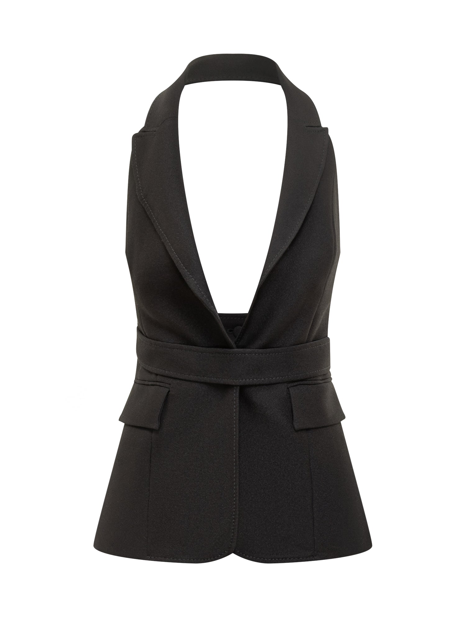 Black Marella Co-Design vest with deep halter neckline, classic lapel and waist belt.