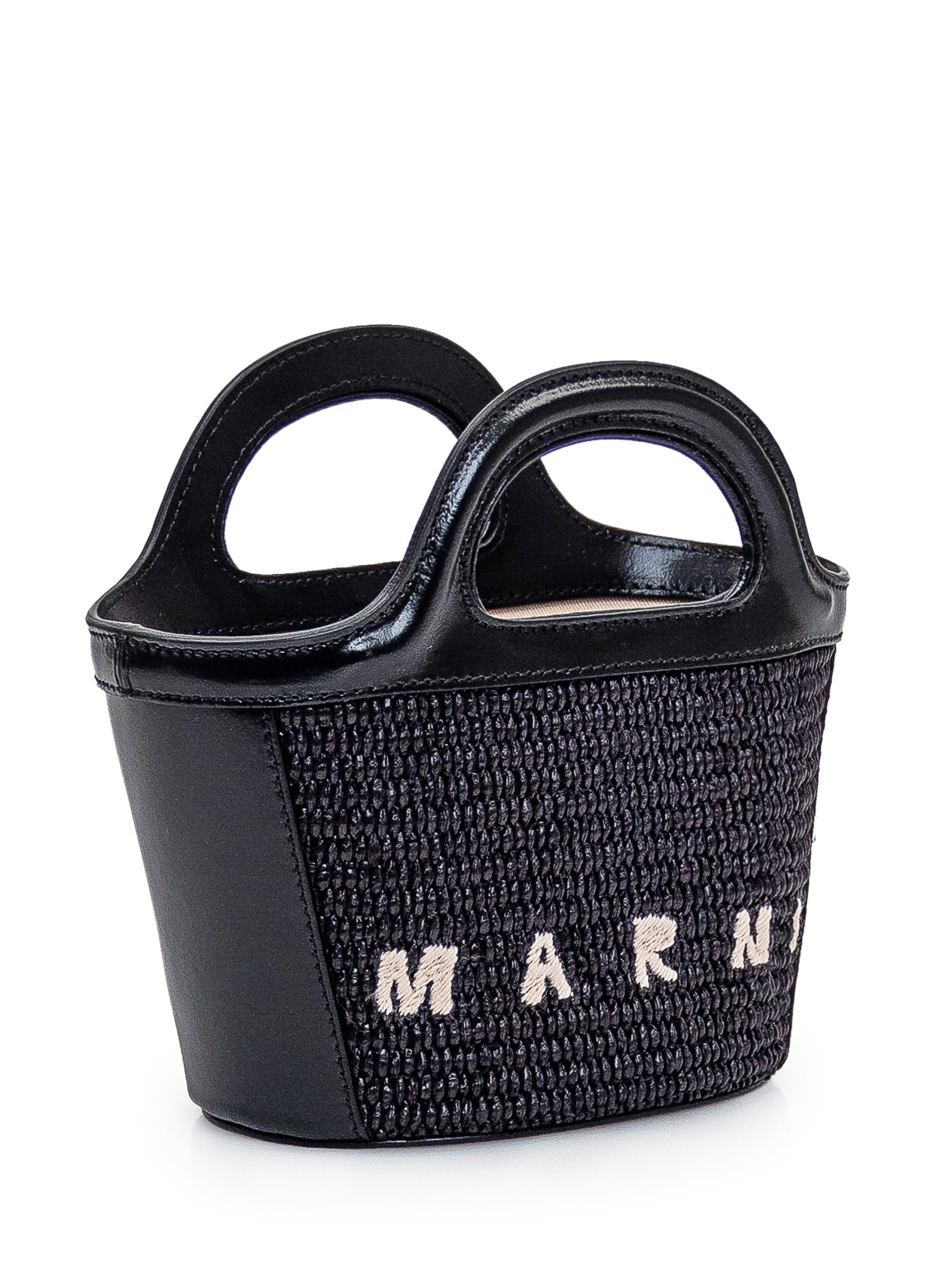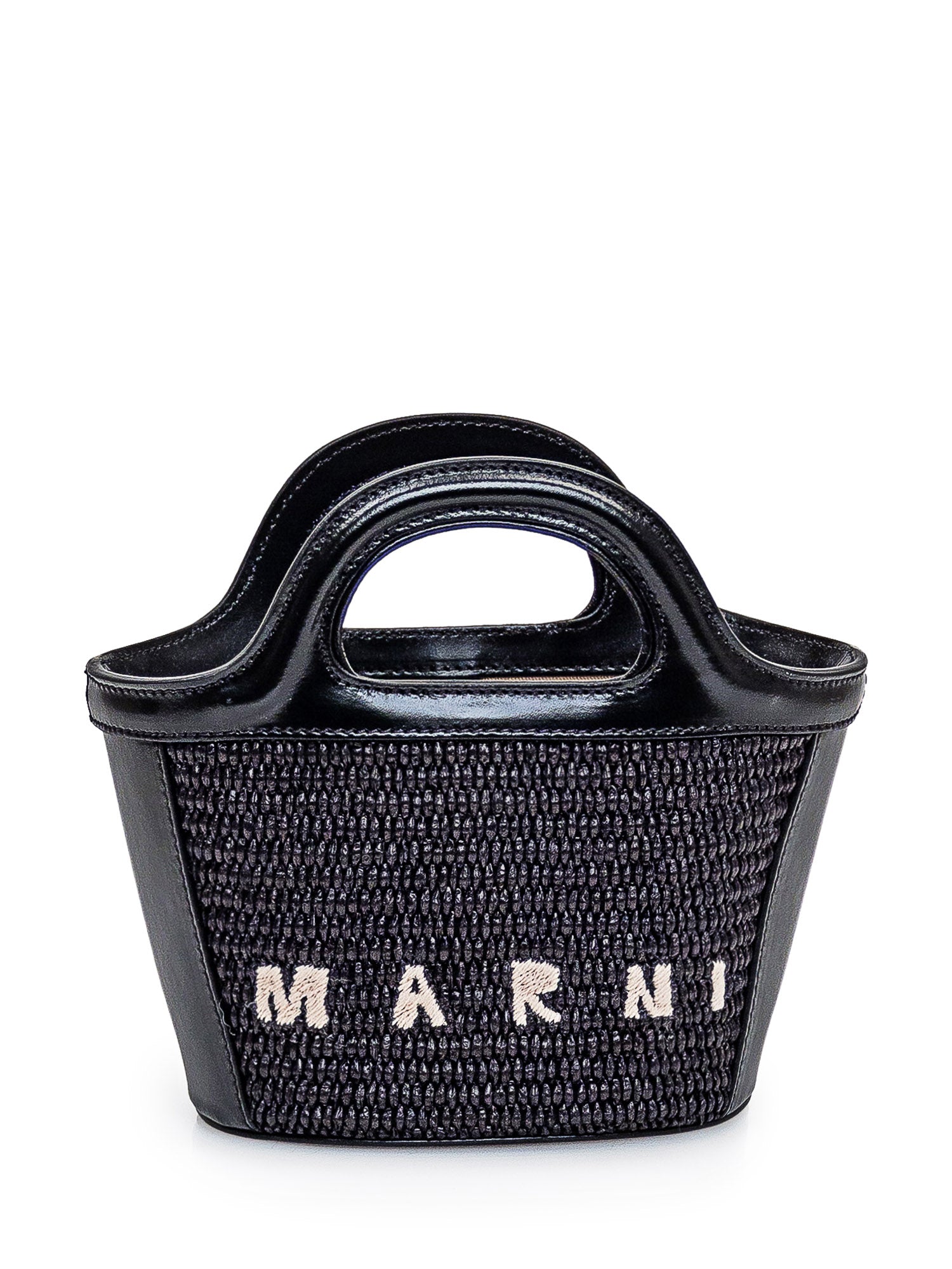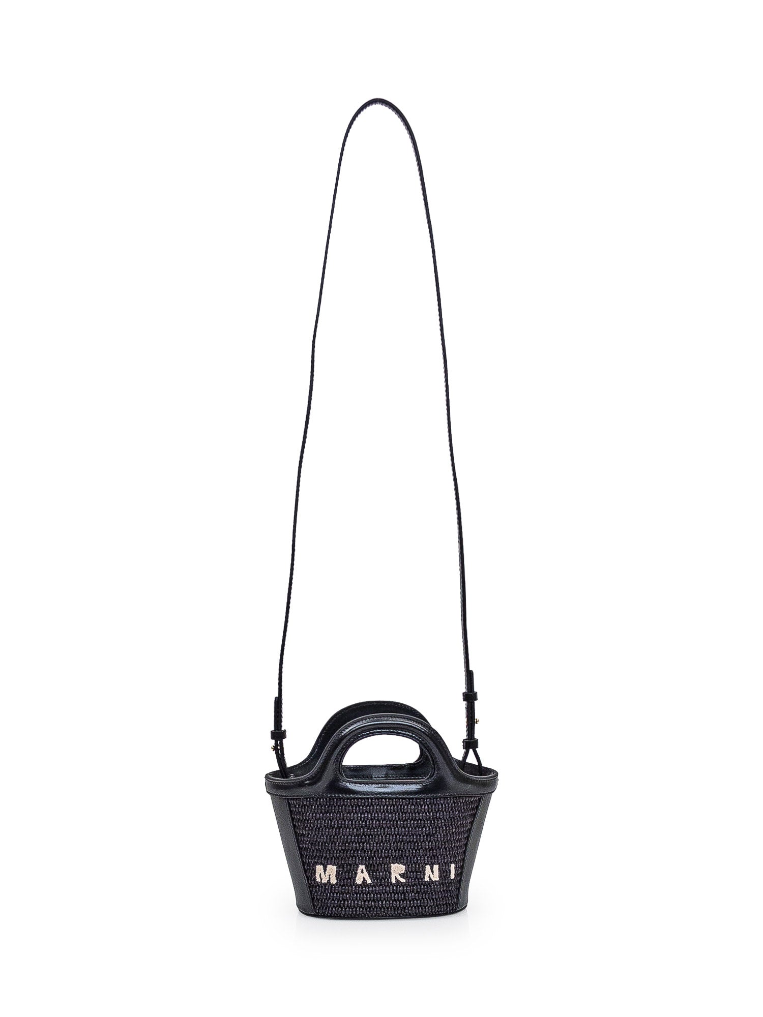 Black hand bag in raffia. Two handles. Adjustable and removable shoulder strap. Flat inside pocket. Embroidered logo on the front.
