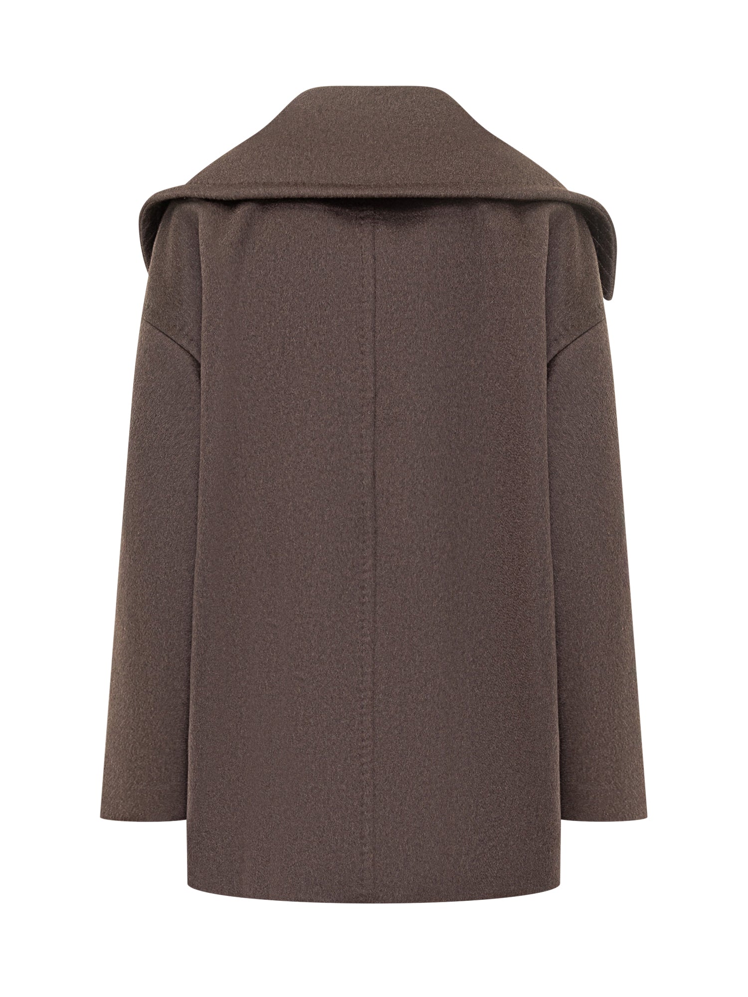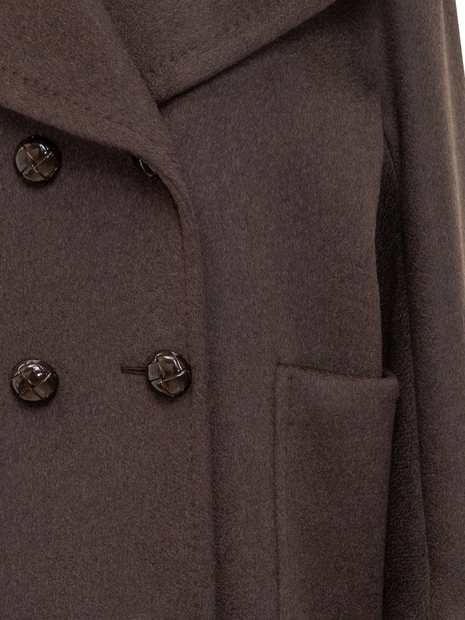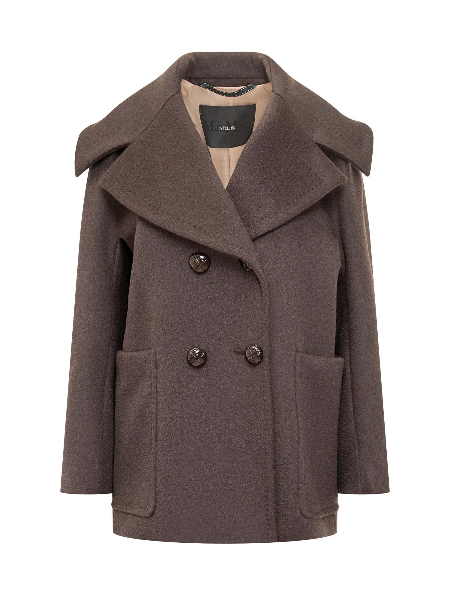 Max Mara Atelier short brown wool coat with double-breasted closure and wide lapels. Patch pockets and a soft silhouette.