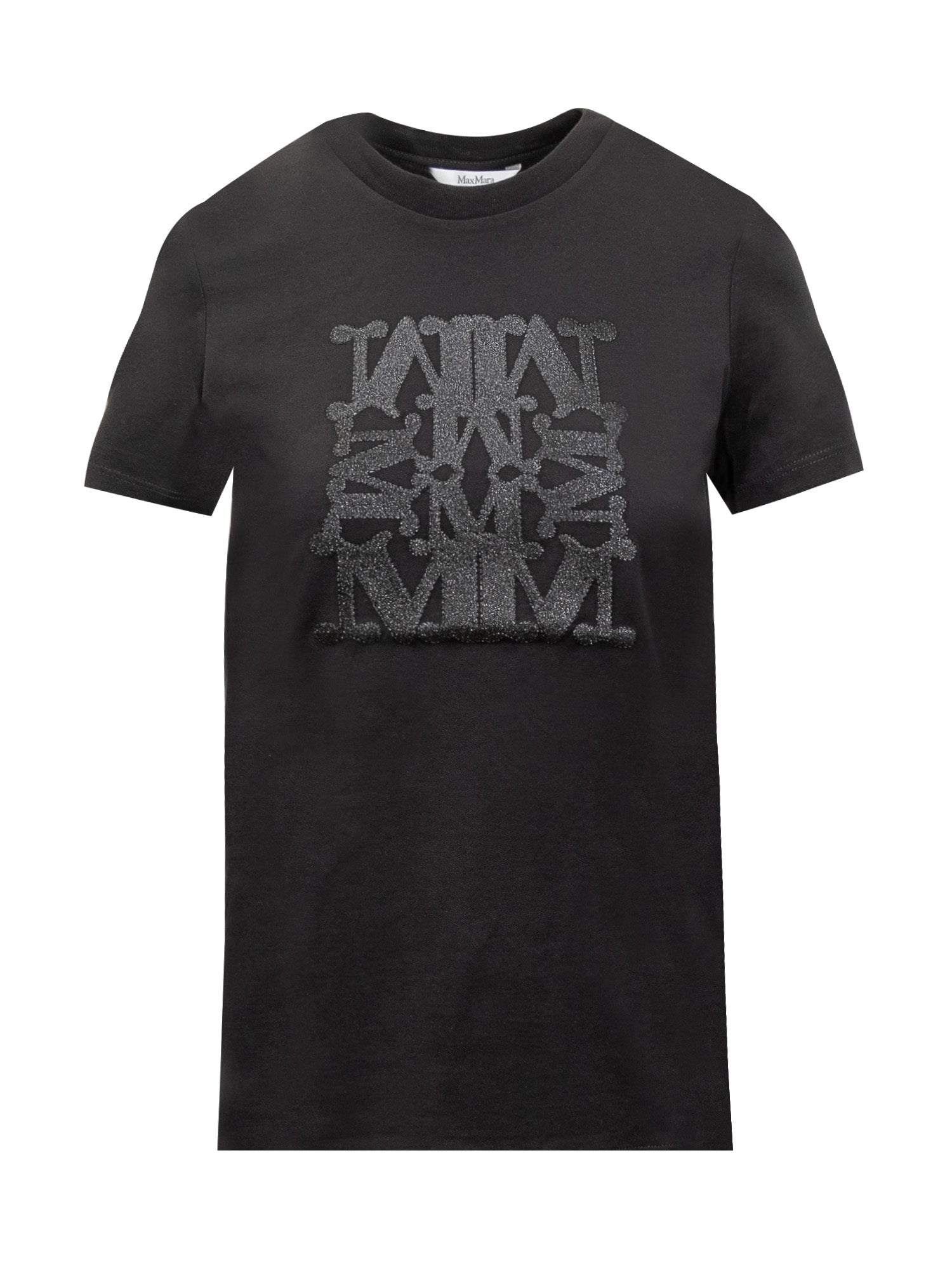 Short-sleeved cotton t-shirt. Crew neck. Ribbed hems. MaxMarabesque embroidered in lurex thread on the front. Straight line.