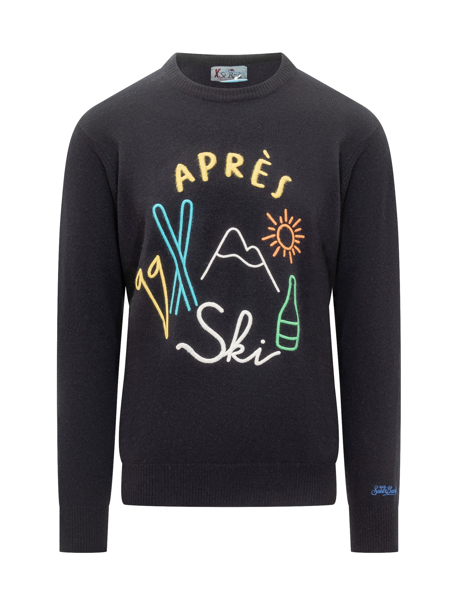 Saint Barth black sweater with colorful Après Ski embroidery. Made of soft wool.