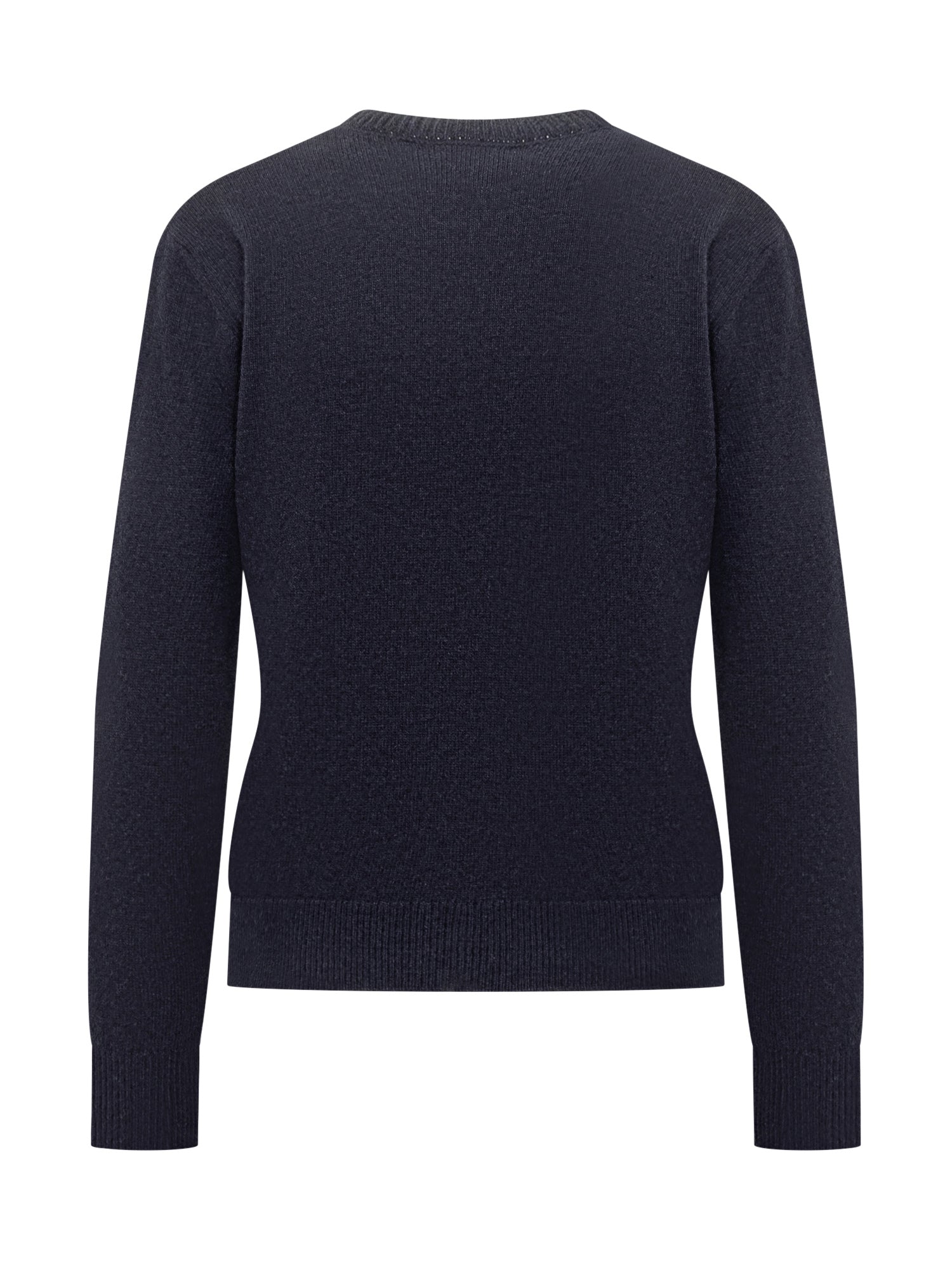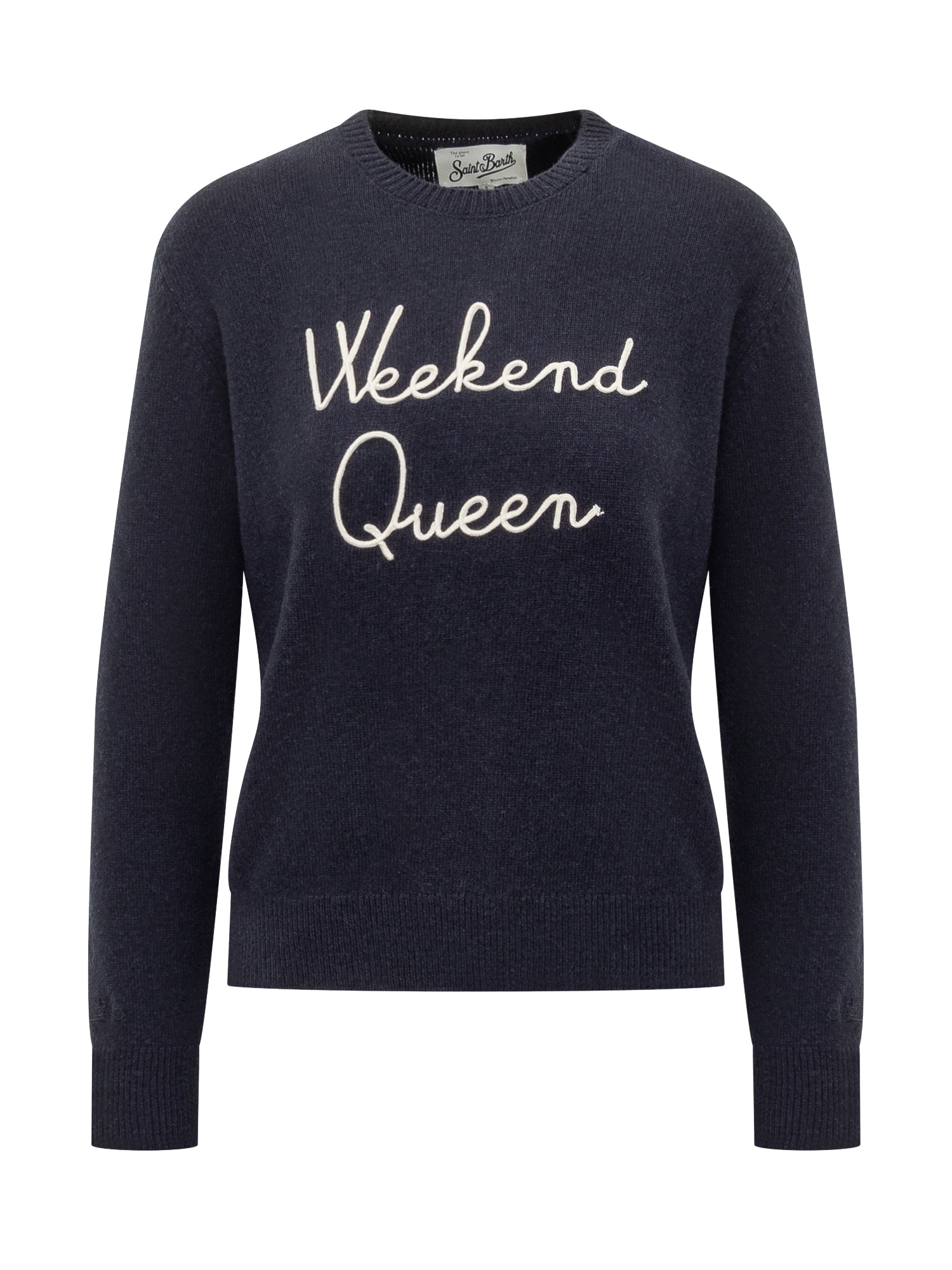 St. Barth navy wool sweater with front Weekend Queen embroidery. Crew neck, long sleeves, and ribbed trims.