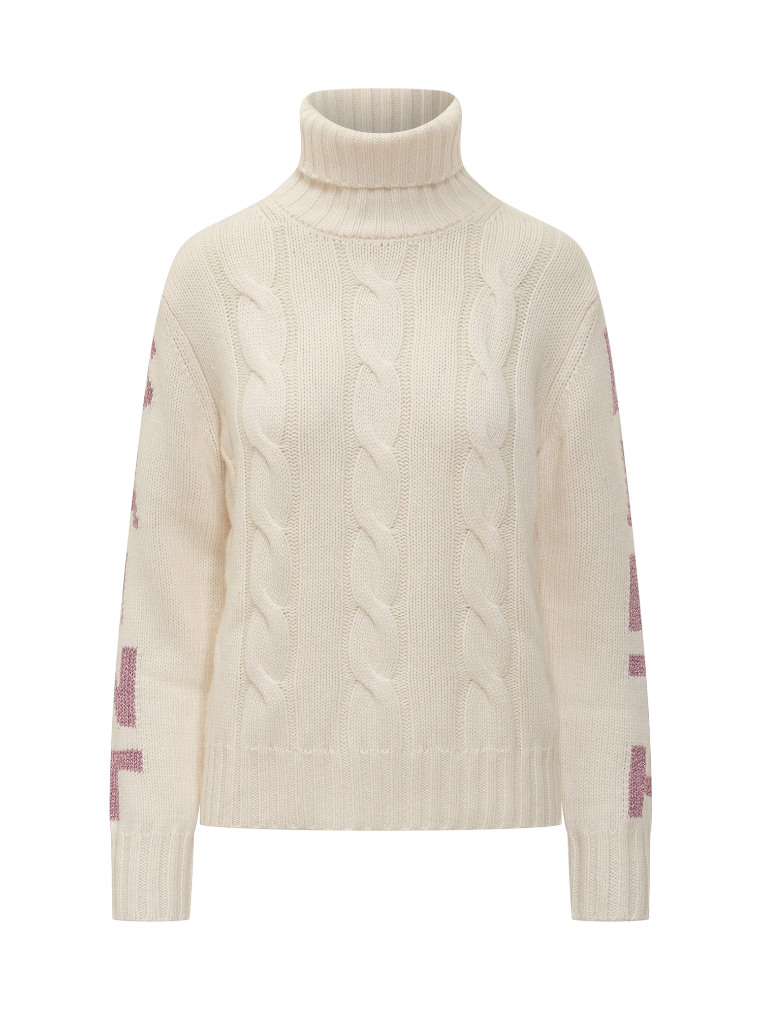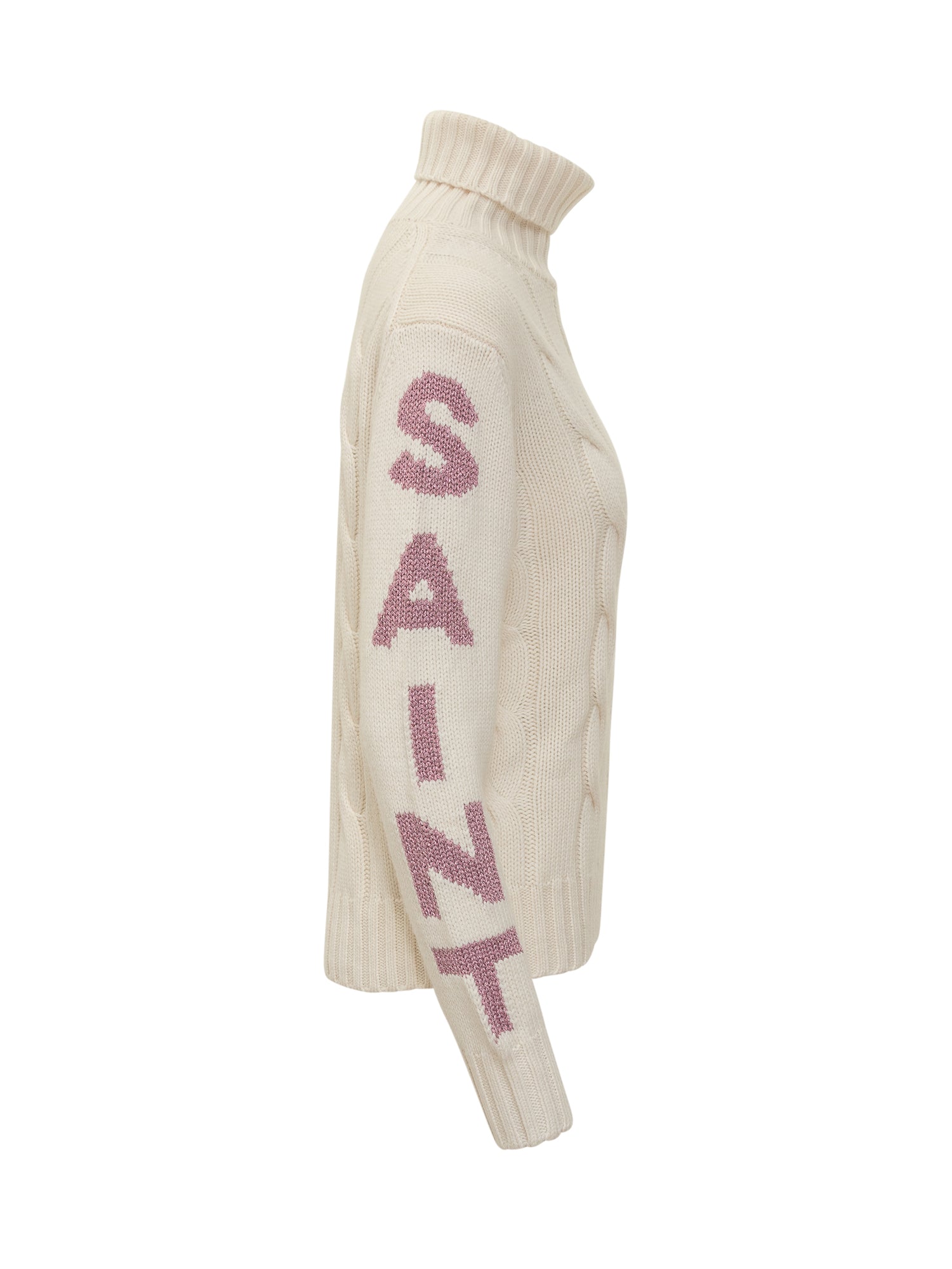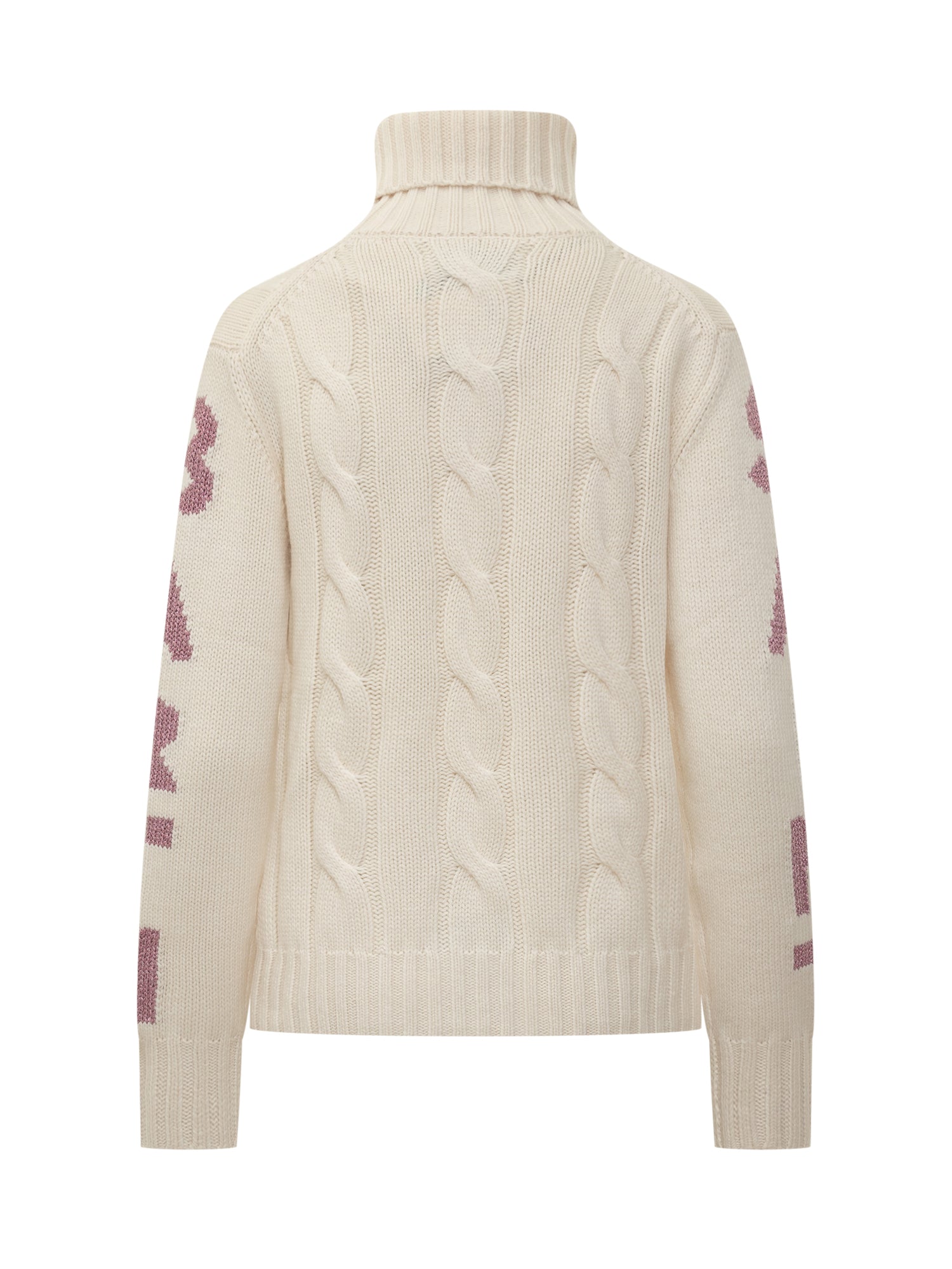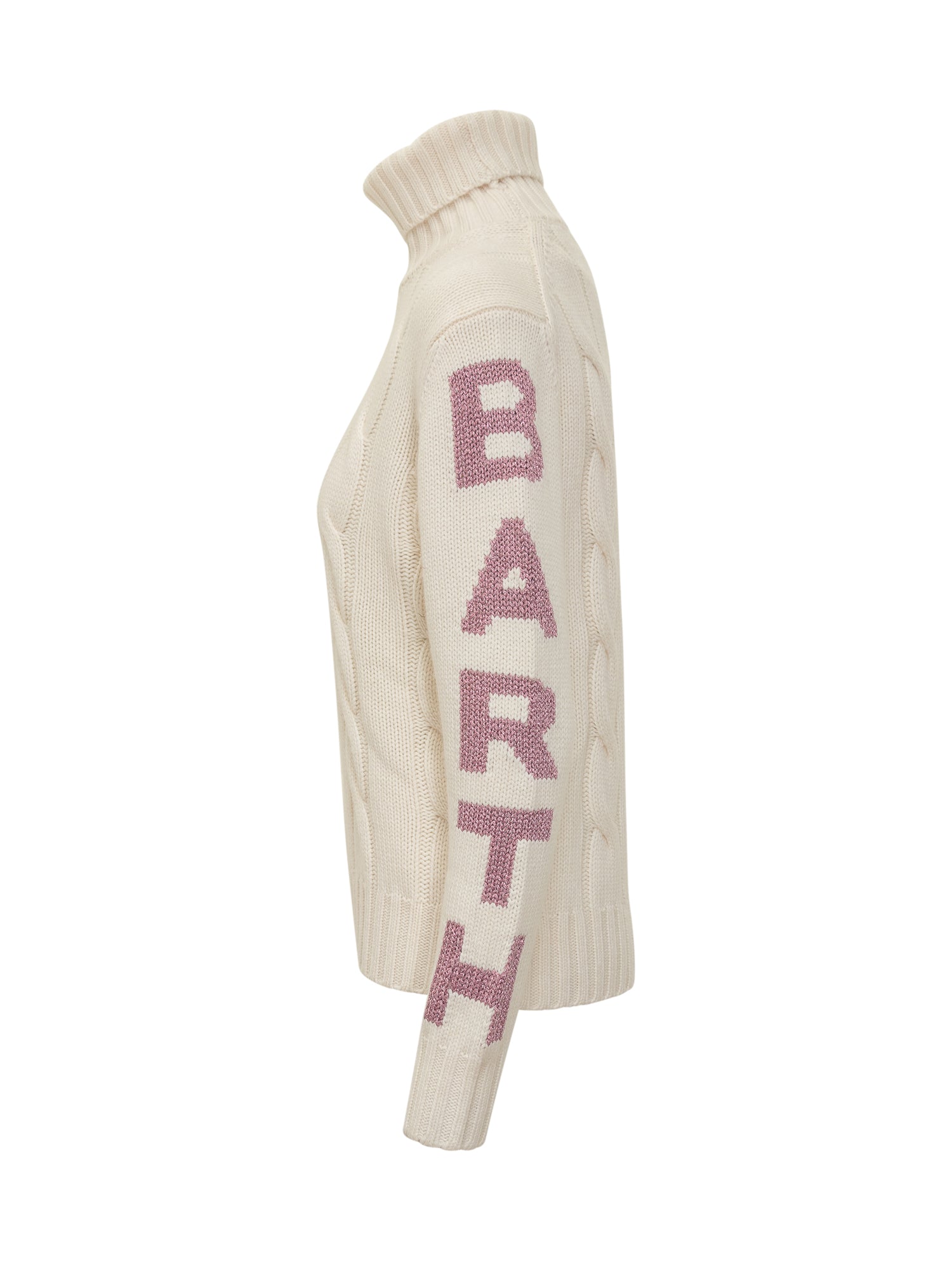 MC2 Saint Barth ivory wool turtleneck sweater with cable knit and oversized logo on the sleeves.