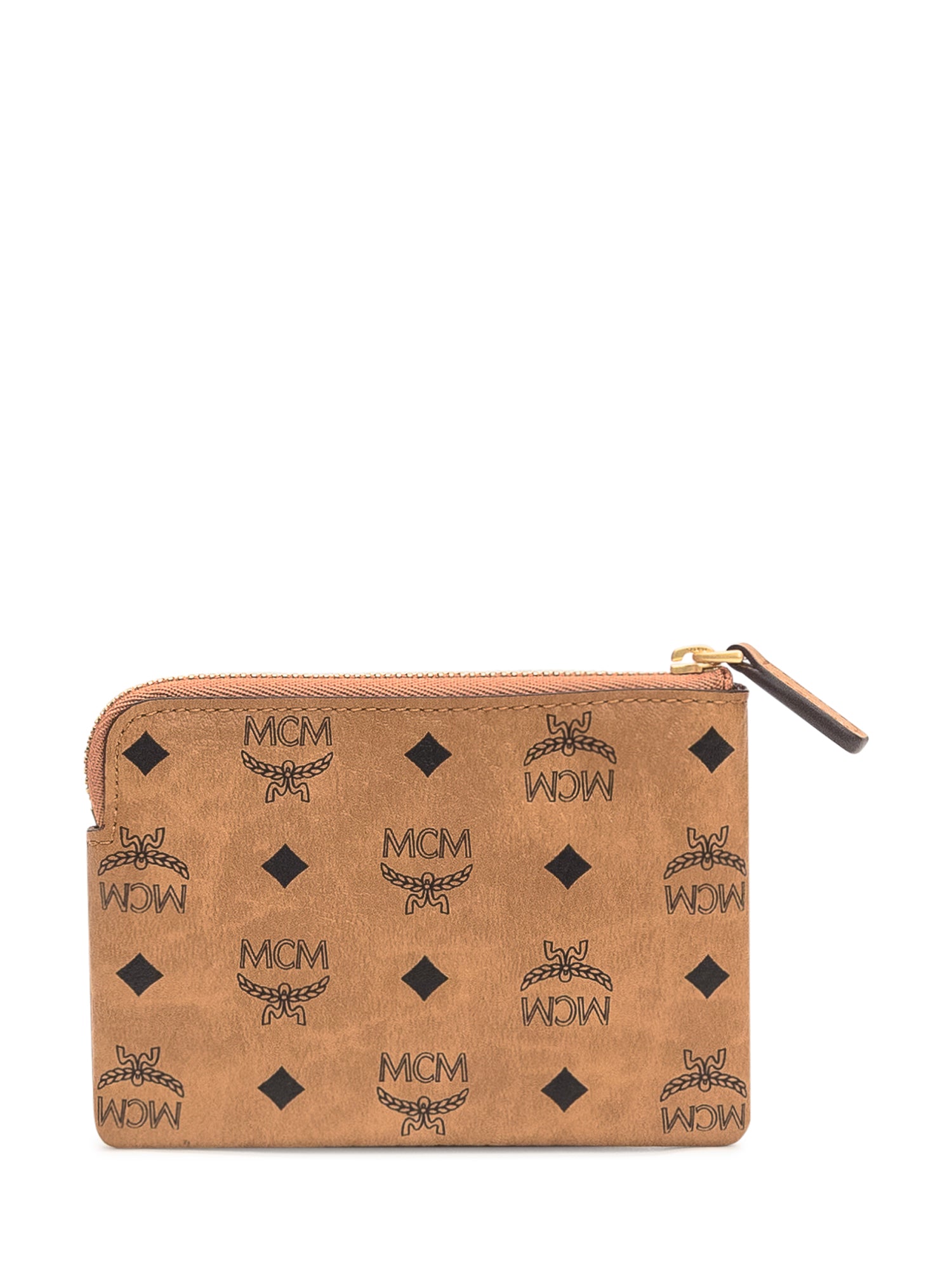 MCM card holder in cognac visetos with zip and gold logo plaque.