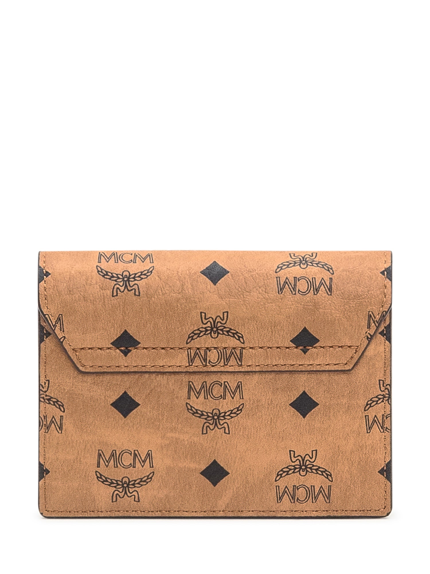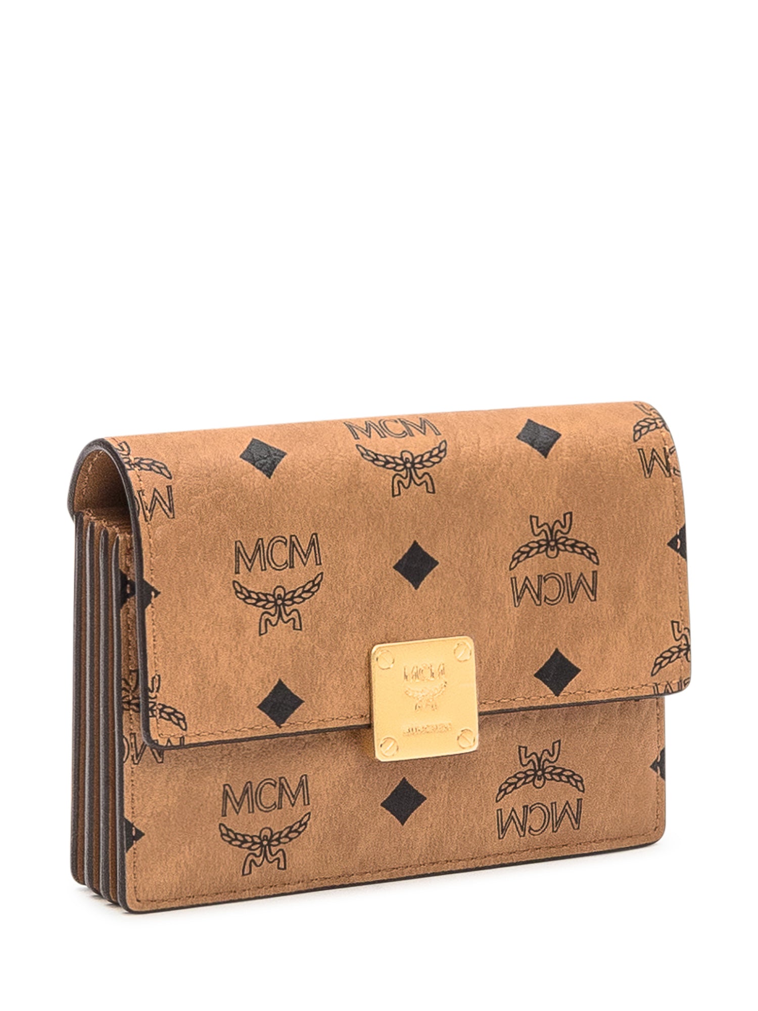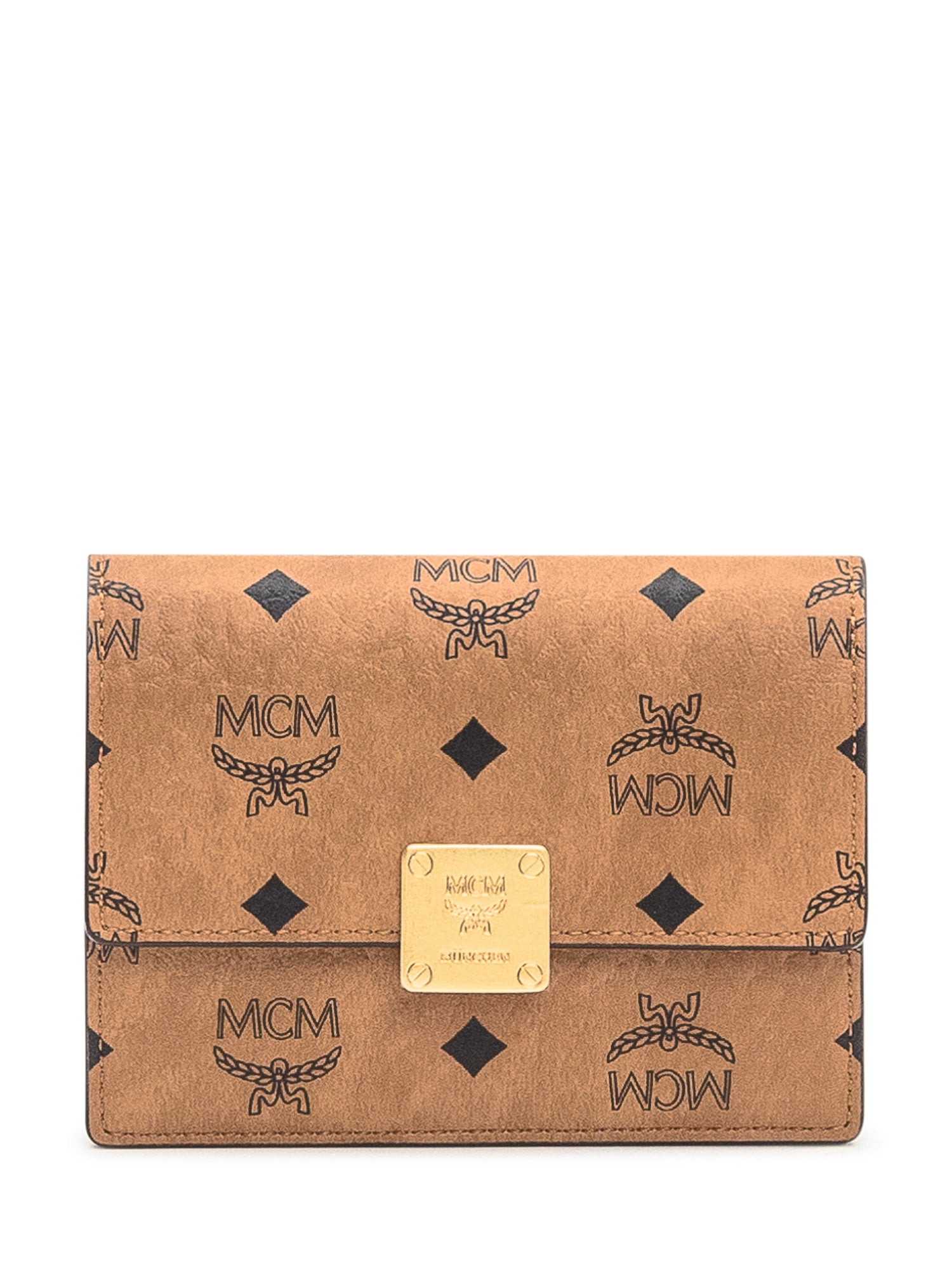 Compact MCM wallet in cognac visetos with snap closure and iconic logo.
