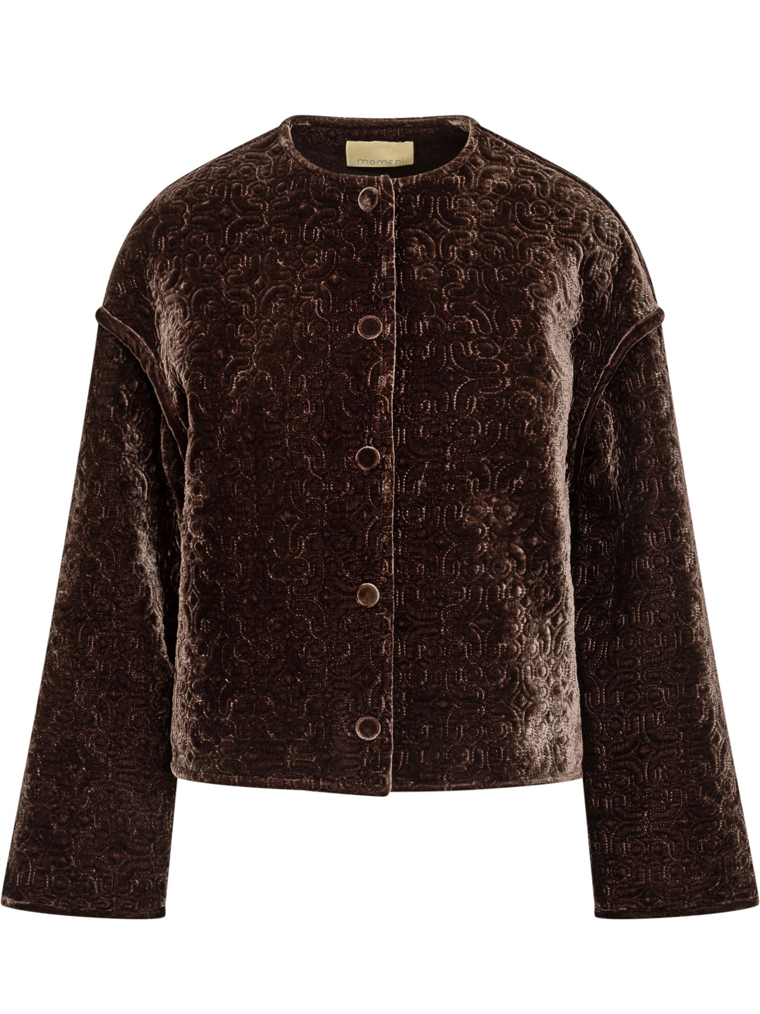 Monom\u00EC brown velvet jacket with jacquard pattern and covered buttons. Elegant and sophisticated, it s the perfect piece to complete refined.
