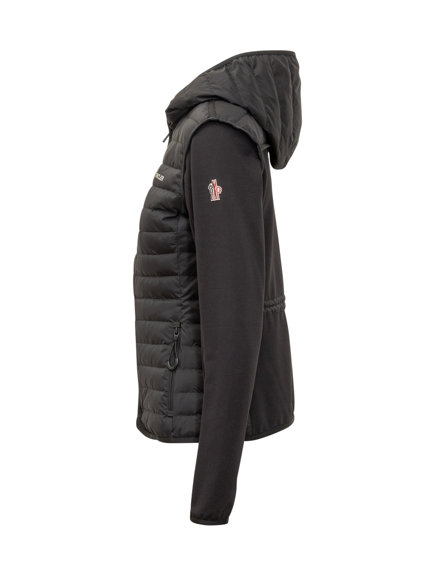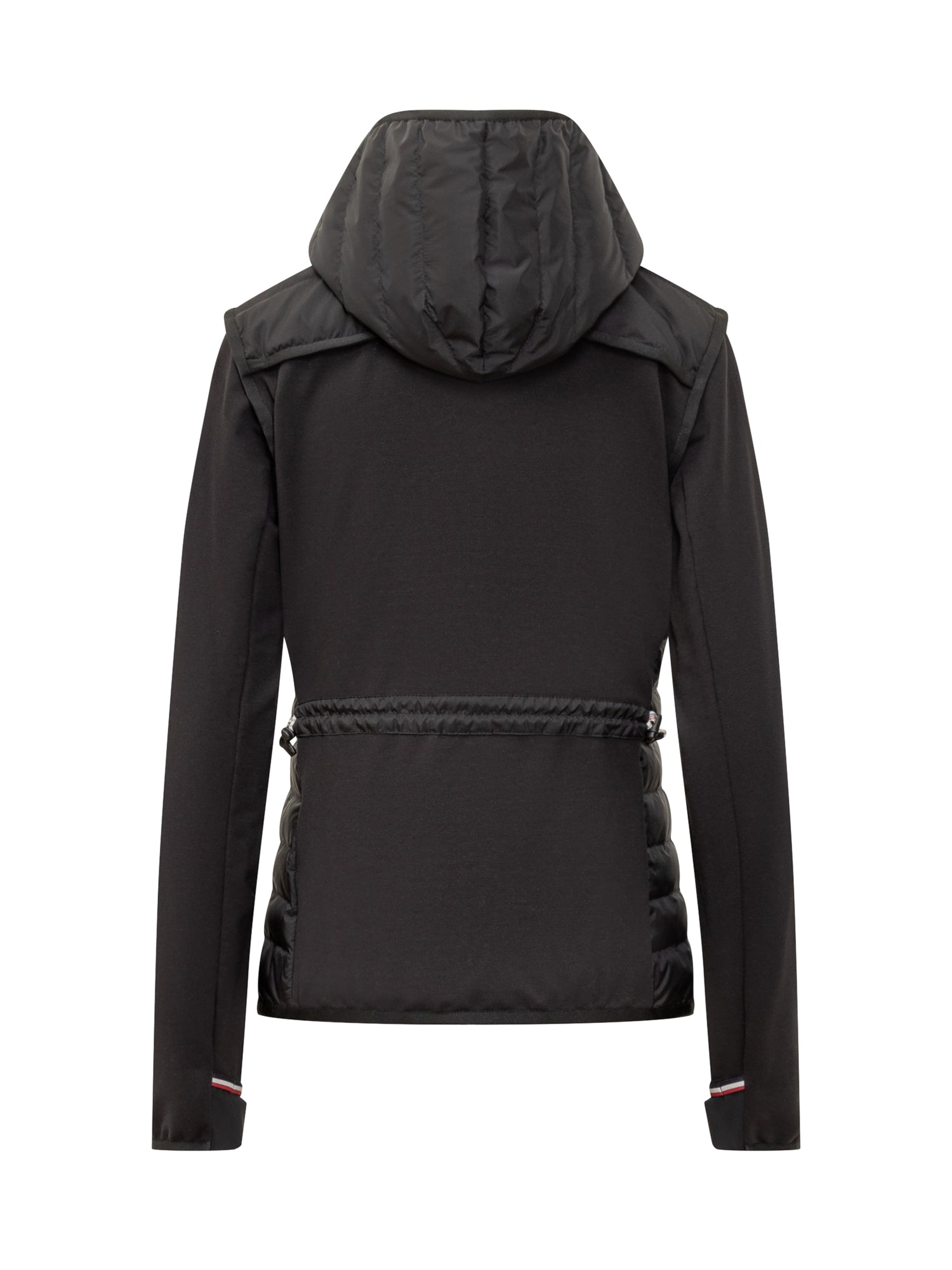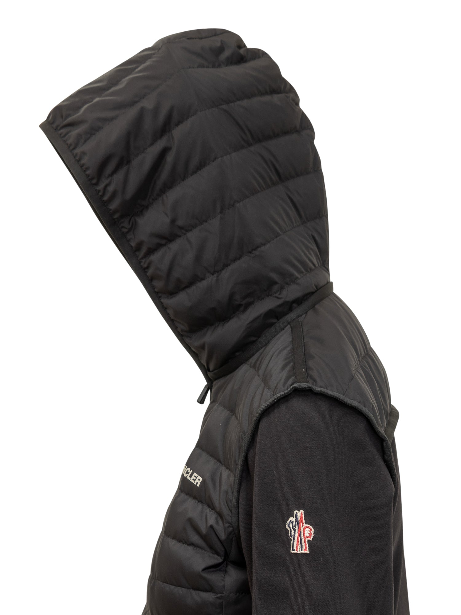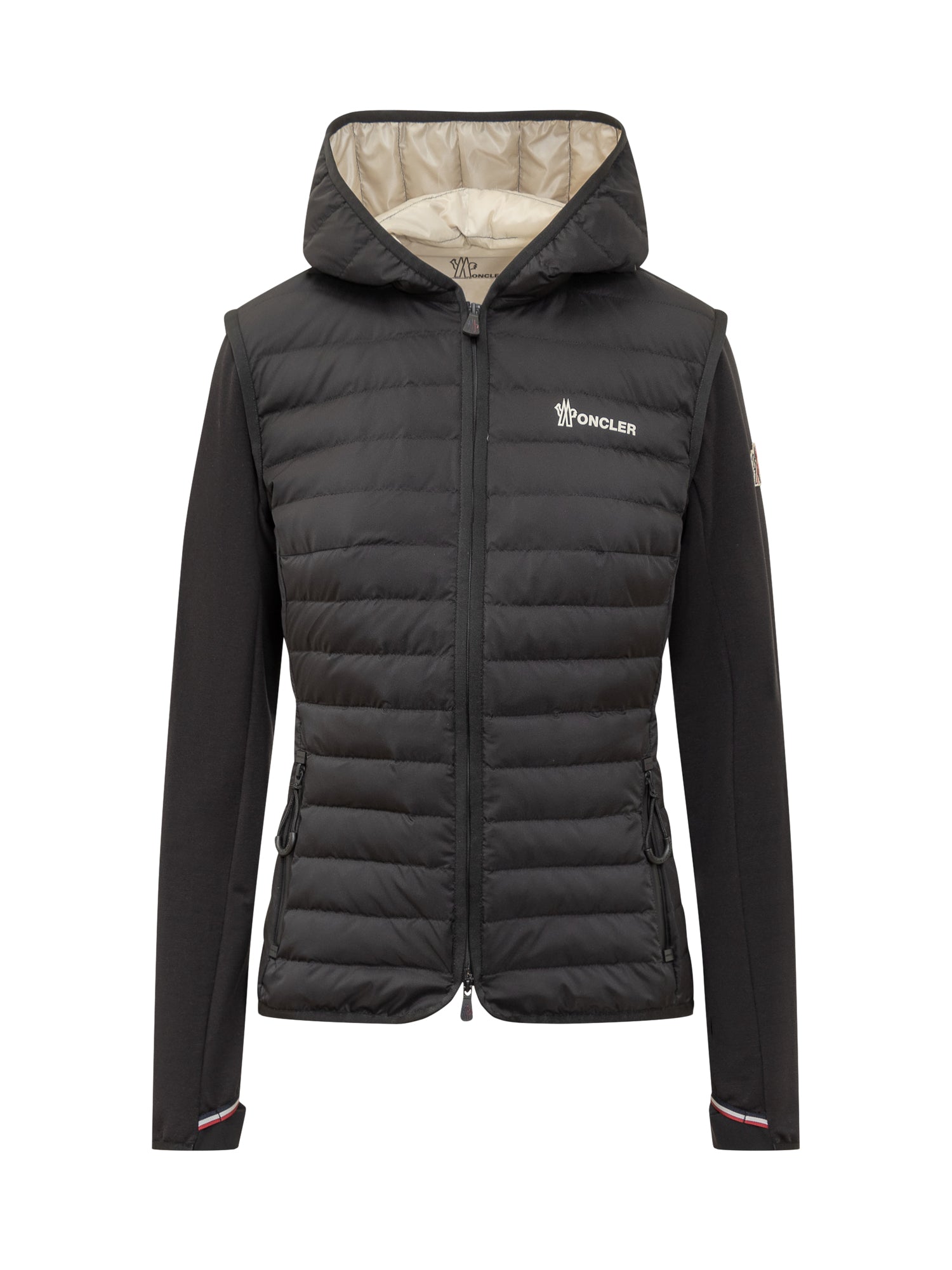 Long-sleeved cardigan with down insert and hood. Zip closure. Drawstring waist. Side pockets with zip. Logo patch on the sleeve. Logo on the chest and back.
