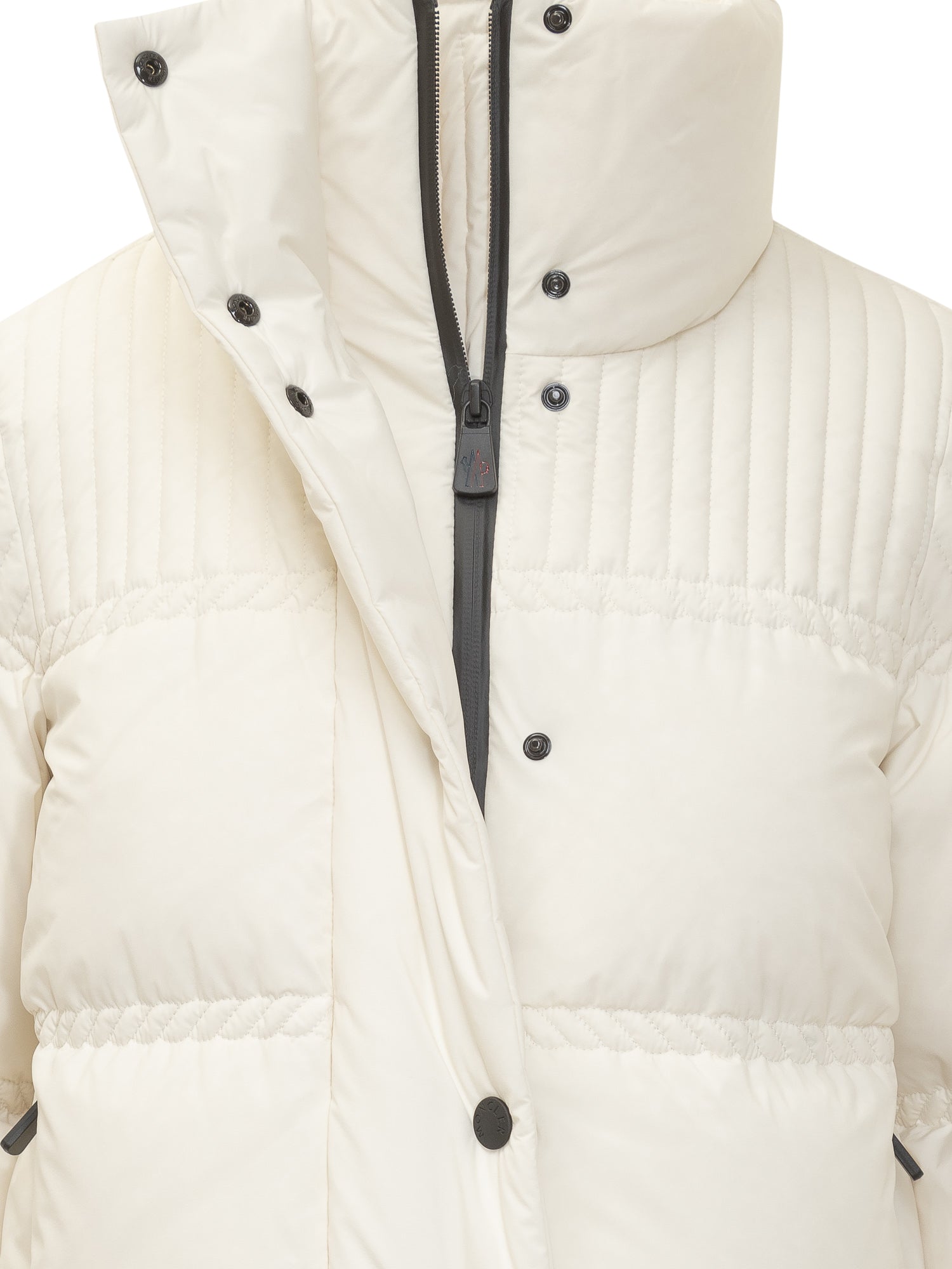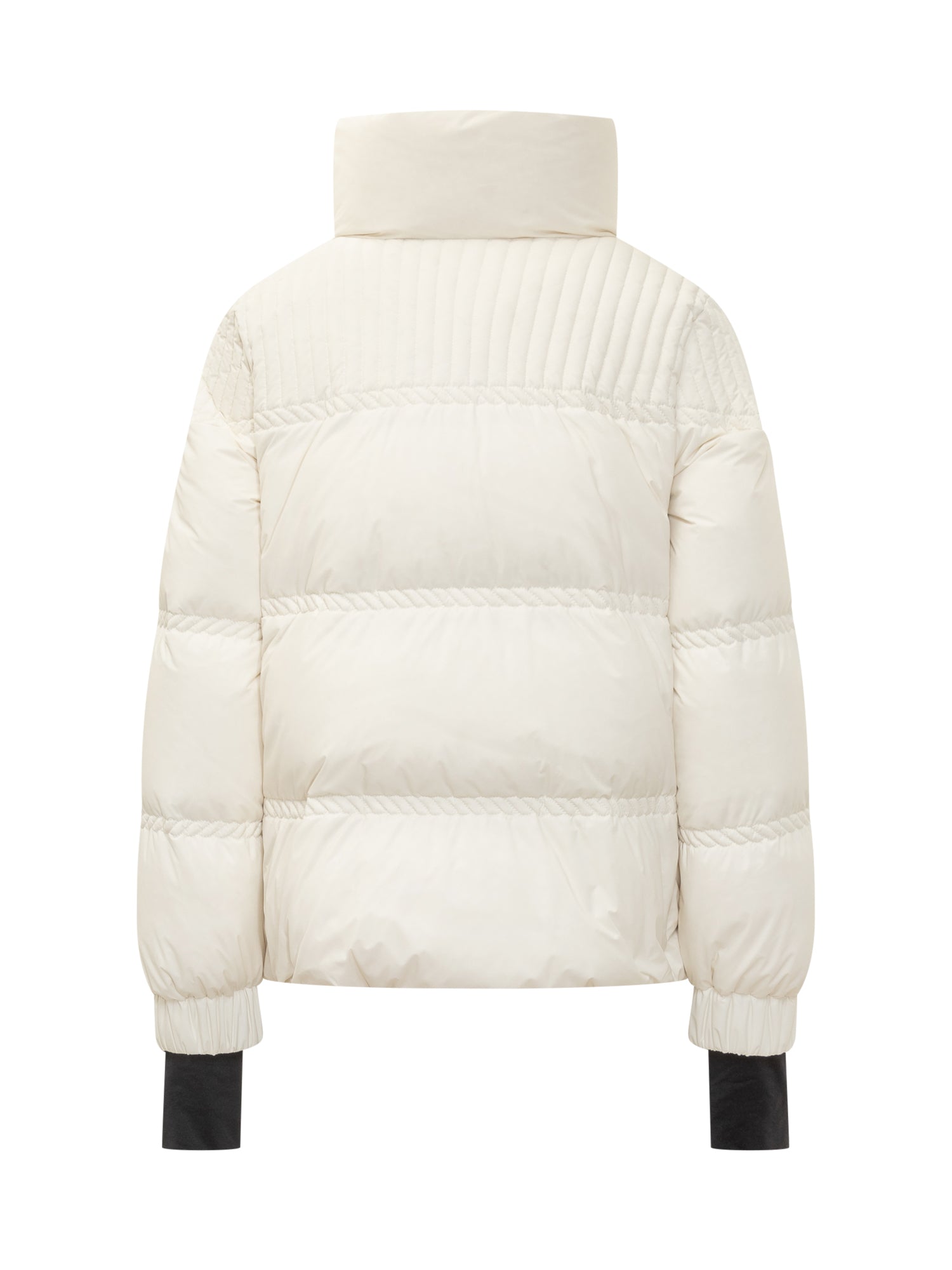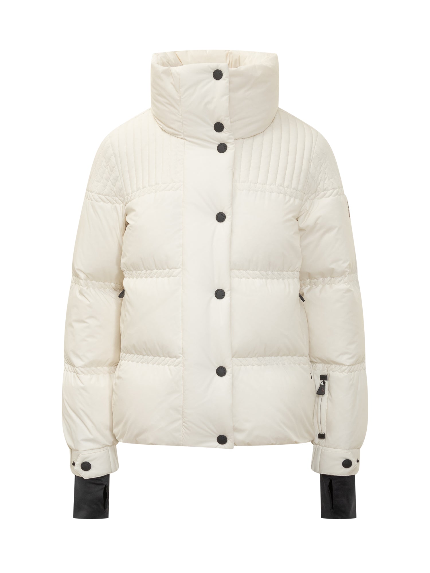 Moncler Grenoble short white down jacket with quilted design and ribbed shoulder details. High collar, button and zip closure, side zip pockets.