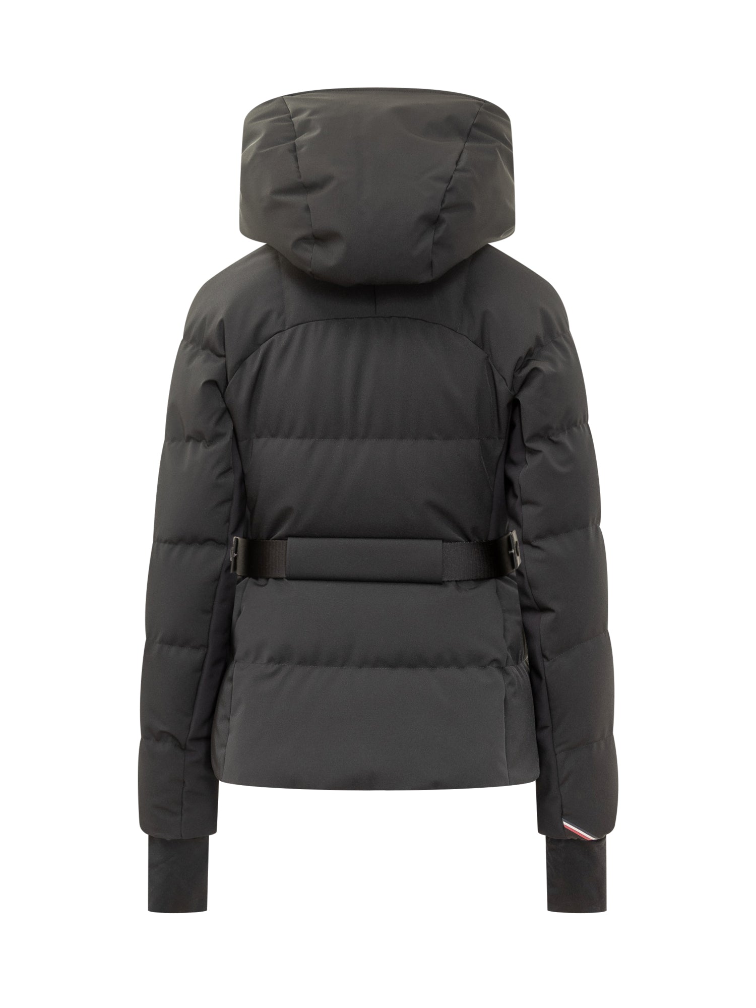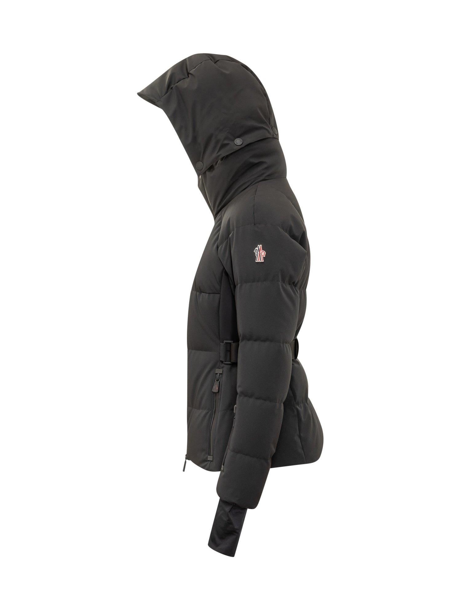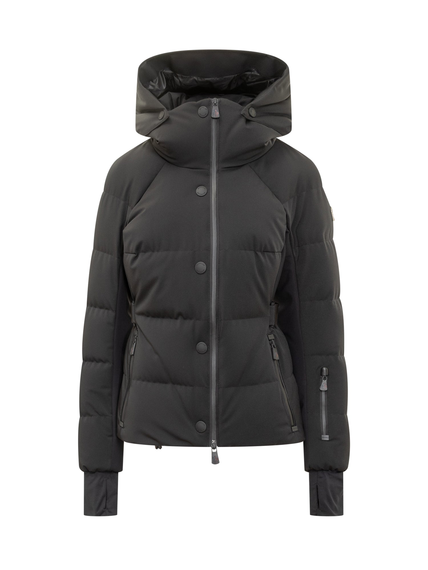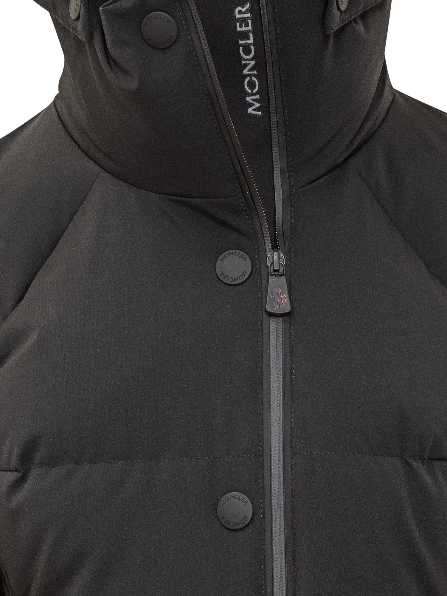 Moncler Grenoble black down jacket featuring wrap-around hood, zip and snap-button closure. Minimal quilting and heat-sealed zip pockets combine technical performance with refined style.