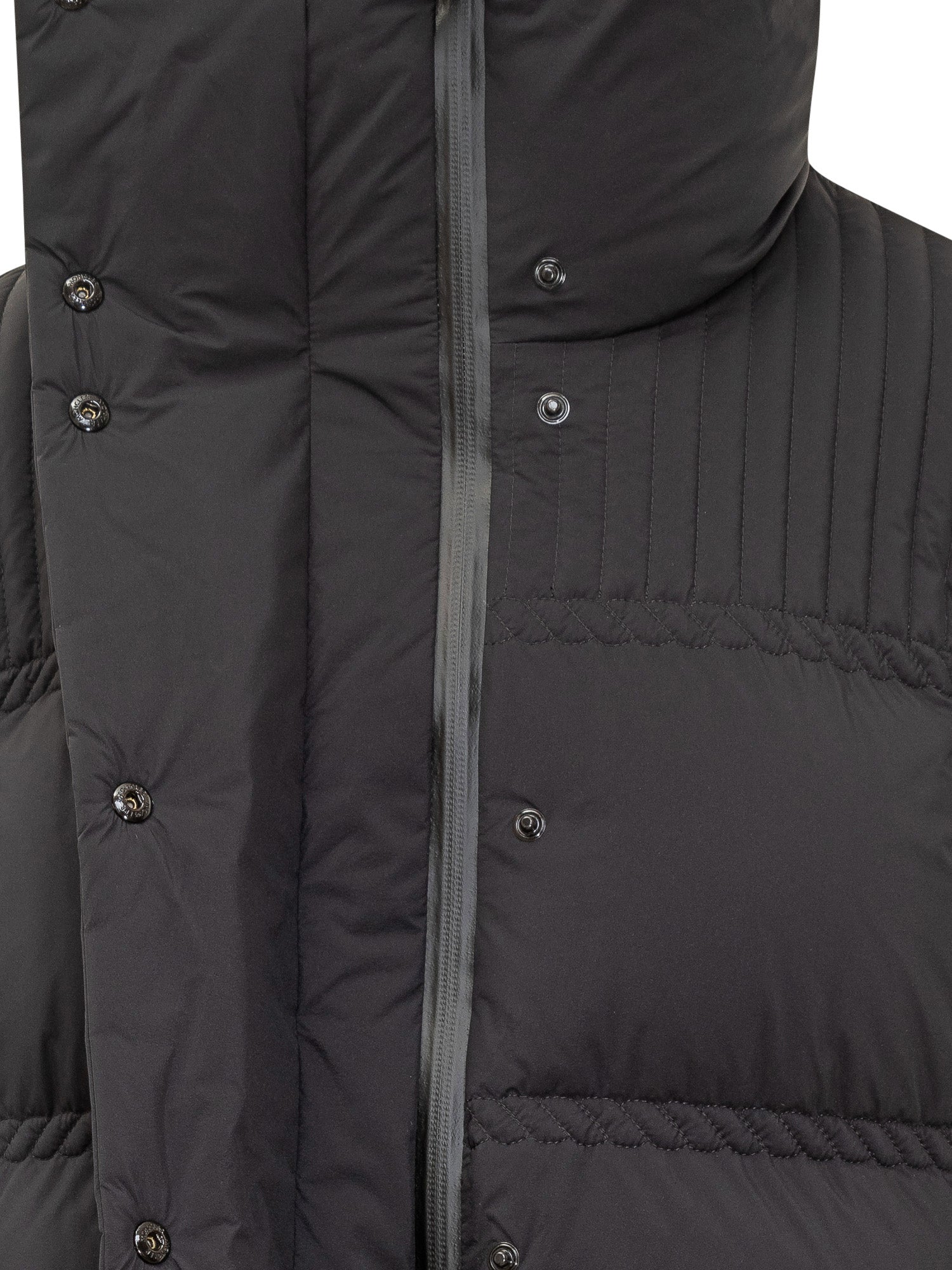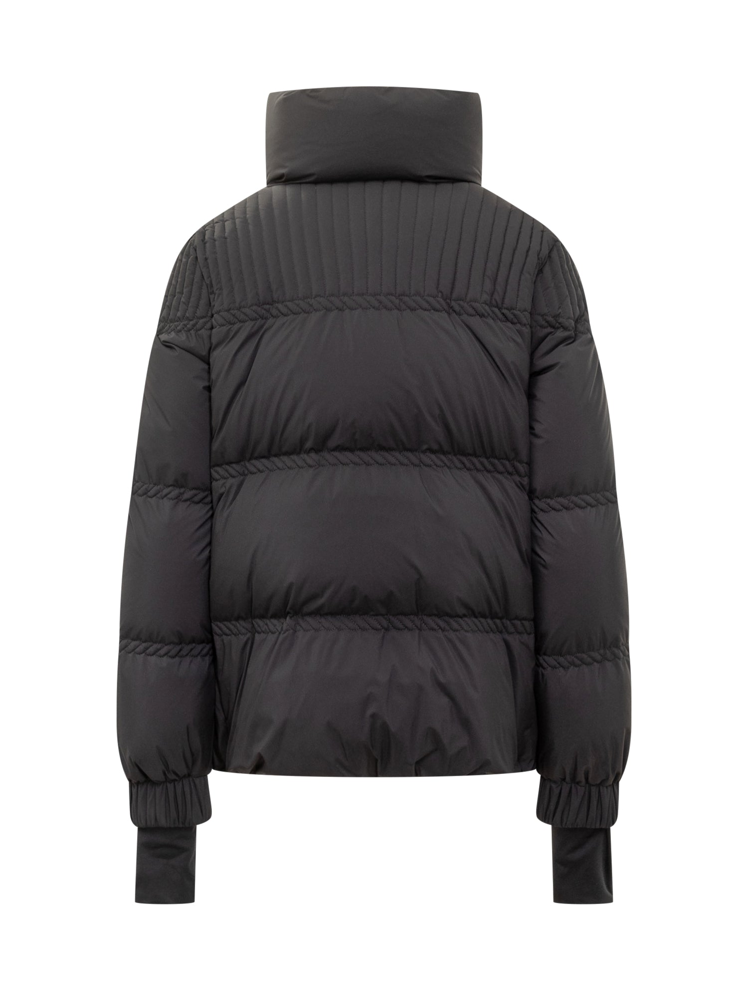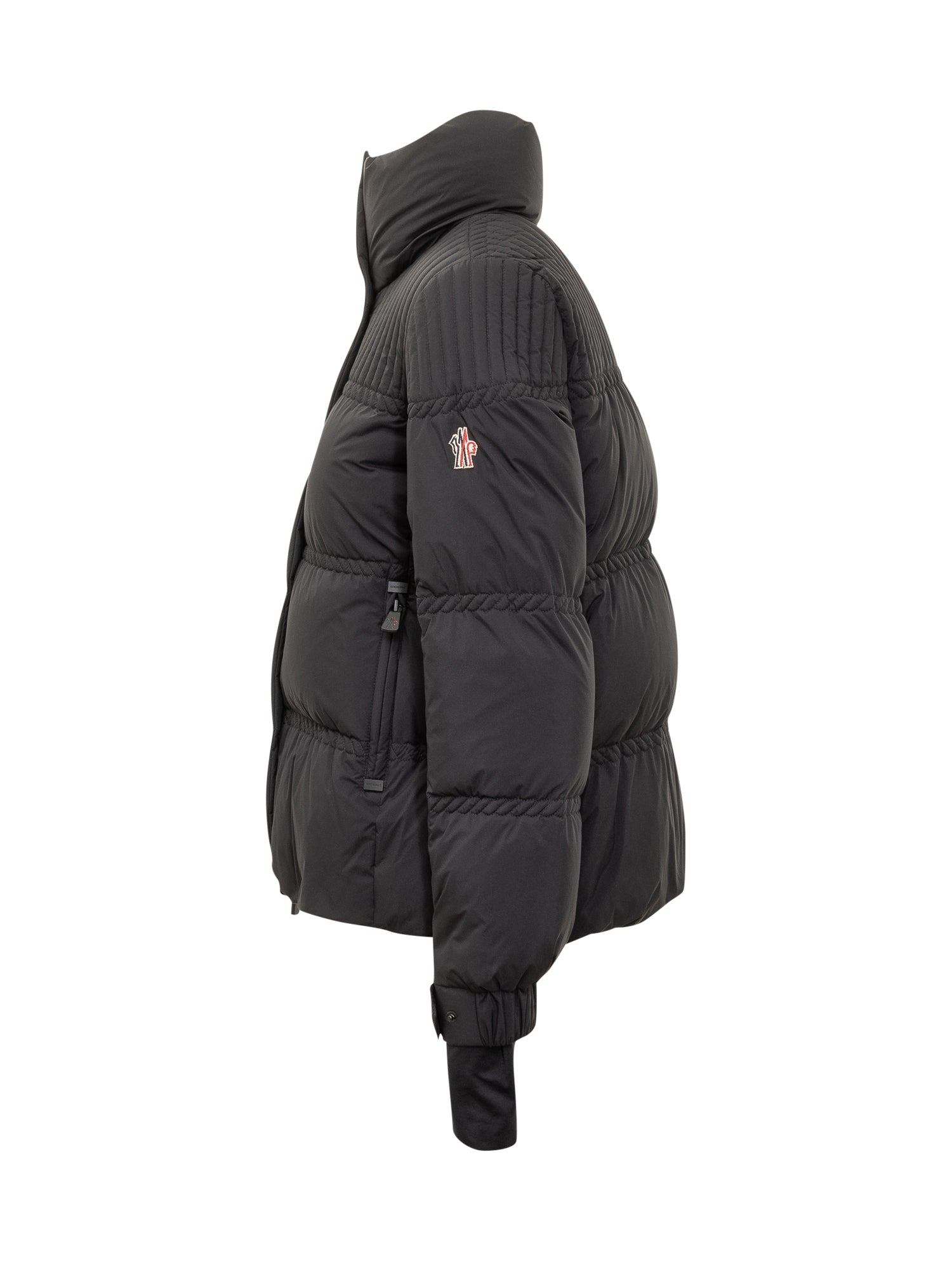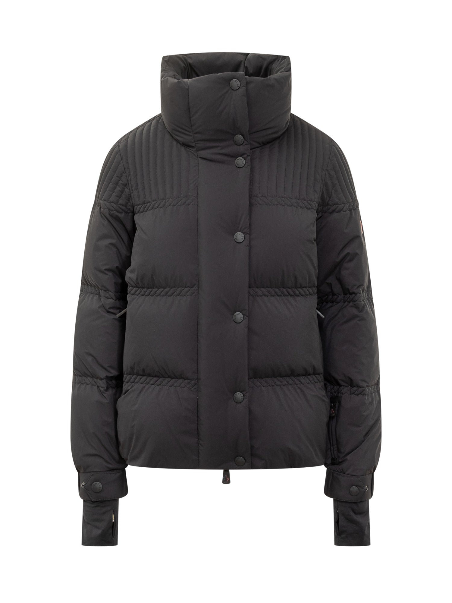 Moncler women s short down jacket in black nylon with geometric quilting. Features high structured collar, snap button closure and side pockets.