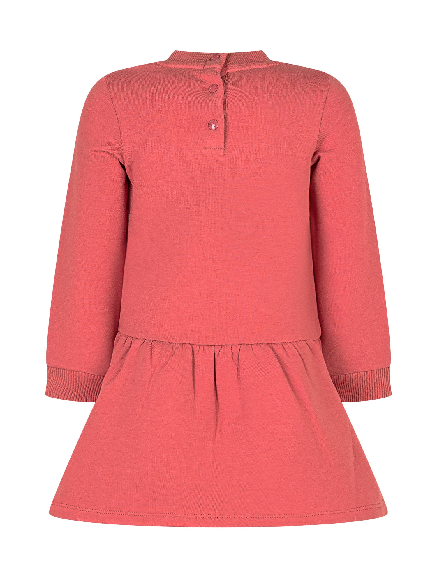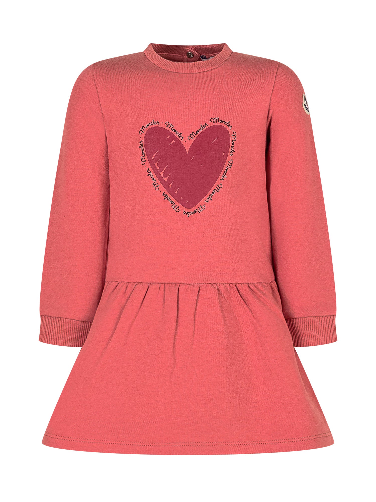 Pink long-sleeve dress featuring a central heart outlined by Moncler logo. Flared skirt and back button closure.