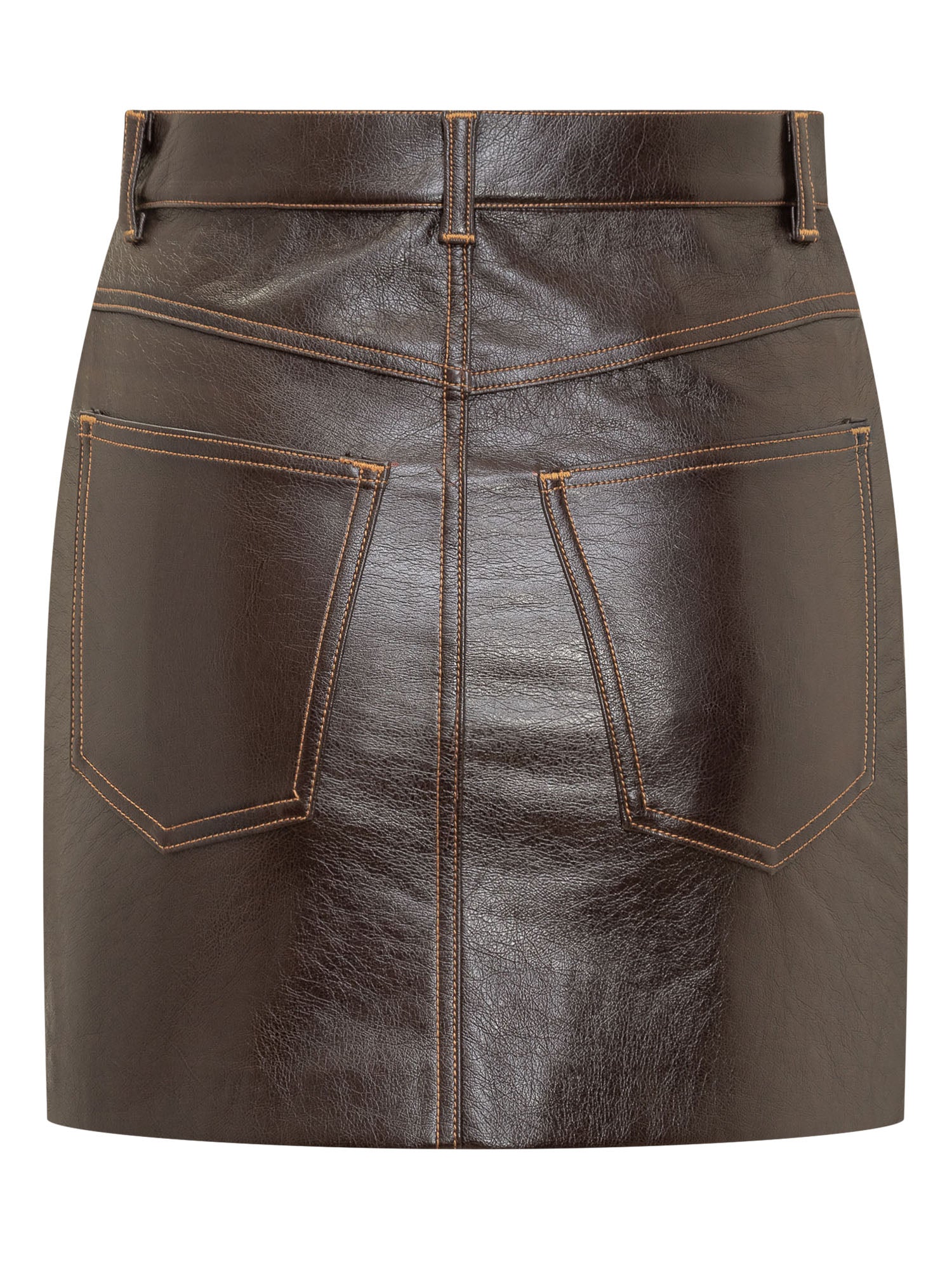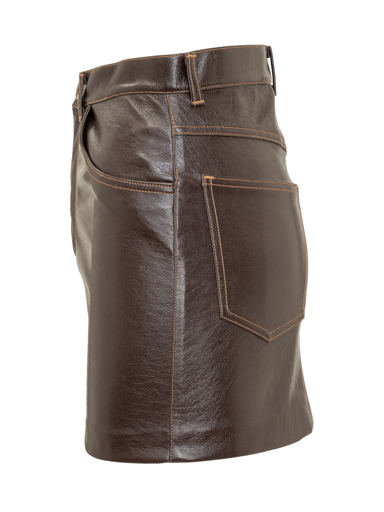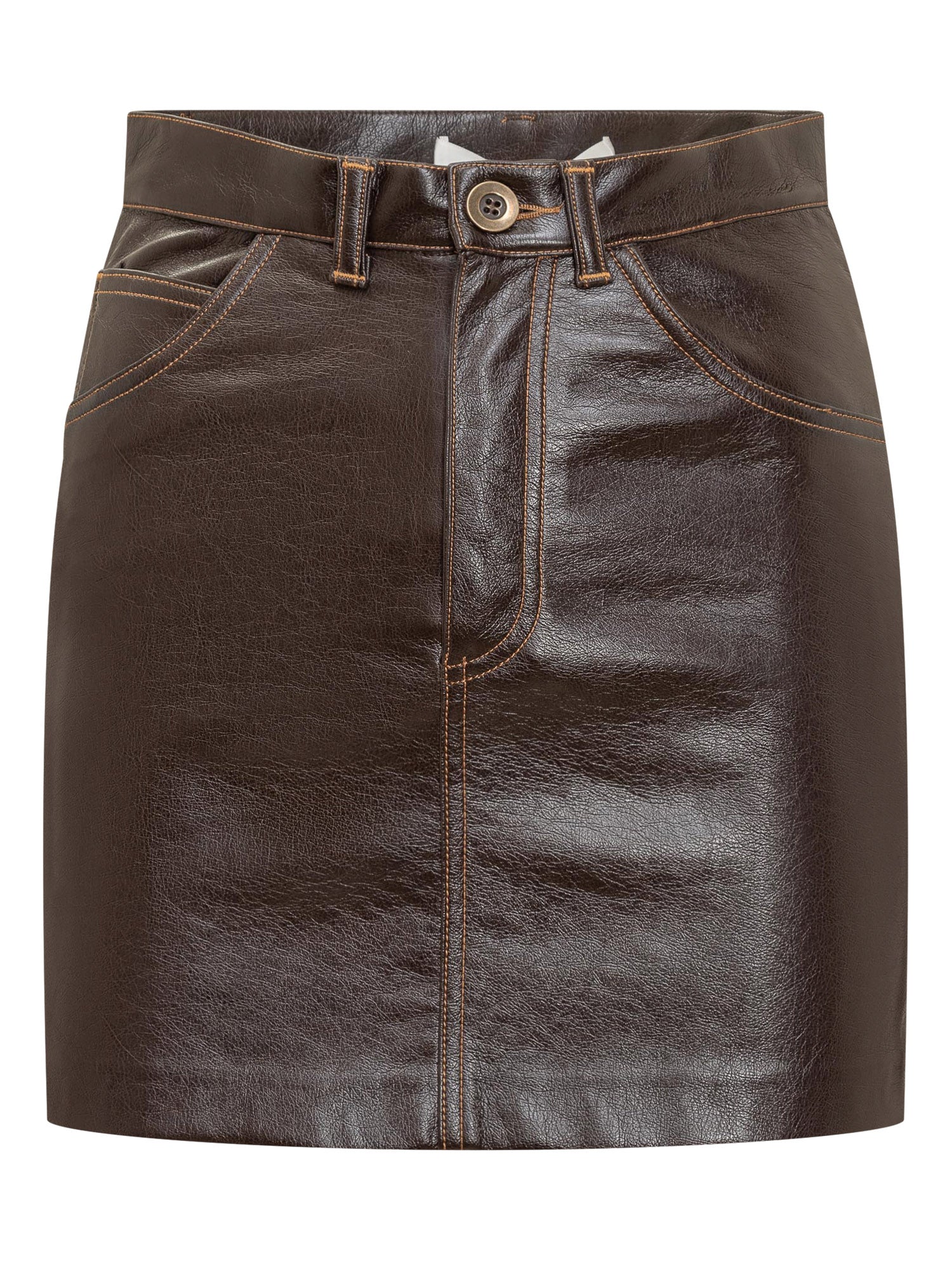 Faux leather miniskirt. Button and zipper closure. Belt loops. Five pockets. Contrasting embroidery detail.