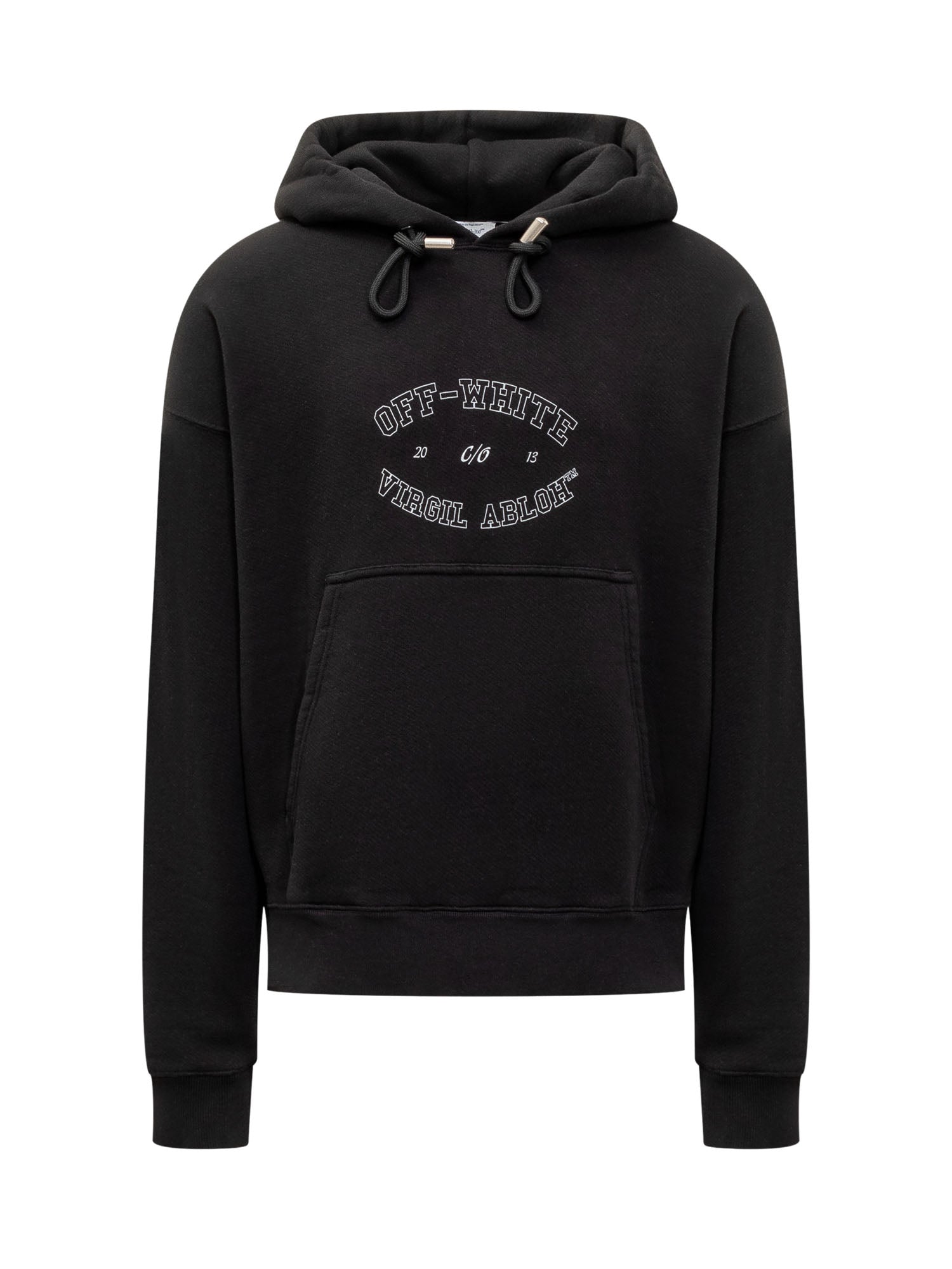 Cotton long sleeve hoodie. Drawstring hood. Ribbed hems. Maxi front pocket. Off White college-style logo printed on the front.