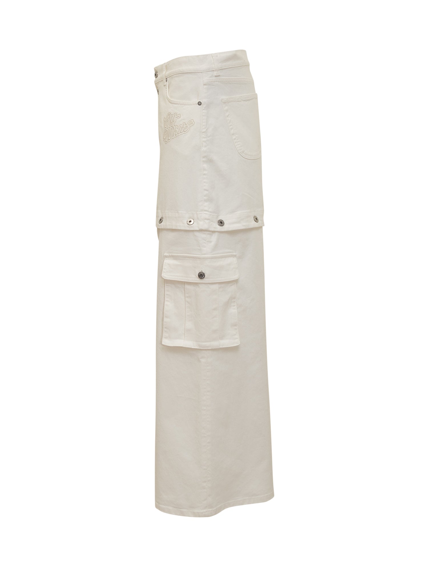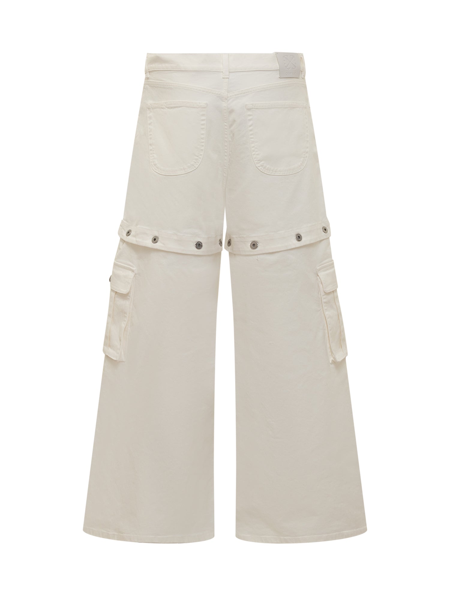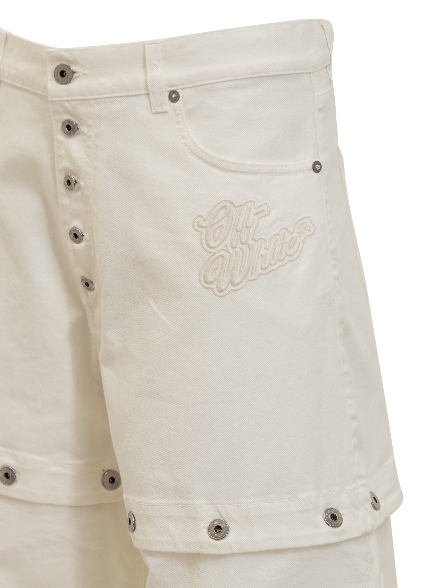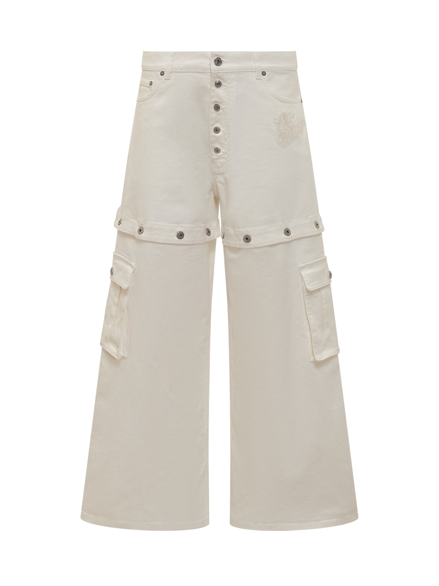 White jeans. Baggy fit. Five pockets. Wide leg. Button closure. Embroidered Off White logo. Button details on legs. Cargo pockets at sides.