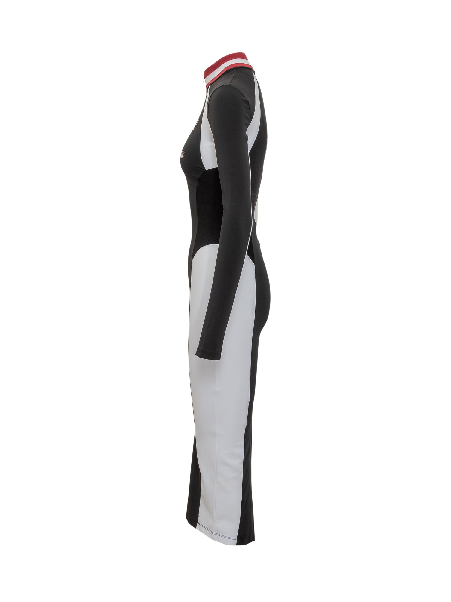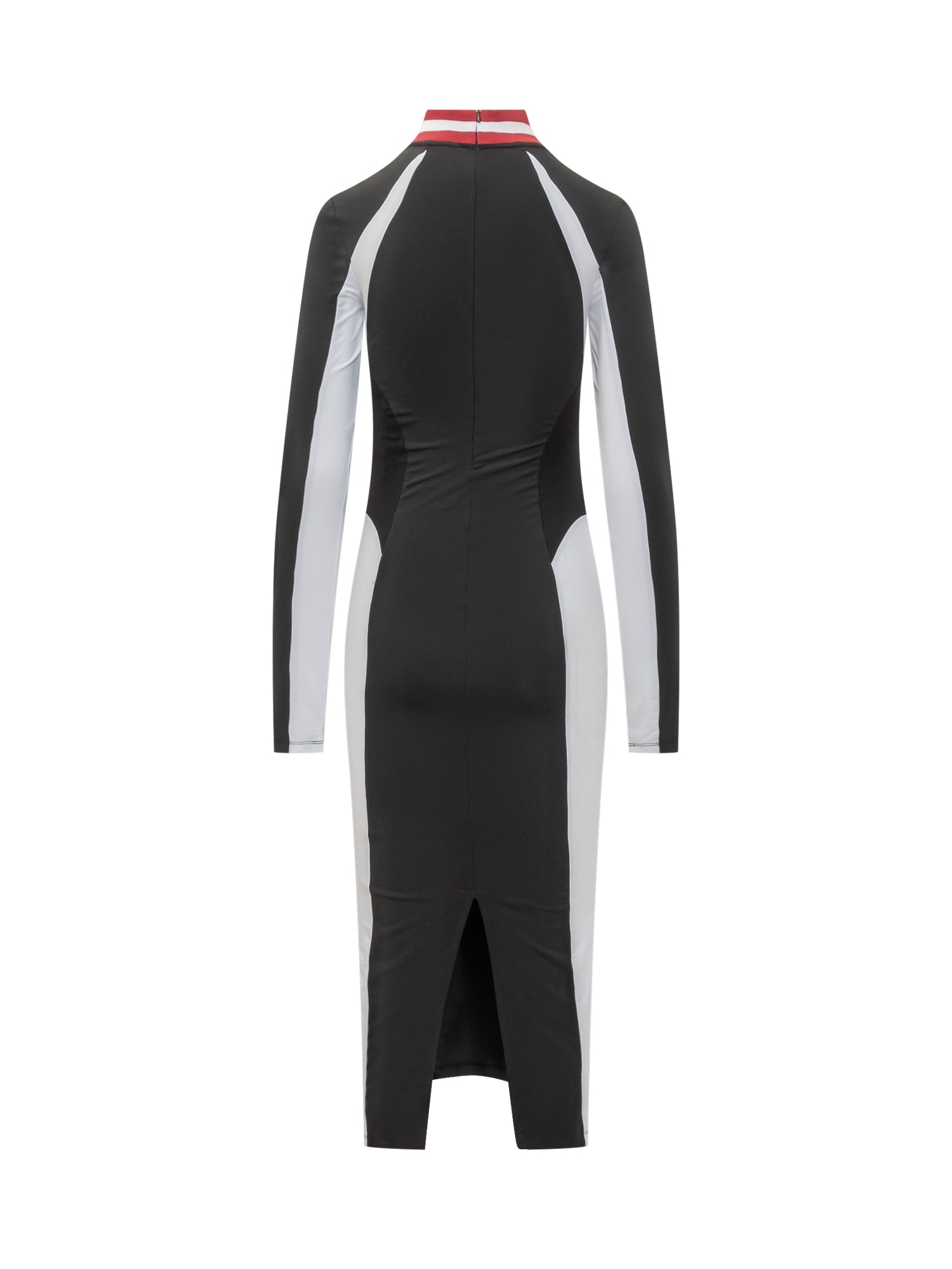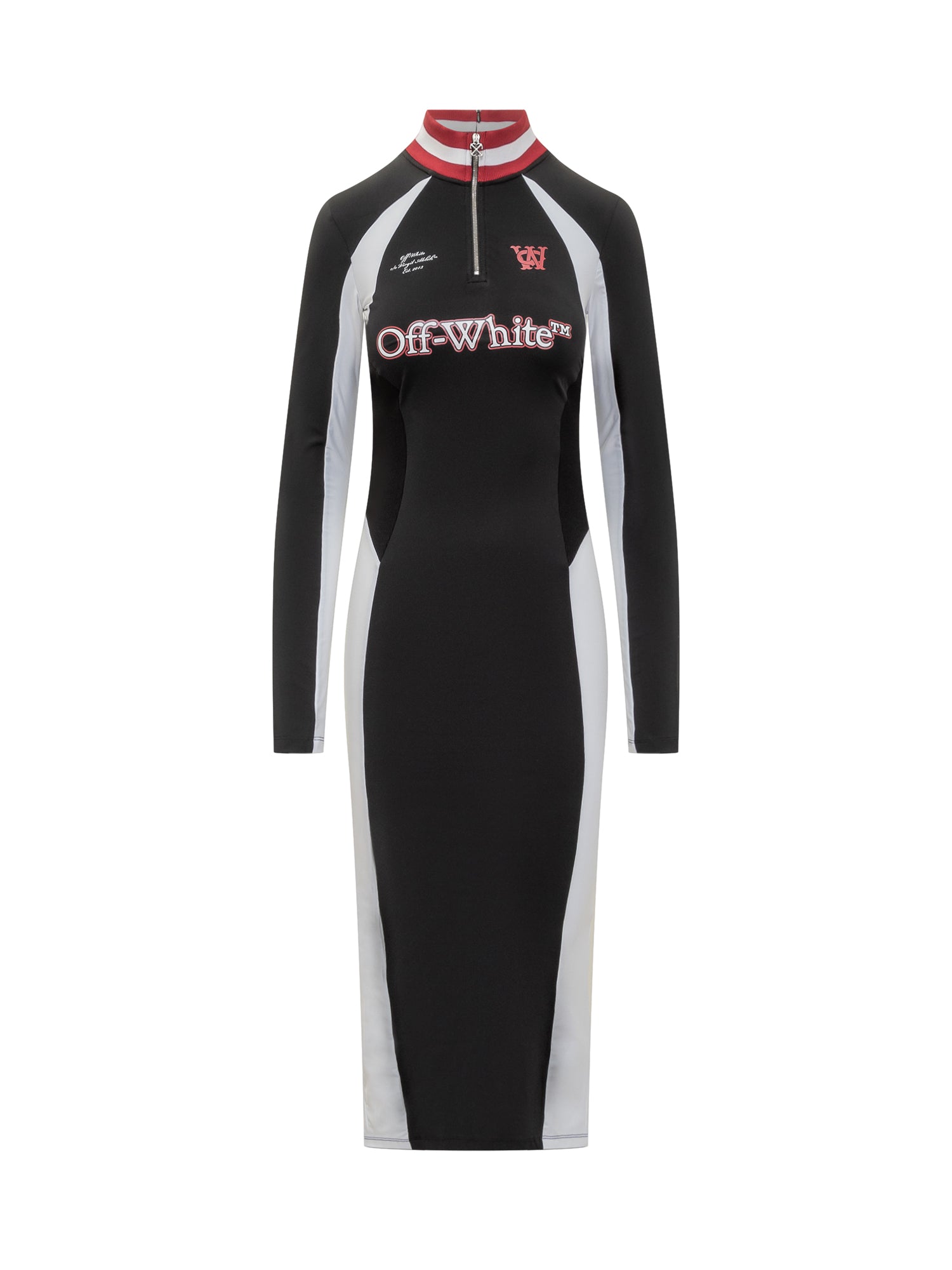 Off-White black midi dress in technical fabric with long sleeves, white side bands, high neck with zip and front logo.