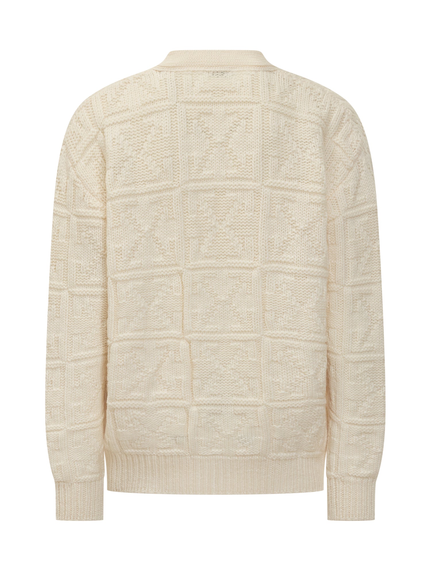 Off-White white wool cardigan featuring knitted pattern and contrasting Arrow logo.