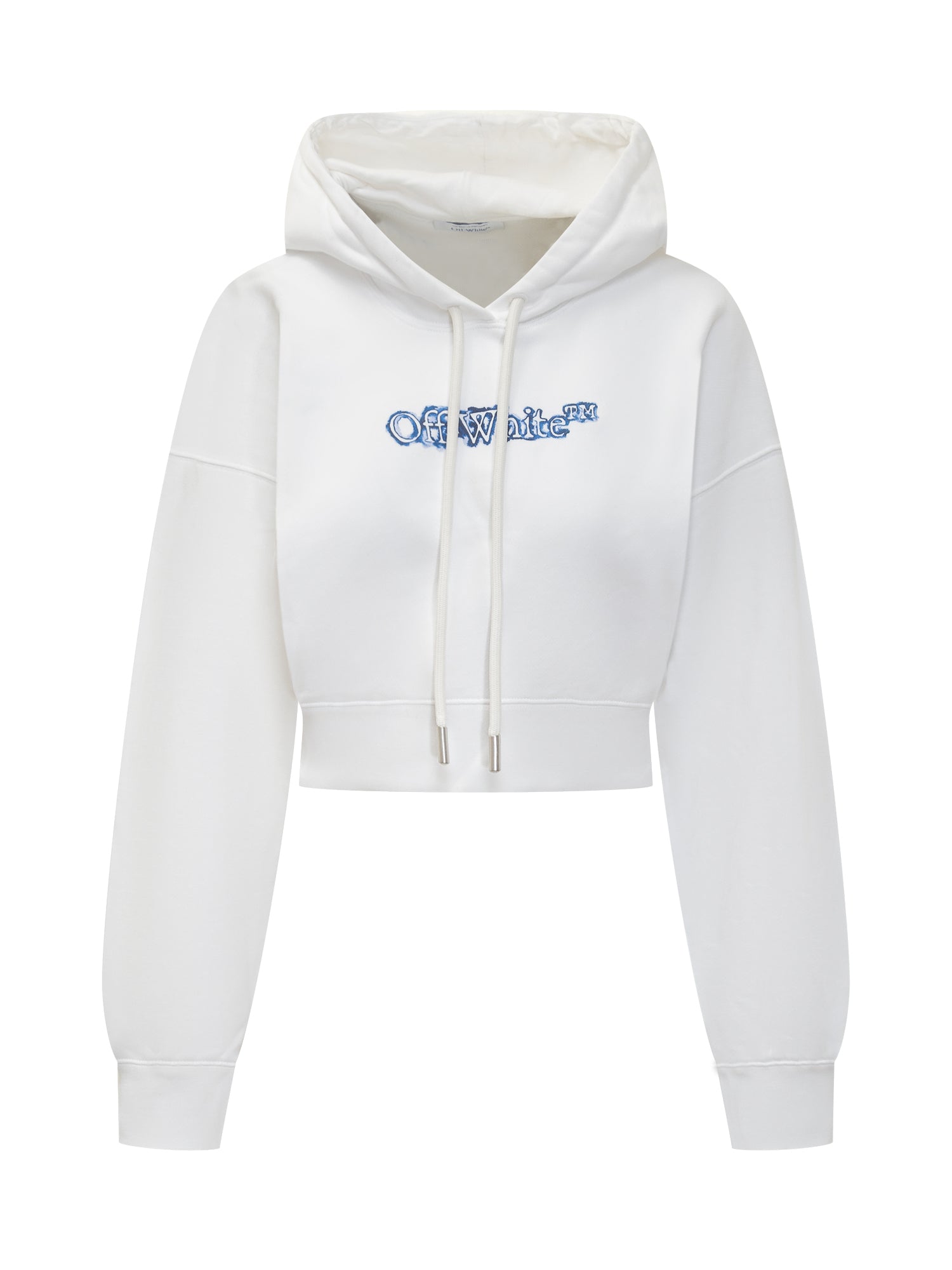 Off-White white cotton cropped hoodie featuring a drawstring hood and light blue embroidered logo on the chest.