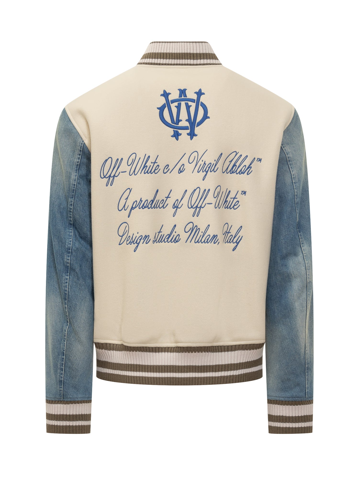 Off-White varsity jacket in wool with denim sleeves and ribbed details. Gothic logo embroidered on the chest and snap button closure.