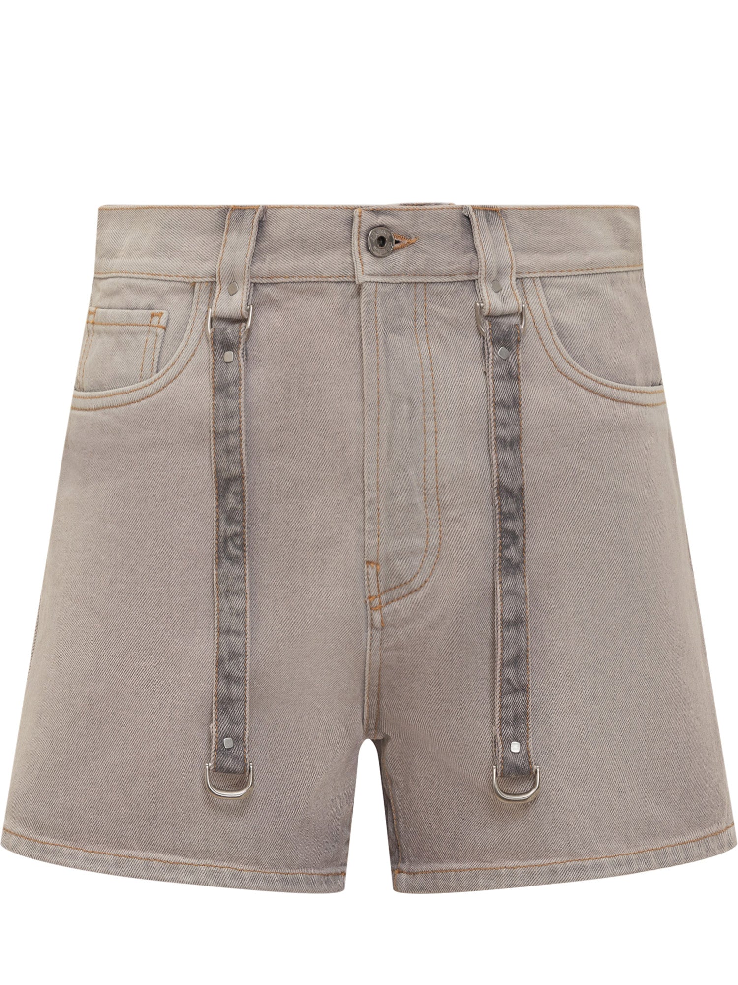 Cargo shorts in colorful denim. Five pockets. Belt loops. Button closure. Buckled loops at front.