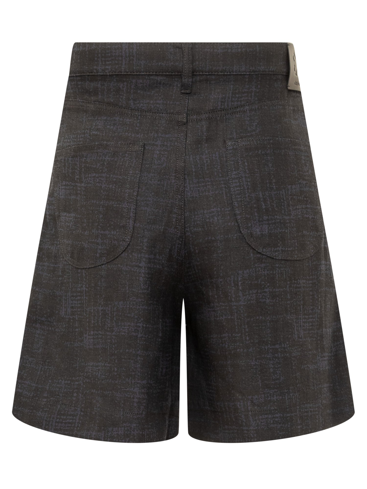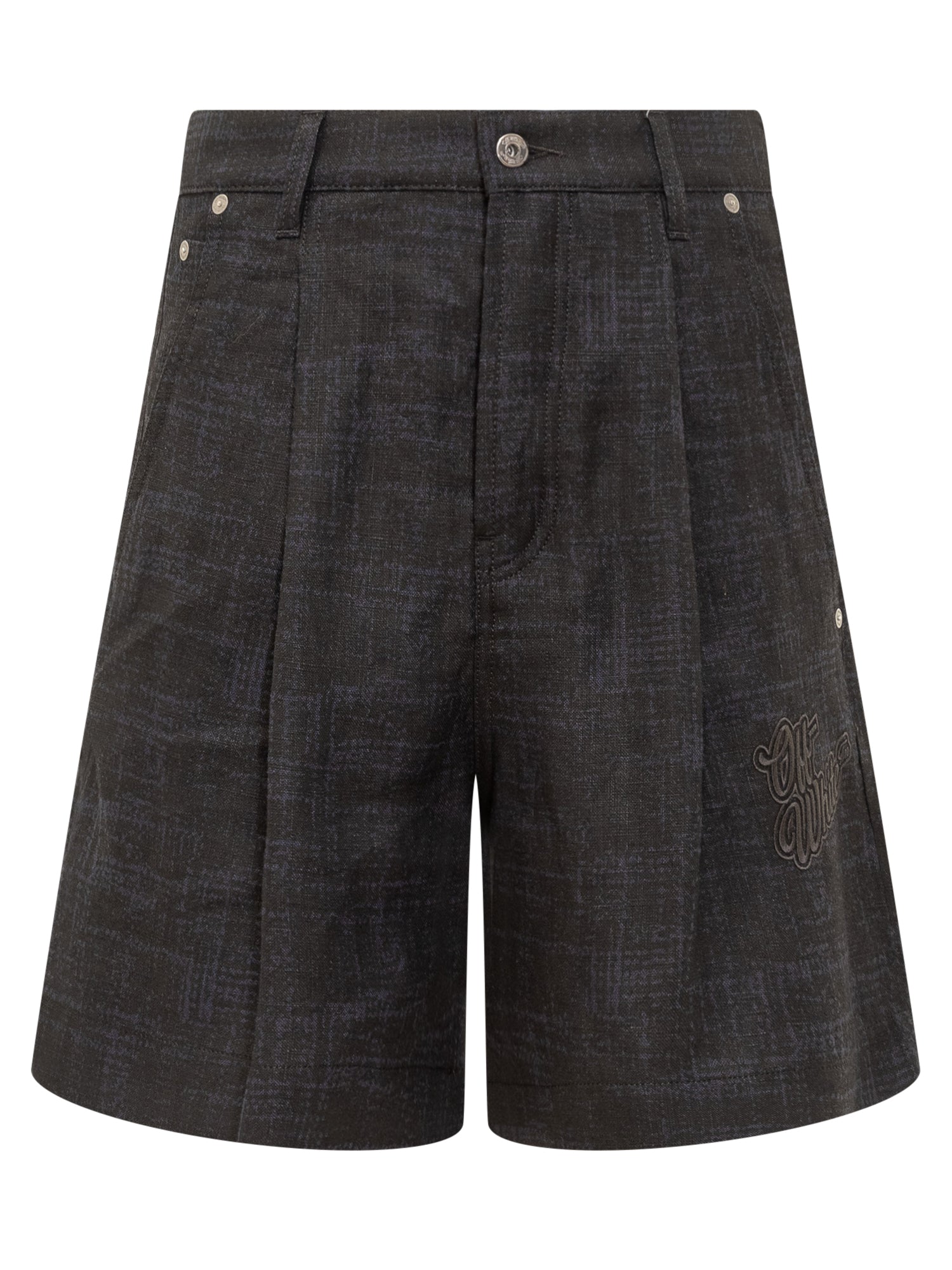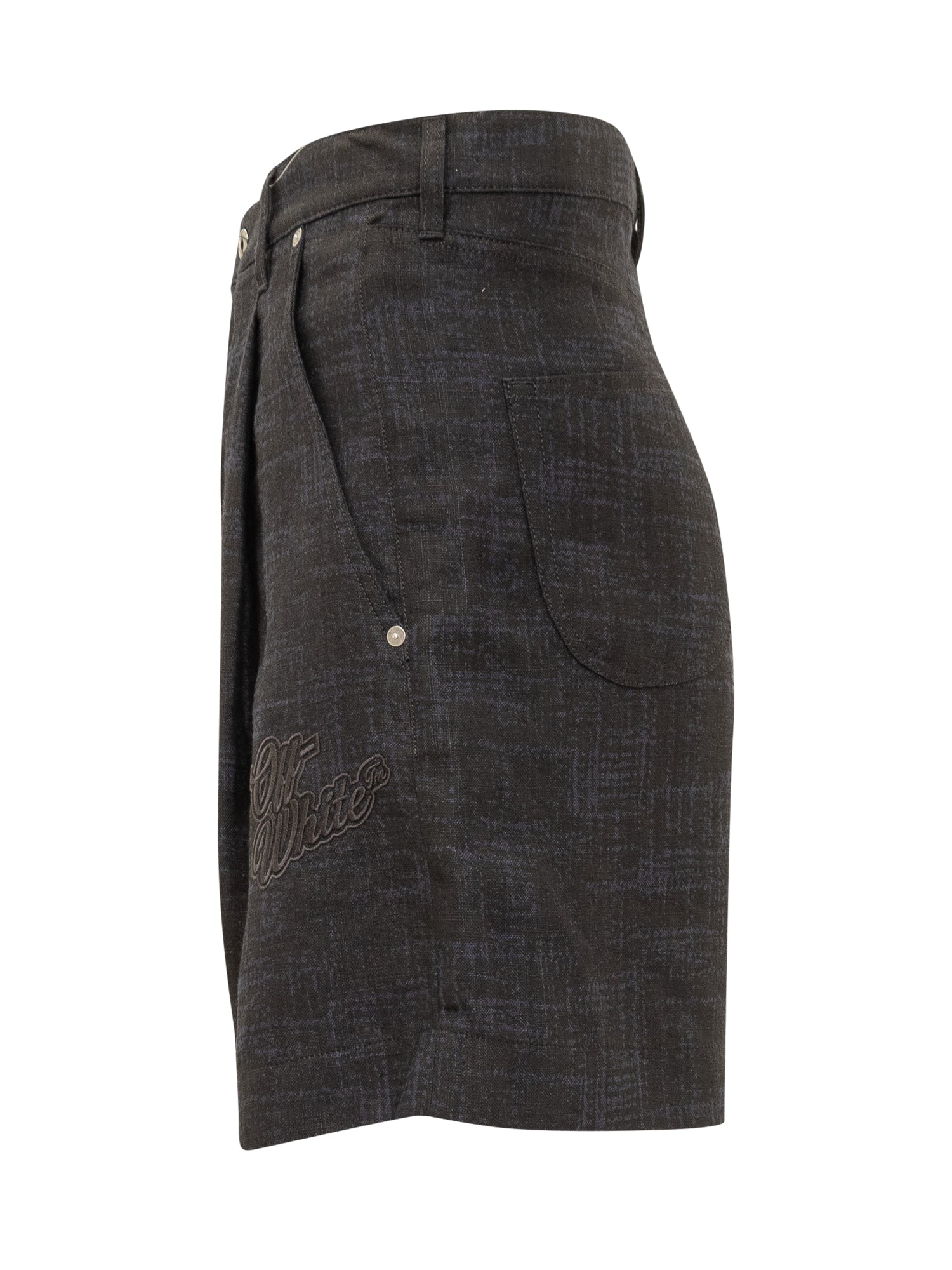 Linen shorts. Button closure. Belt loops. Five pockets. Pleats at front. Off-White logo patch on the front. All-over Tweed effect.