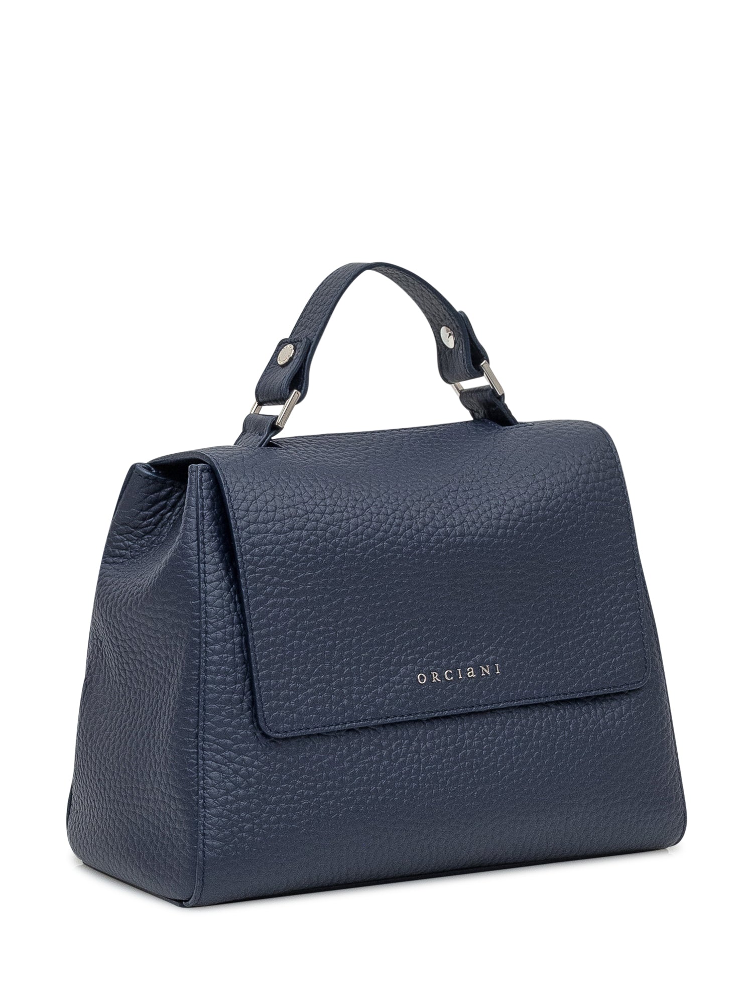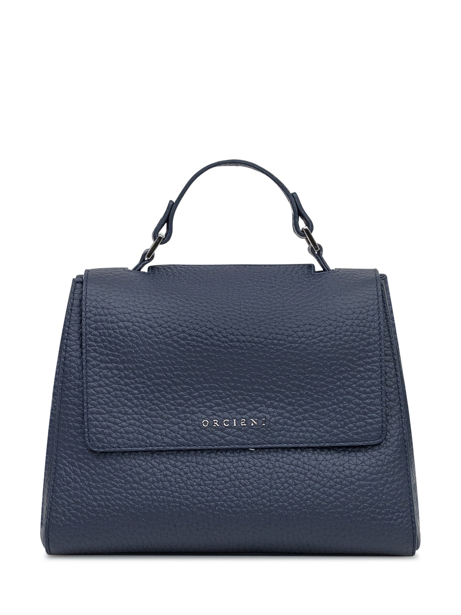 Orciani bag in textured blue leather with top handle and flap closure.