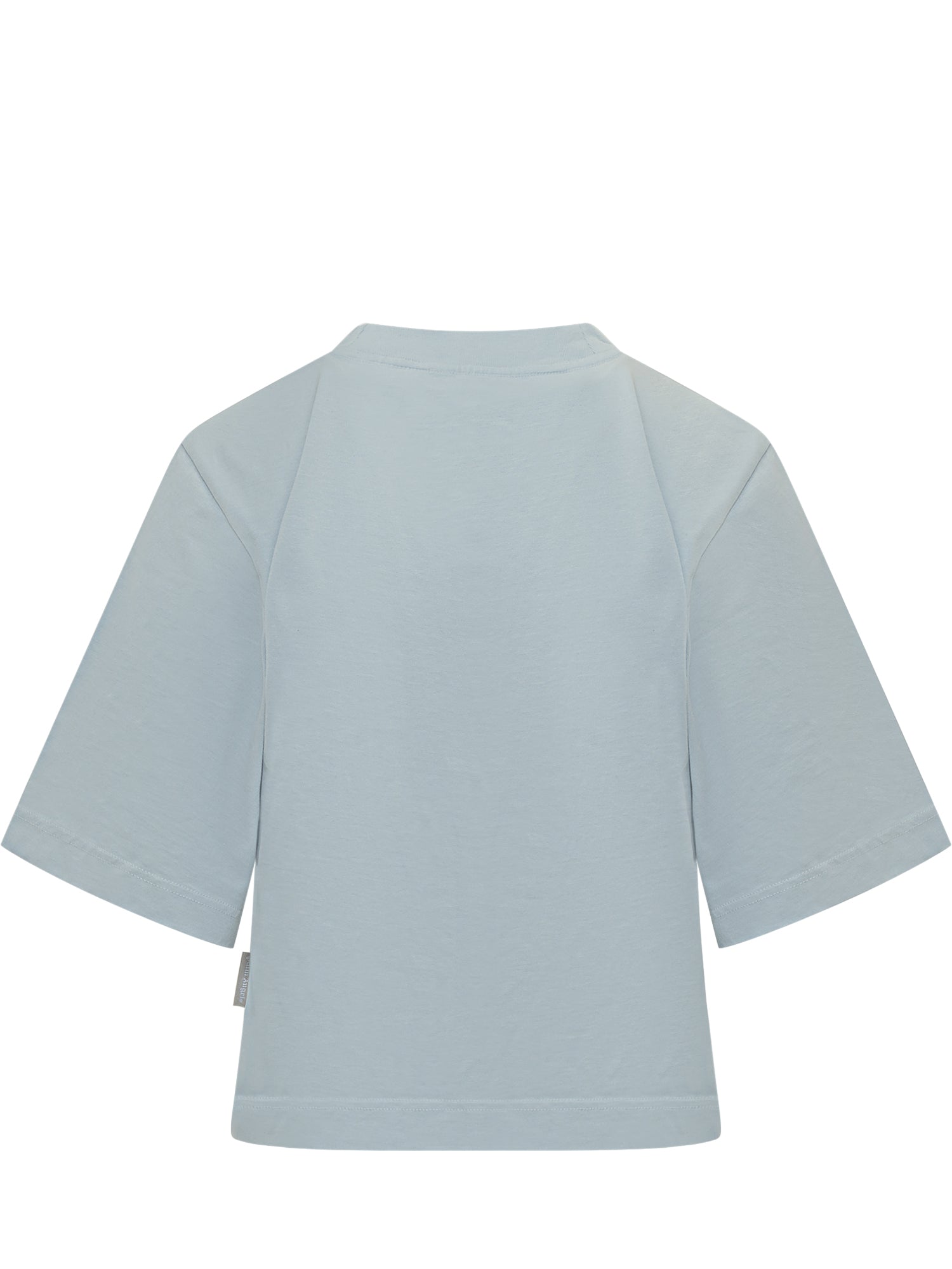 Palm Angels light blue cotton T-shirt featuring a teddy print and Bear in Mind lettering. Boxy crewneck design with short sleeves.