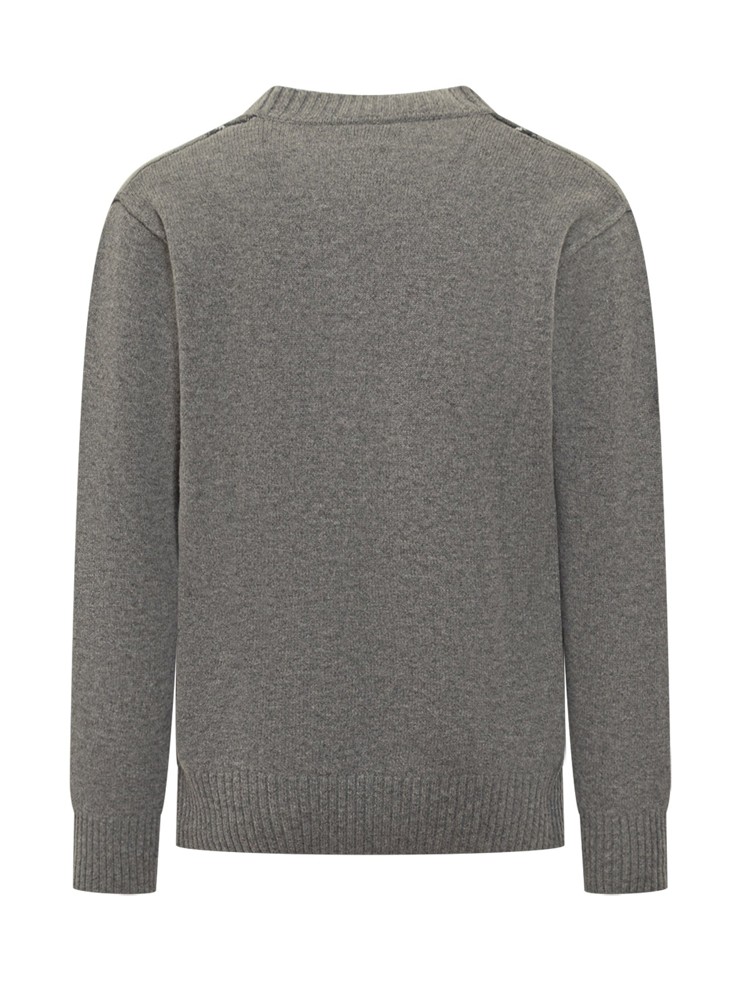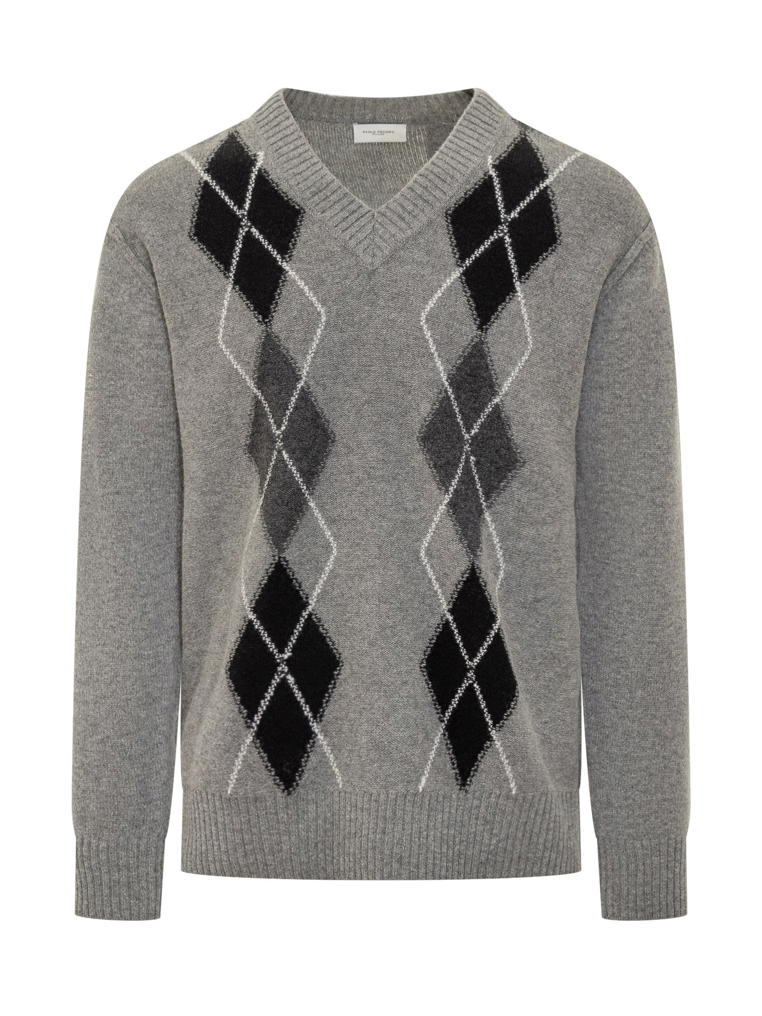 Paolo Pecora grey wool sweater featuring a classic black and white argyle pattern. V-neck and ribbed trims.