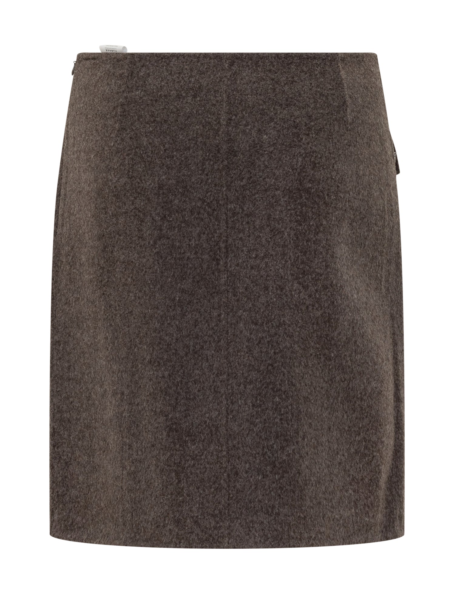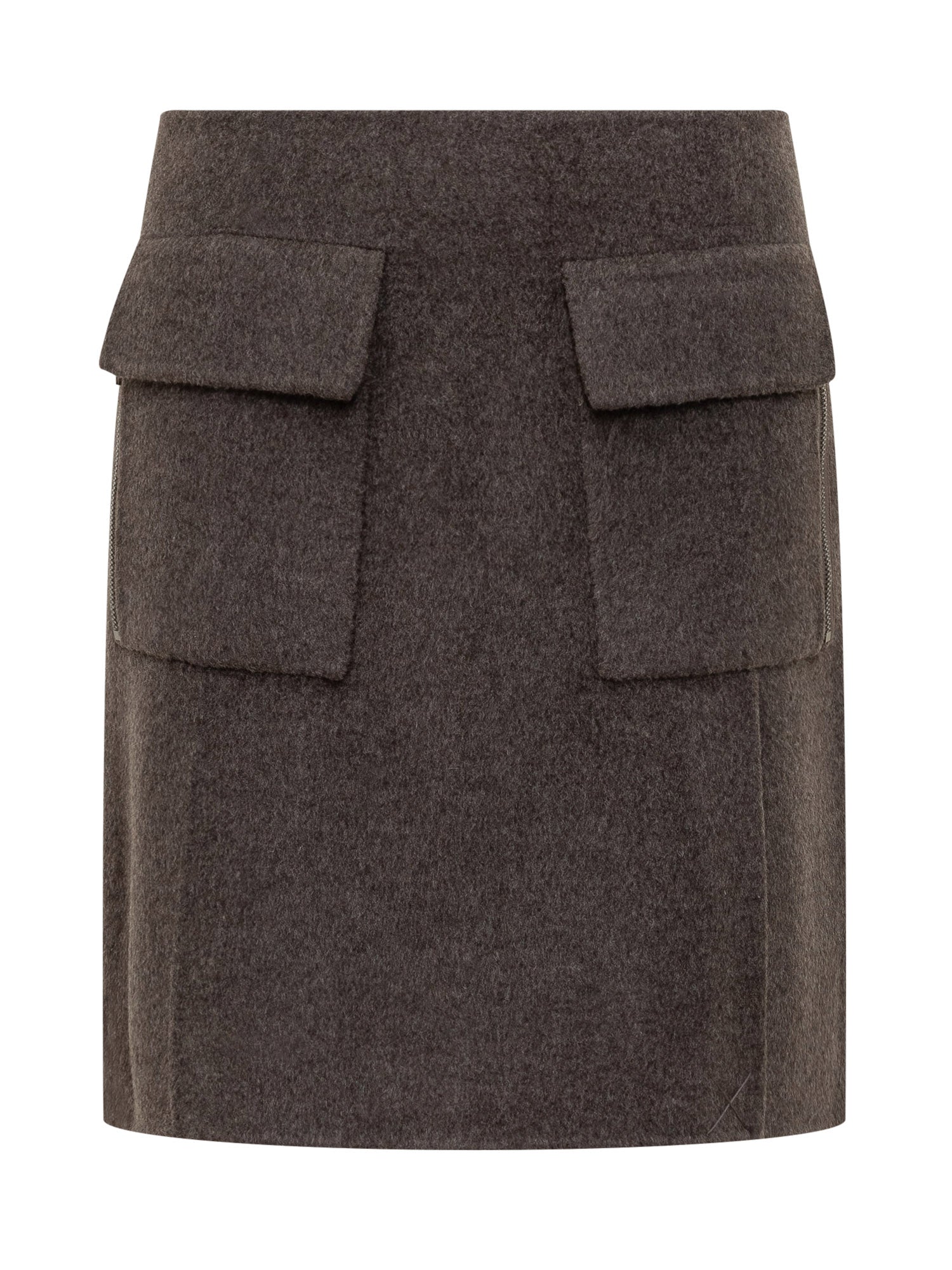 P.A.R.O.S.H. grey wool mini skirt with front flap pockets. Structured and modern design, ideal for winter urban and casual-chic outfits.