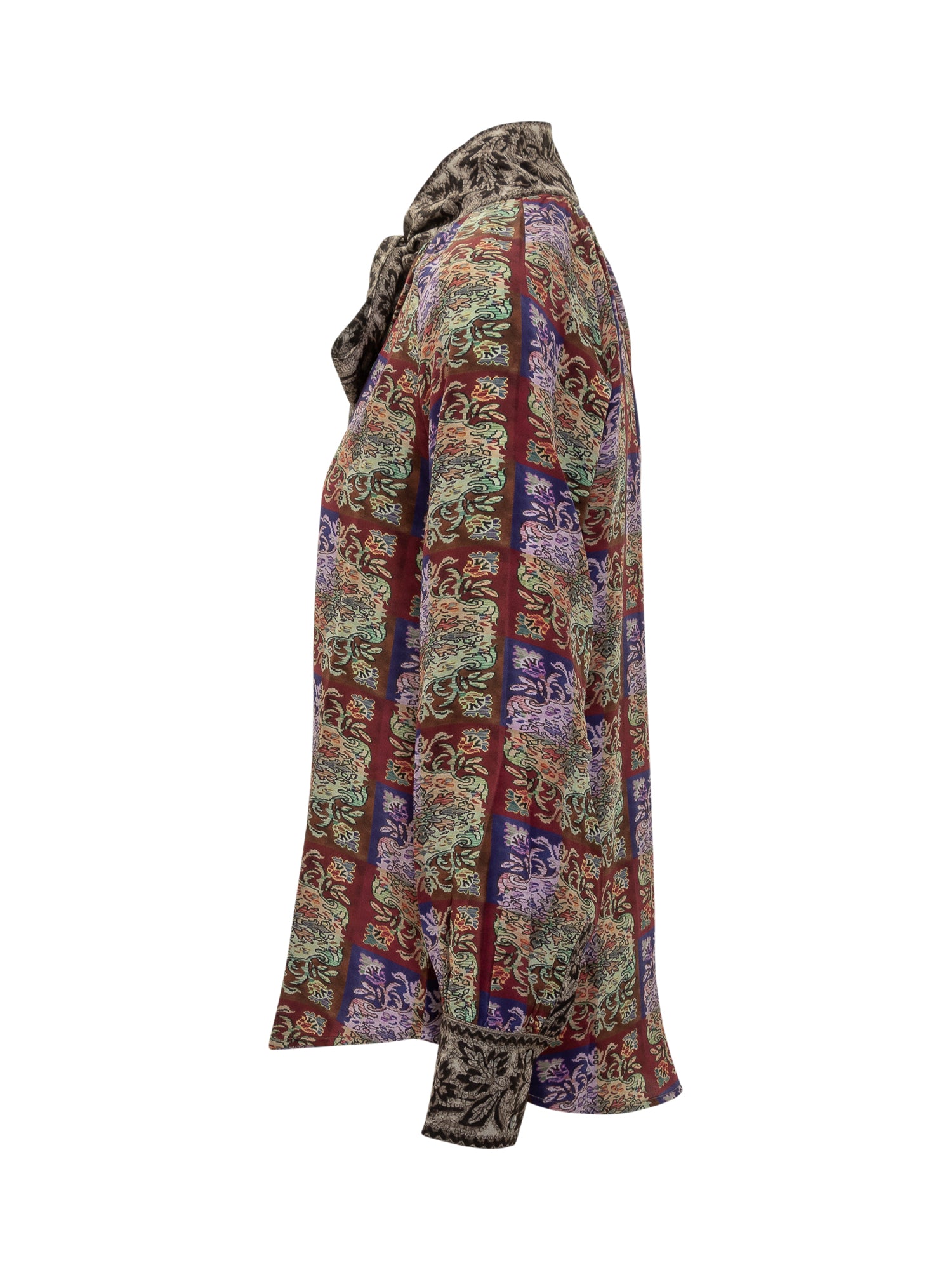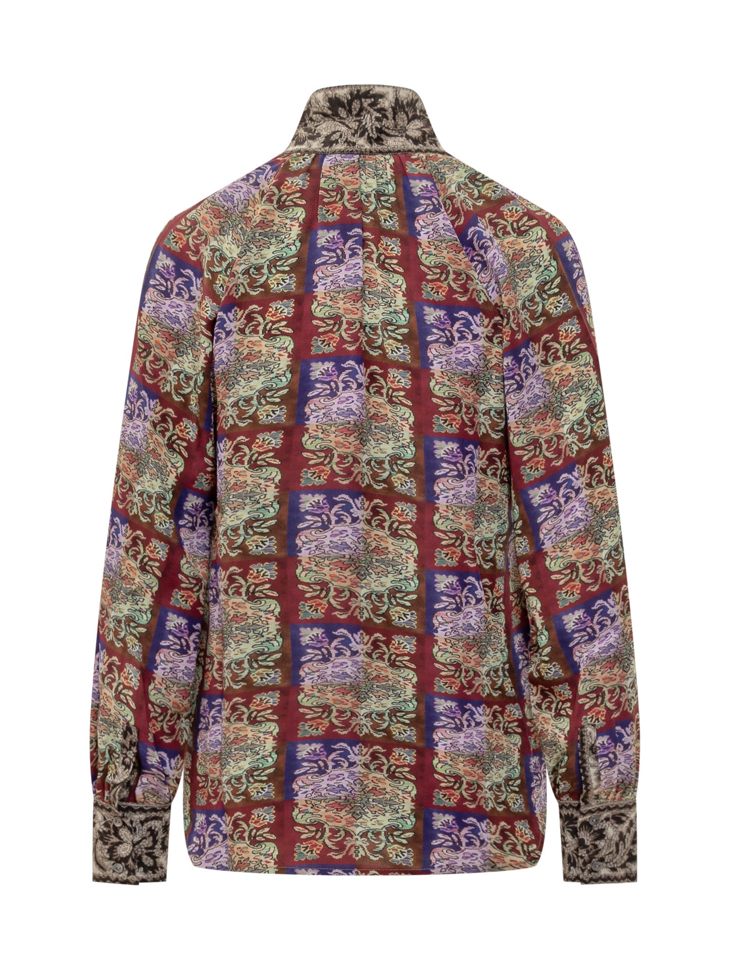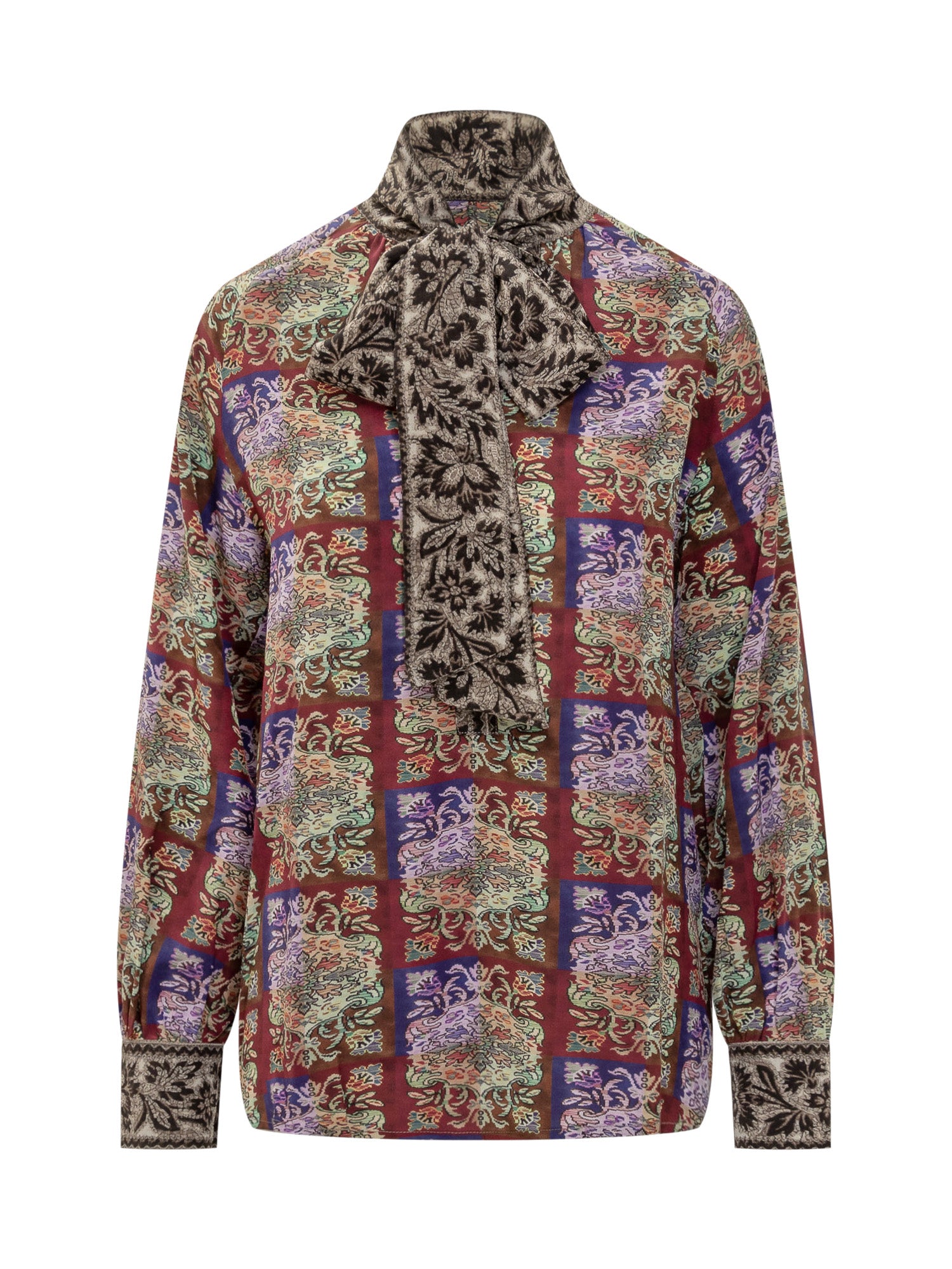 Pure silk blouse with multicolor check print and contrasting neck bow. Baroque and floral details combine for a refined, artistic touch.