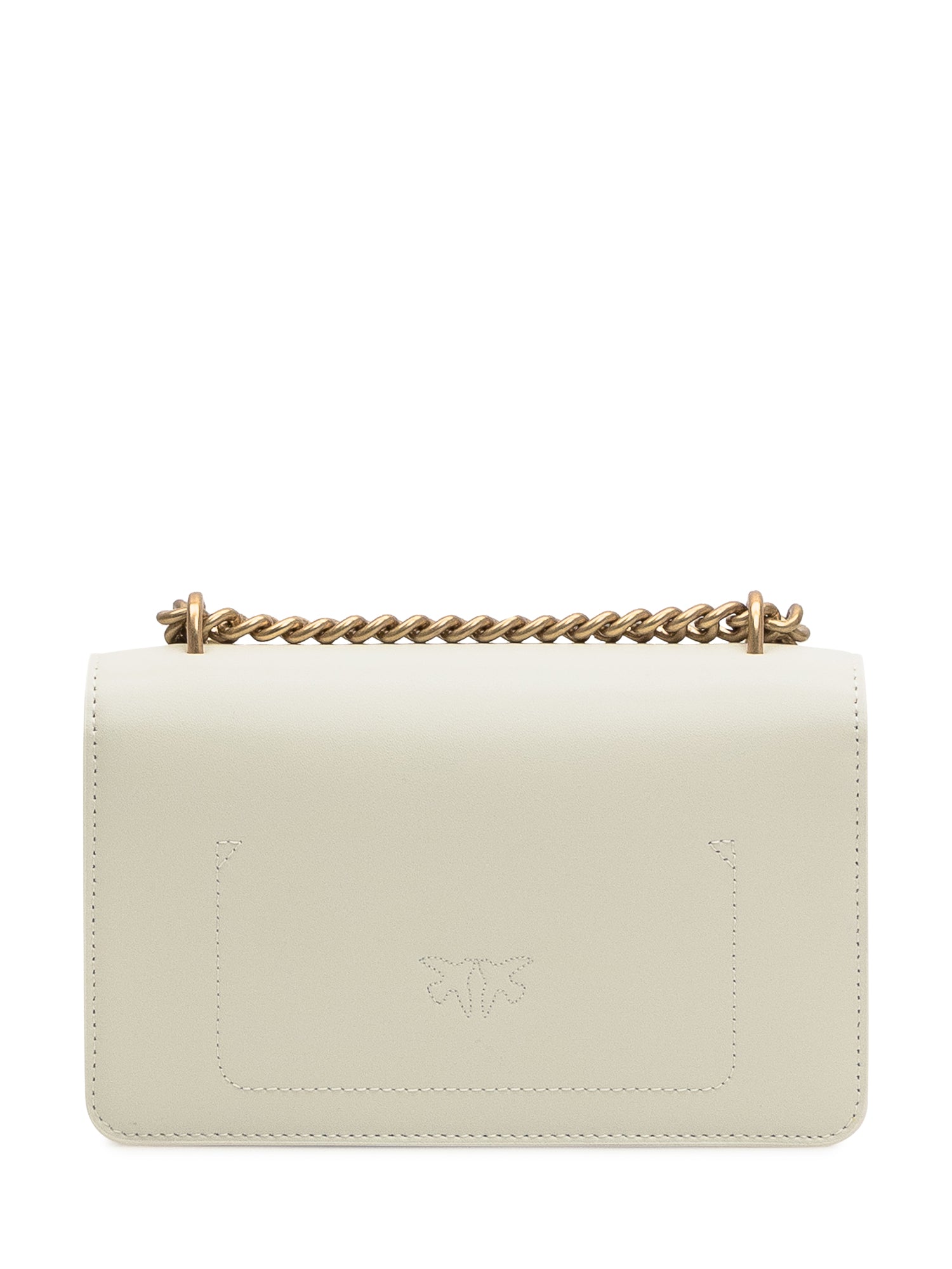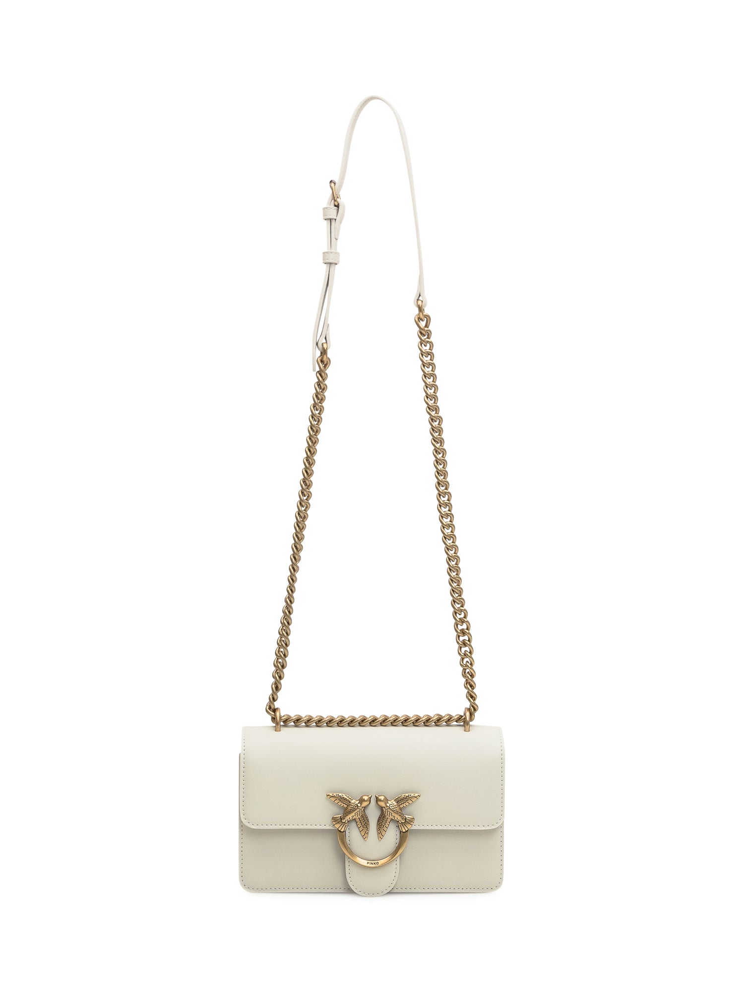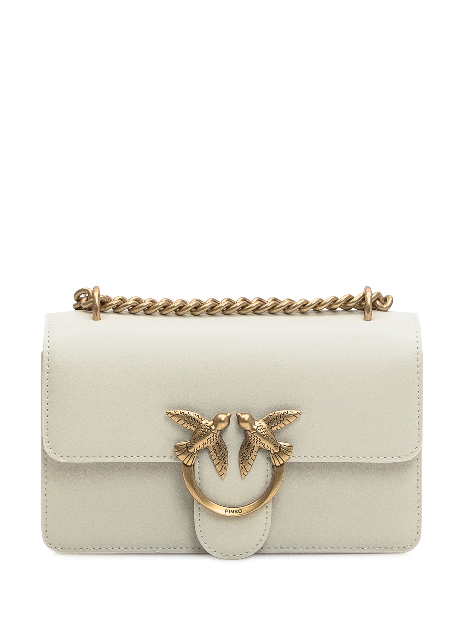 Beige bag. Chain shoulder strap. Flap and snap closure. Two compartments with zip pocket. Logo buckle on the front.