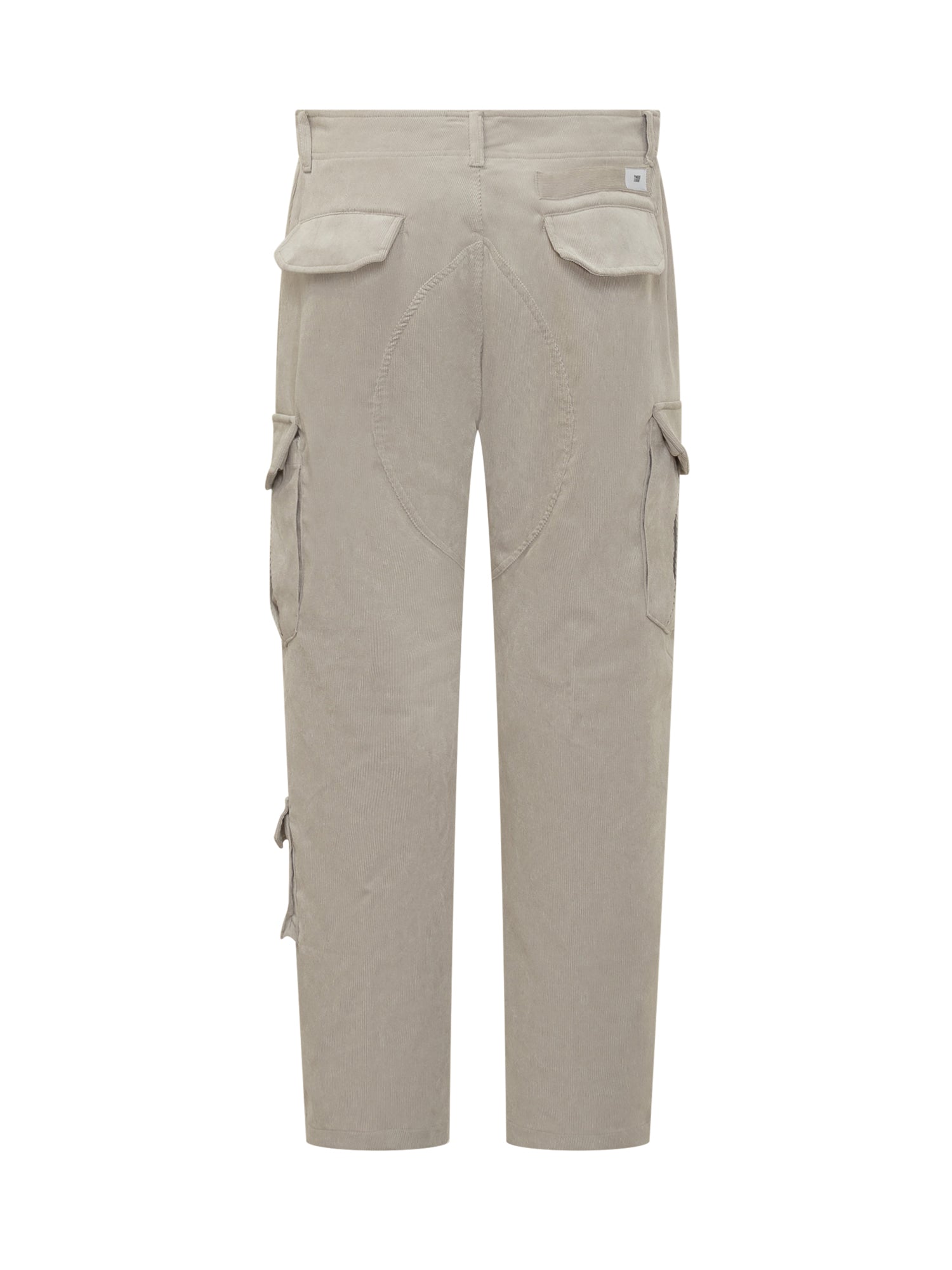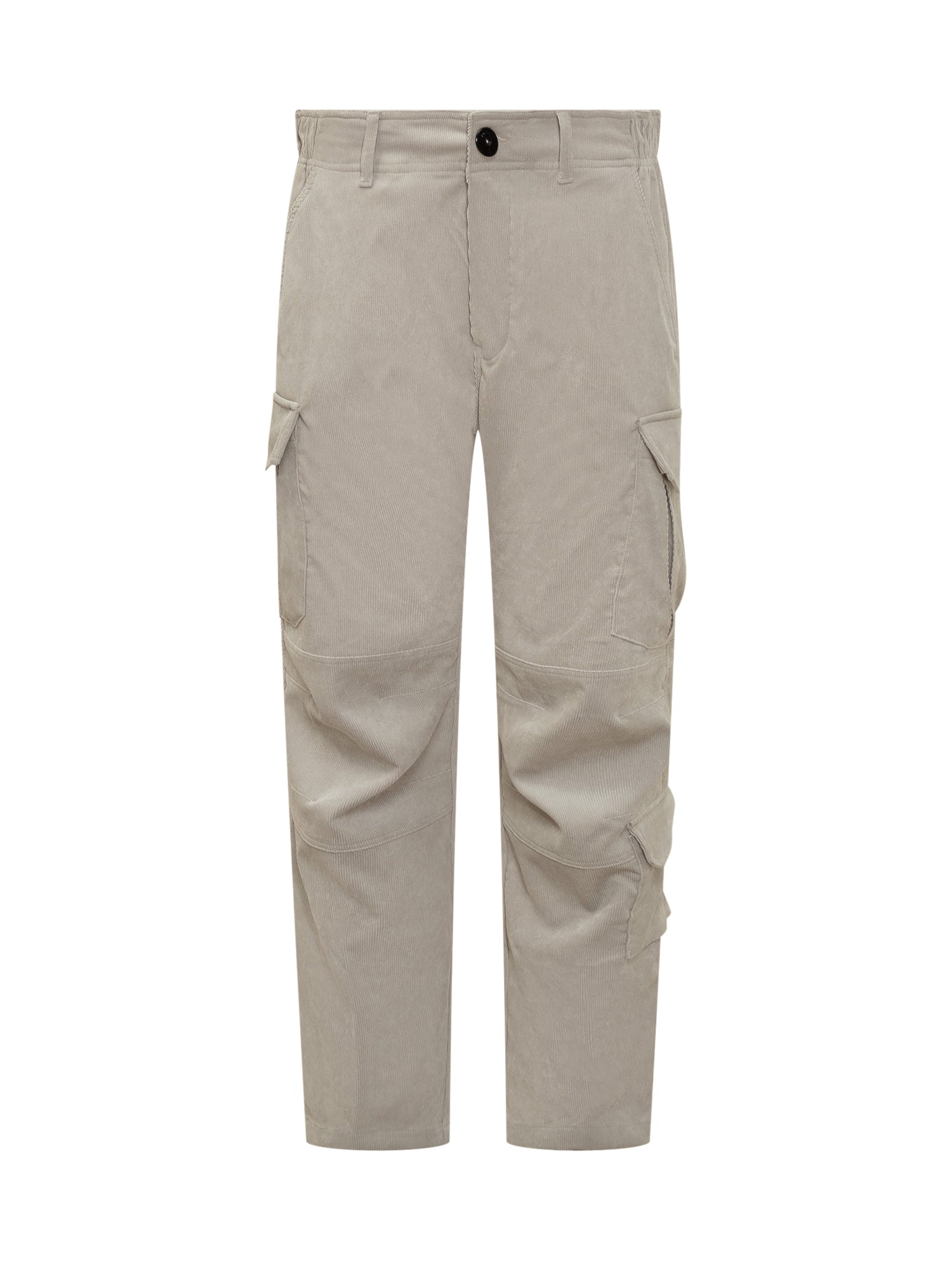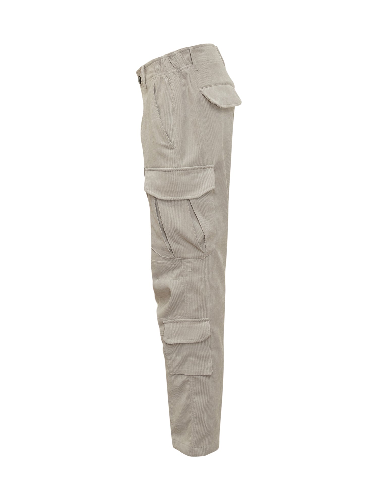 P.M.D.S beige corduroy cargo pants with side flap pockets, button and zip closure, and regular waist.
