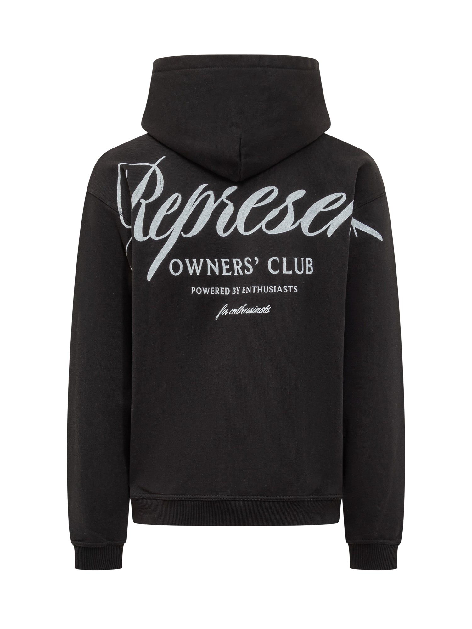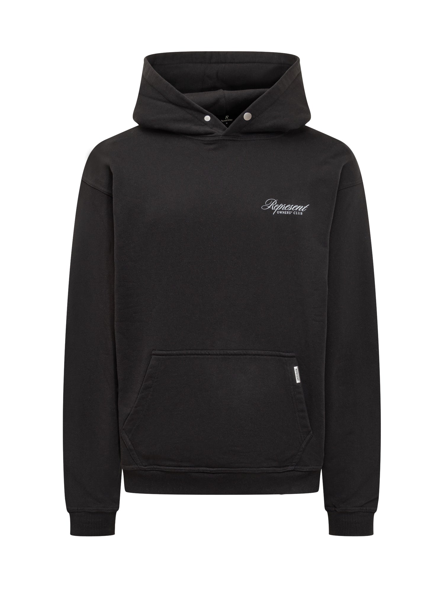 Black cotton hoodie. Maxi front pocket. Print with logo on the front and back.