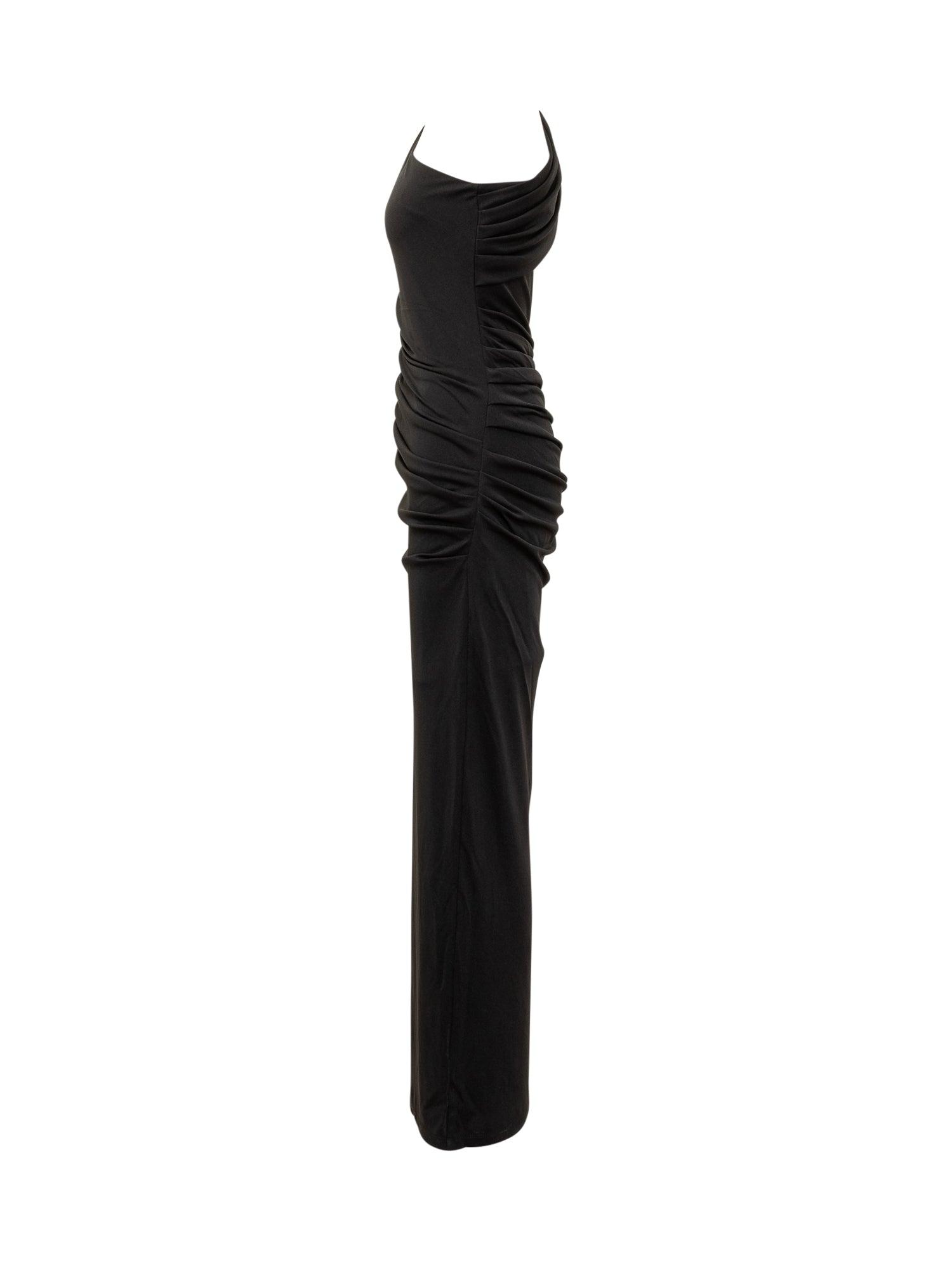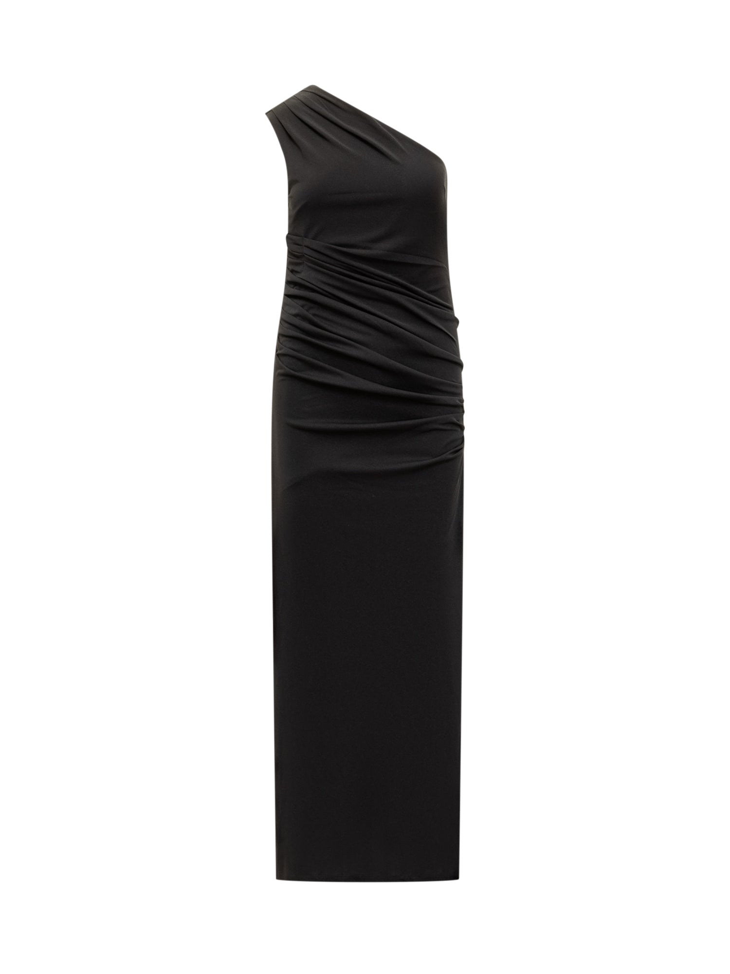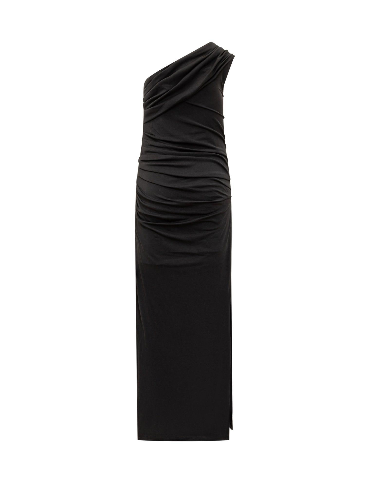 Rotate black maxi dress with a one-shoulder neckline and side draping that enhances the silhouette.