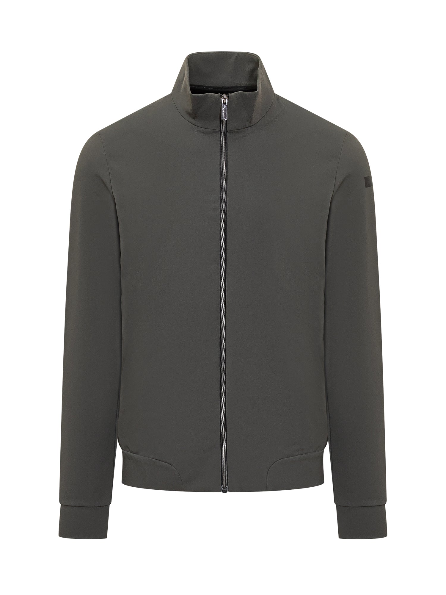 Long-sleeved jacket. High collar. Zipper closure. Ribbed hems. Two side pockets. Logo patch on sleeve.