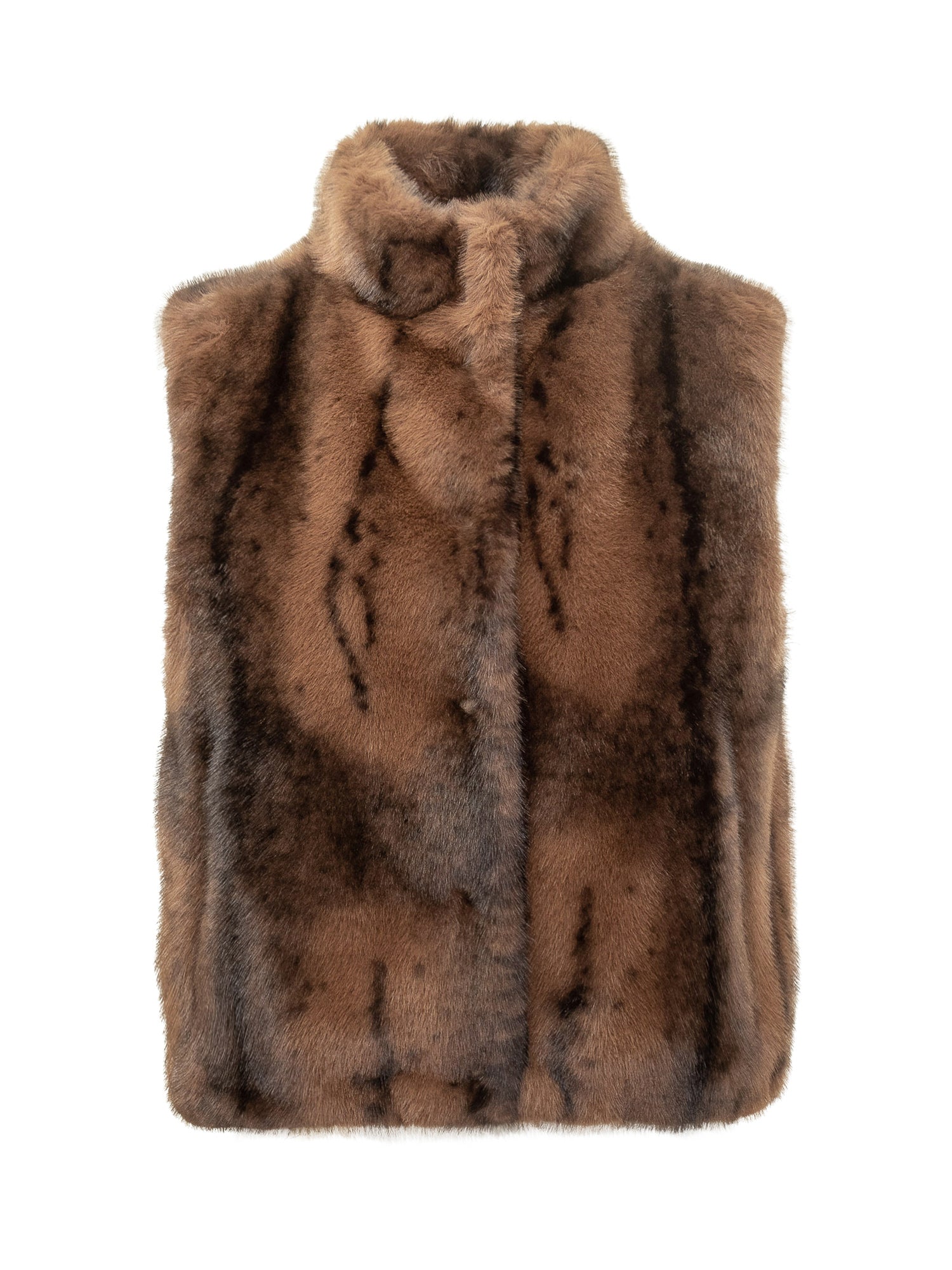 Seventy 19.70 vest in soft brown faux fur with high collar and front closure.