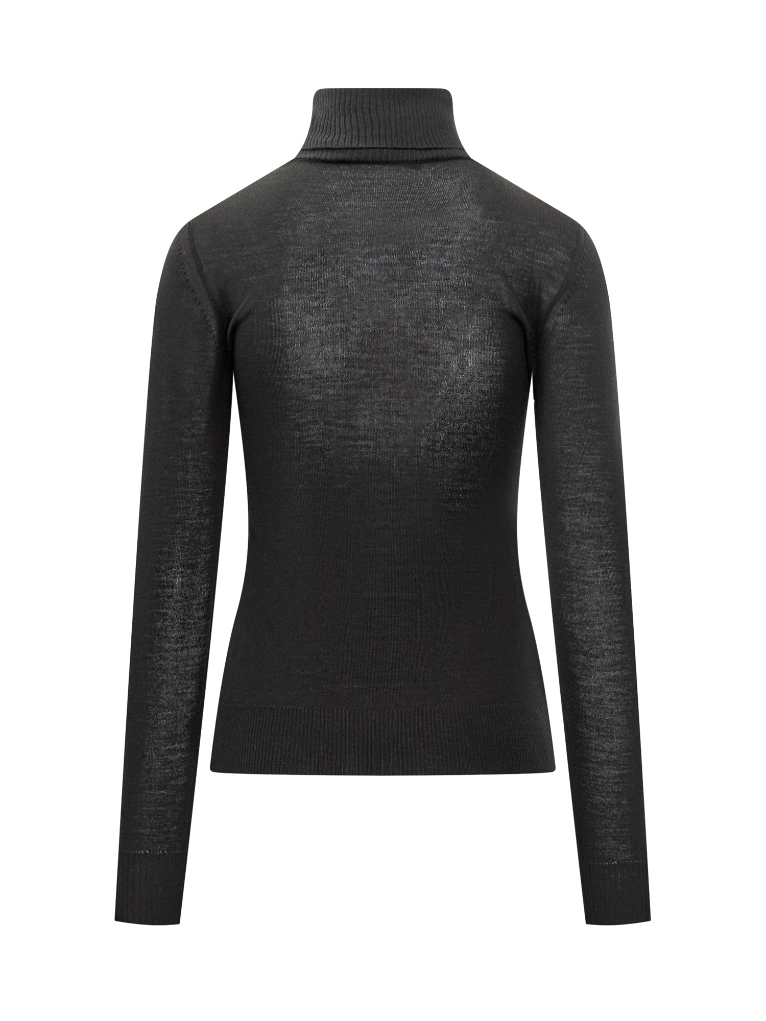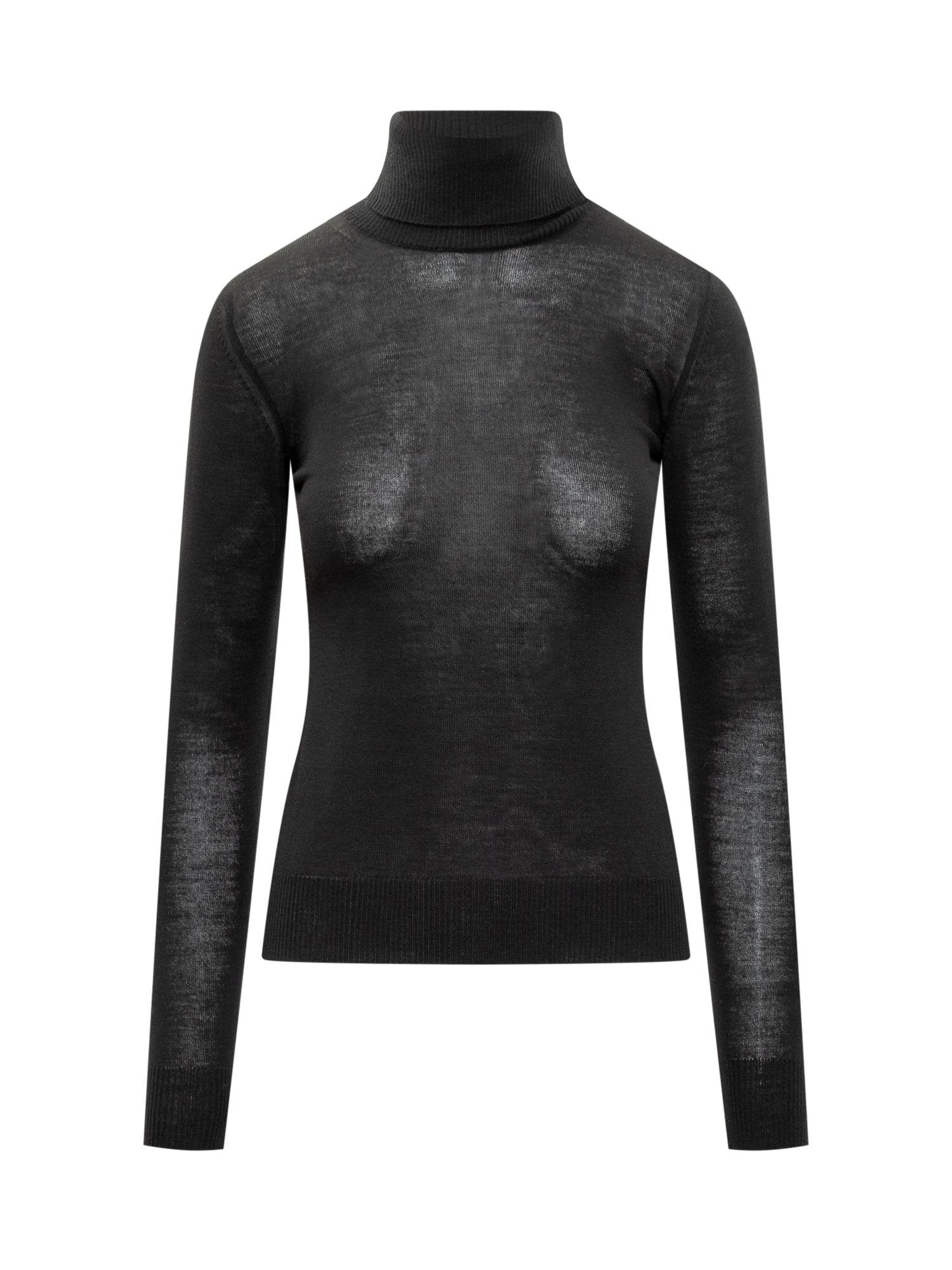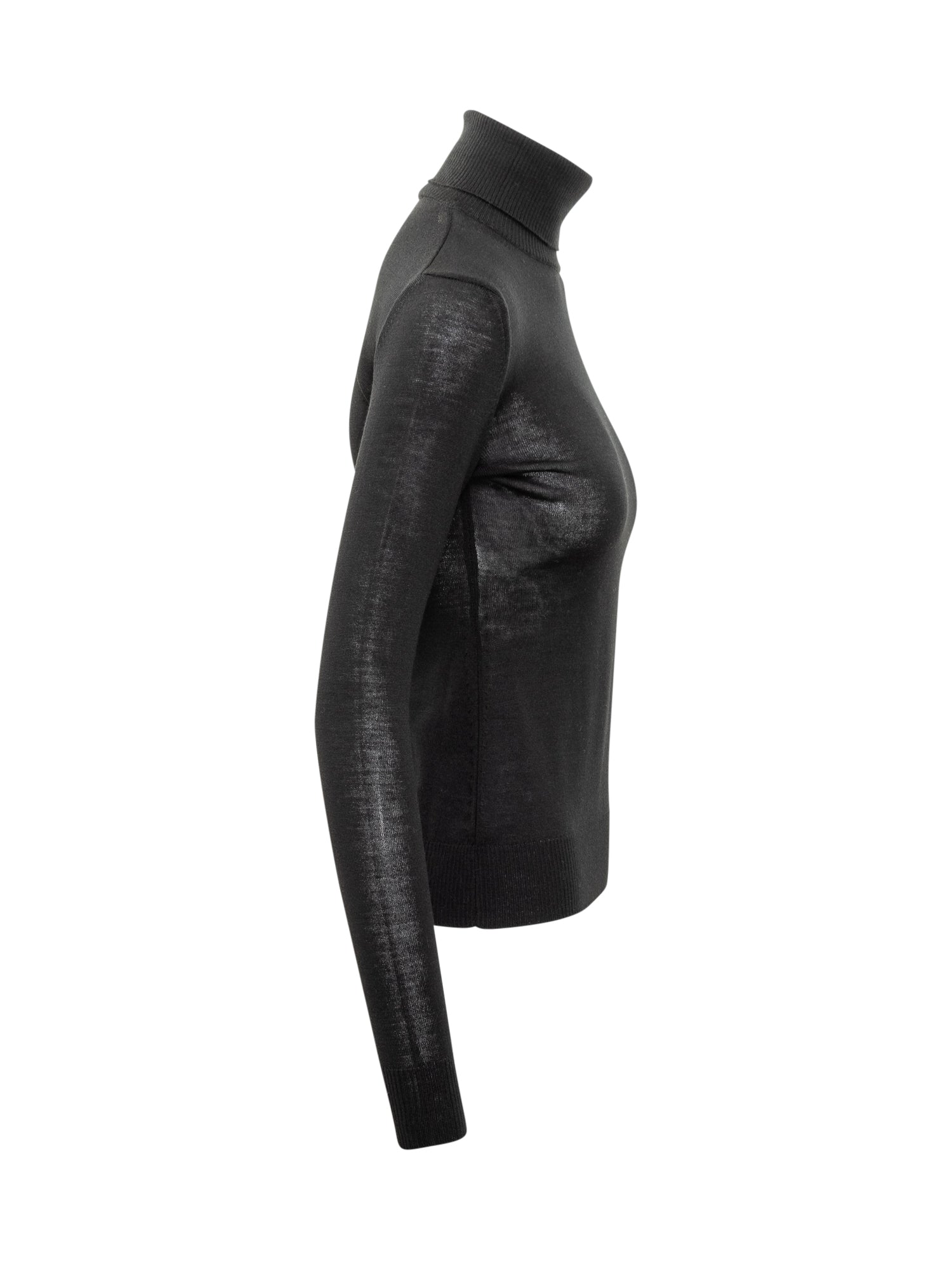 Long-sleeved black semi-sheer tulle turtleneck with ribbed details on collar, cuffs, and hem. Ideal for elegant looks or sophisticated layering.