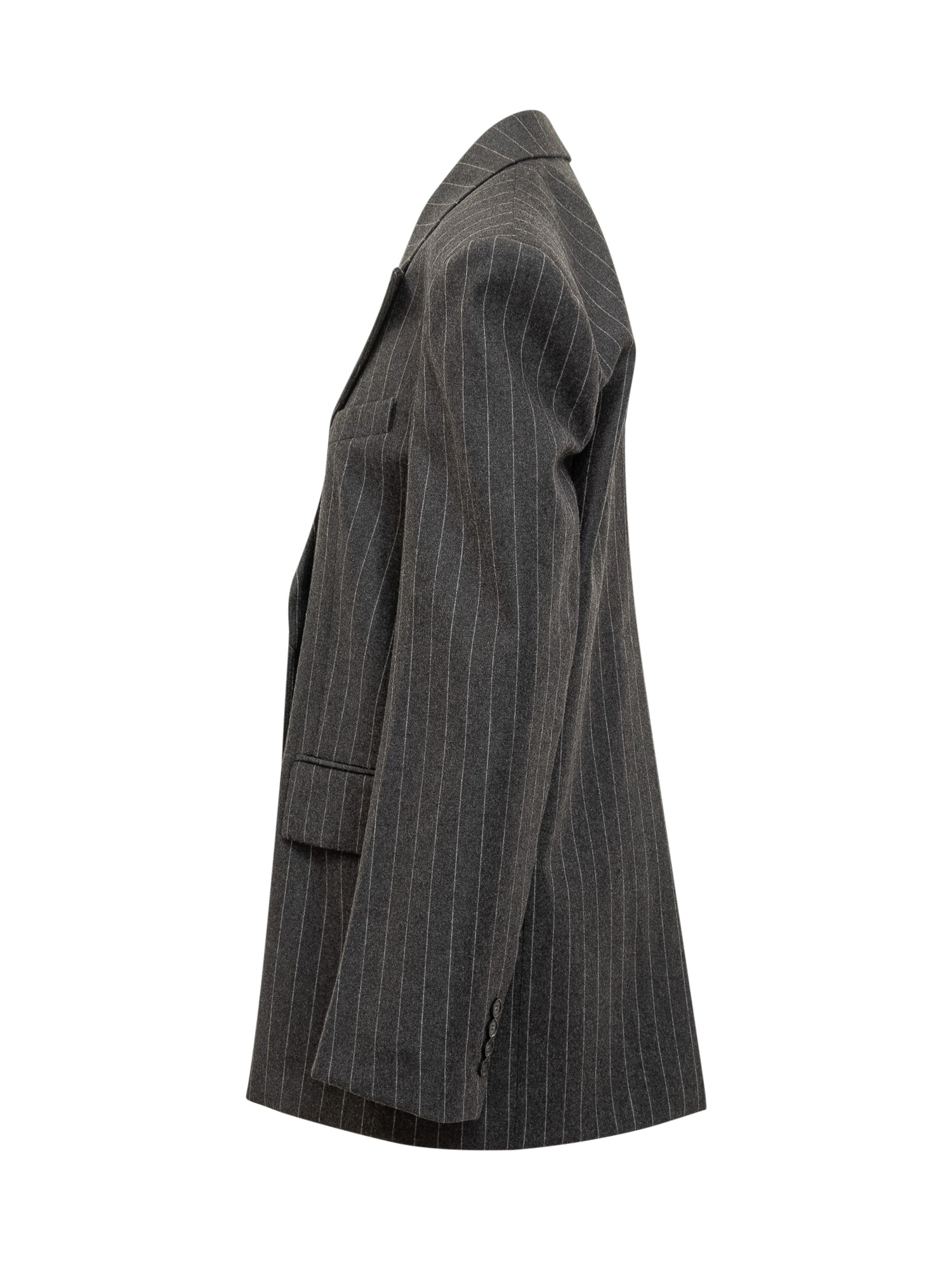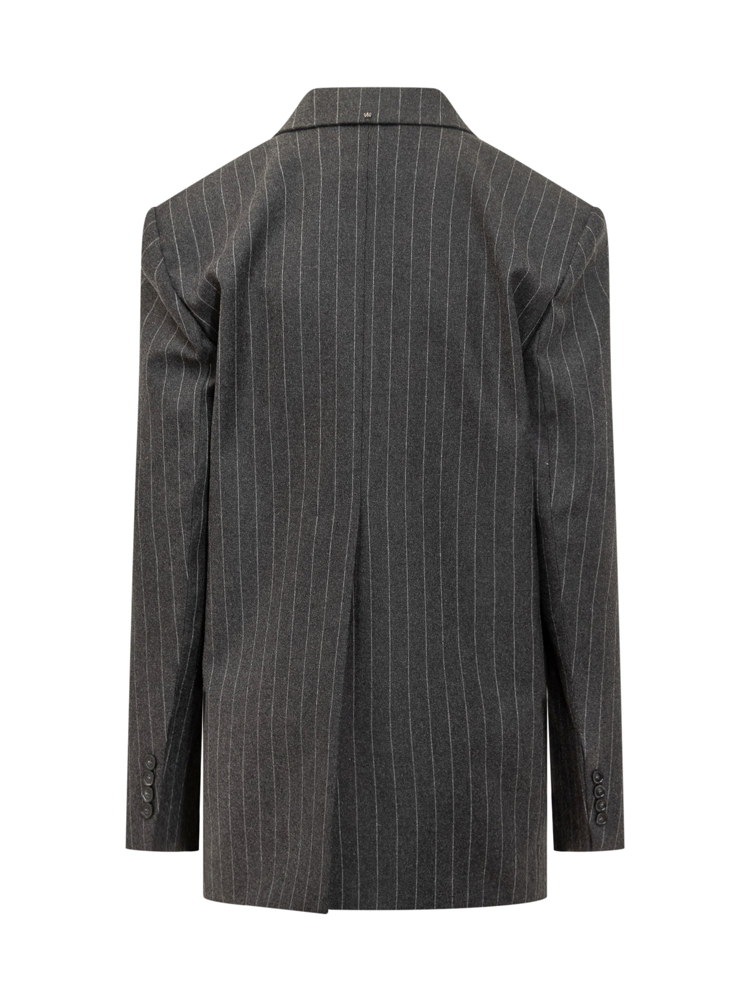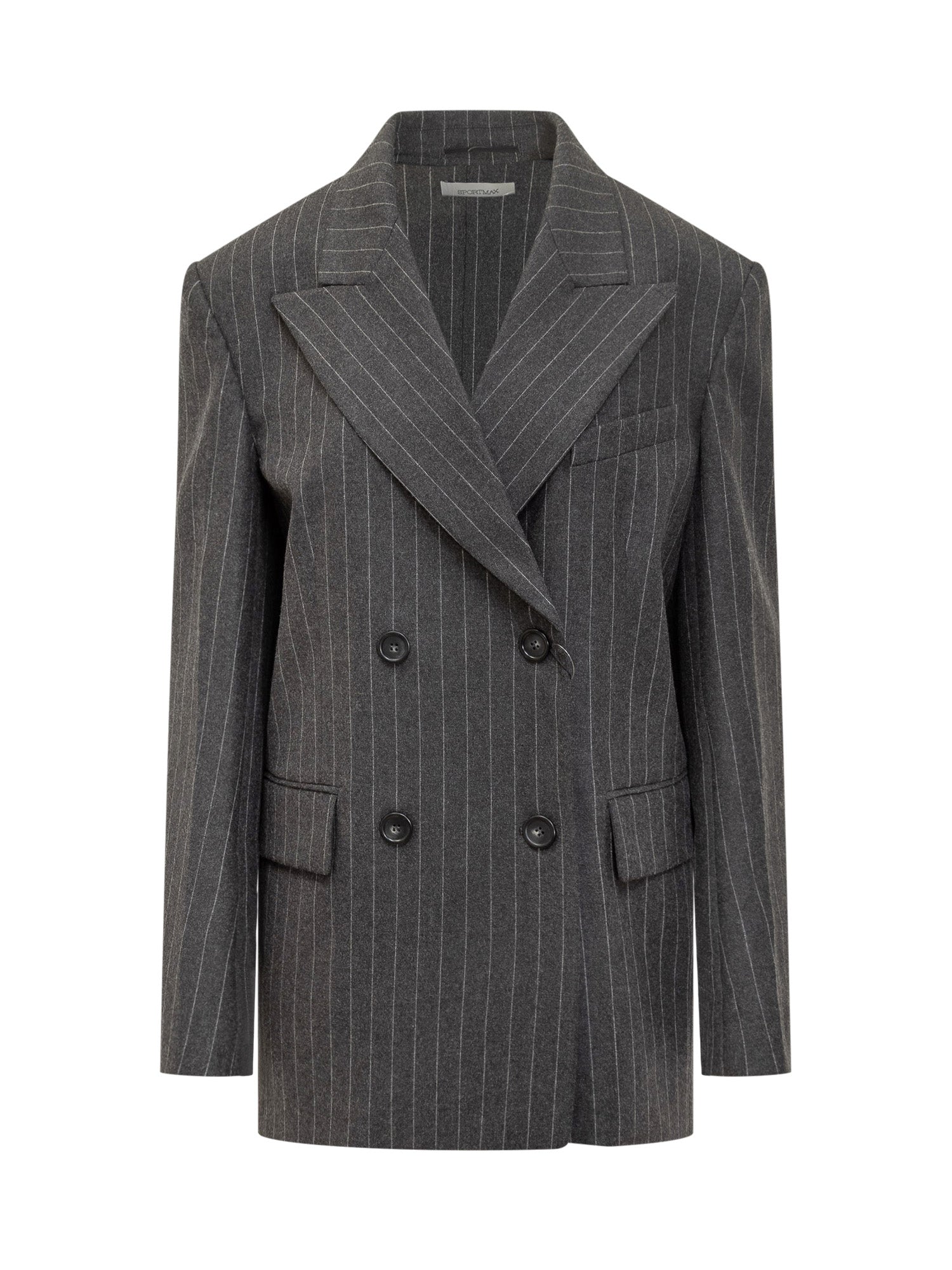 Sportmax double-breasted blazer in grey wool with pinstripes. Features wide lapels, flap pockets and button closure.