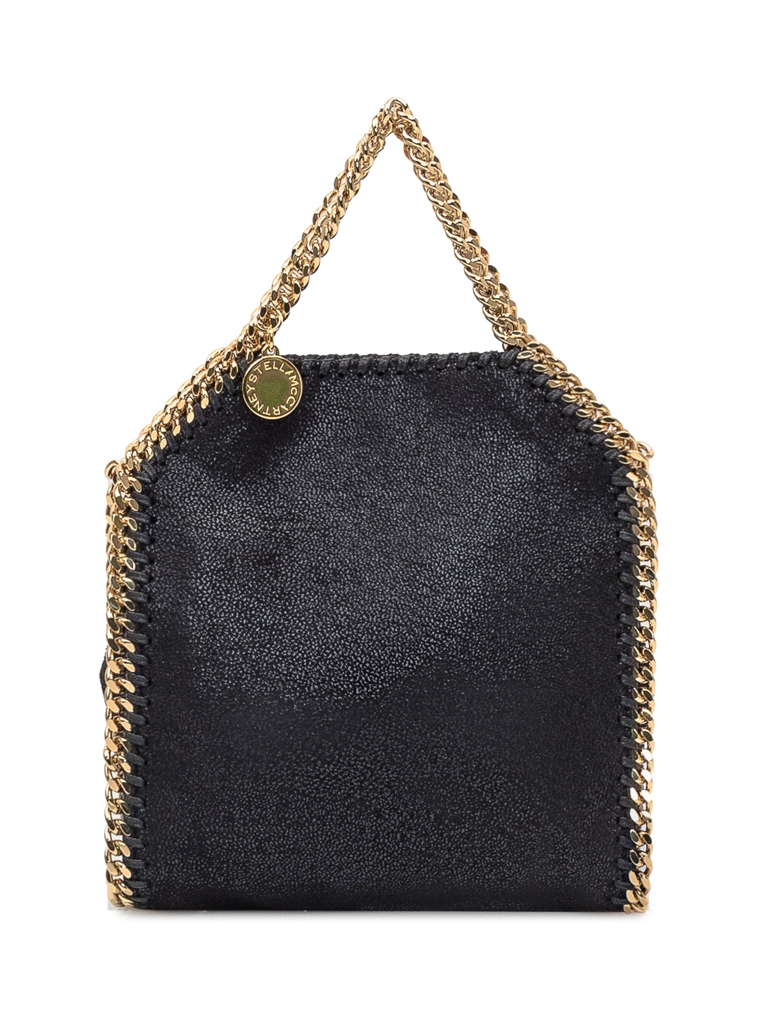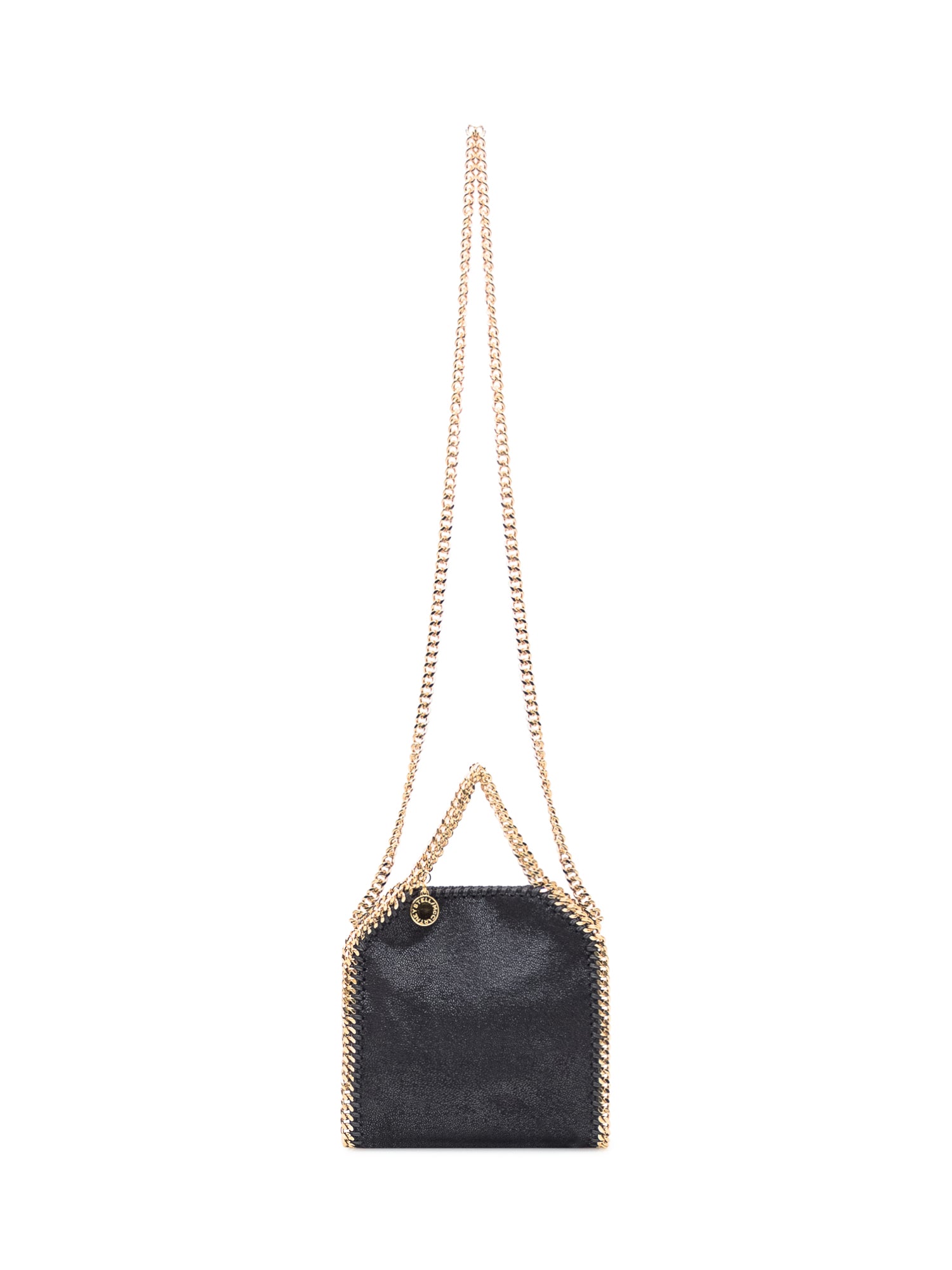 Stella McCartney Falabella bag in black faux leather effect fabric, gold chain trims and chain handle. Iconic and versatile design, perfect for both elegant and casual looks.