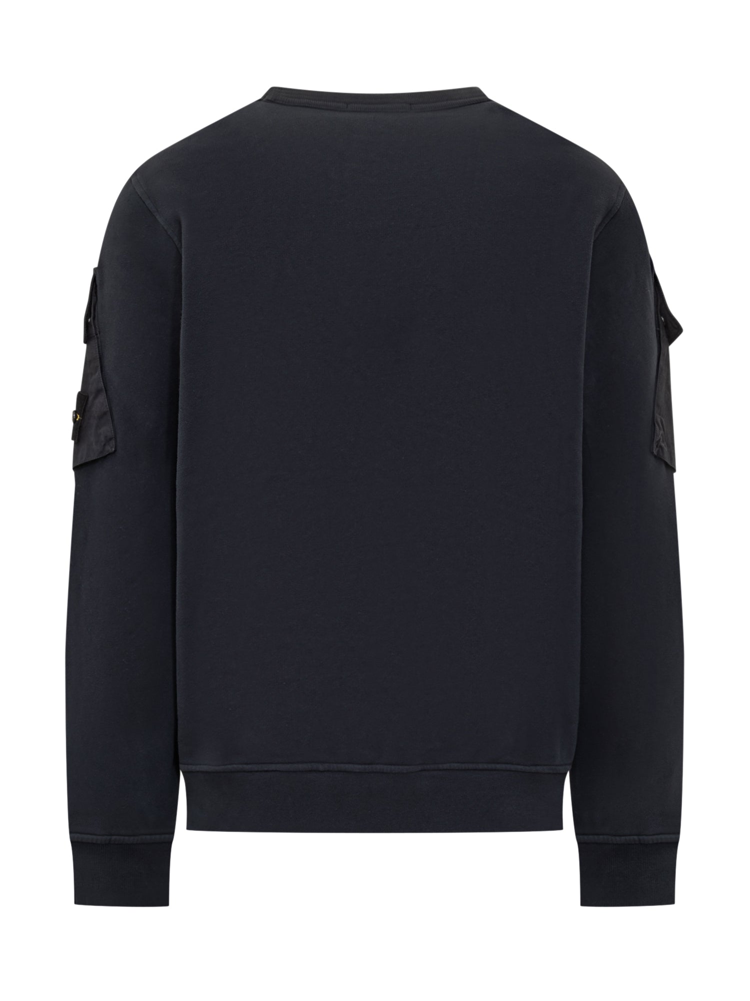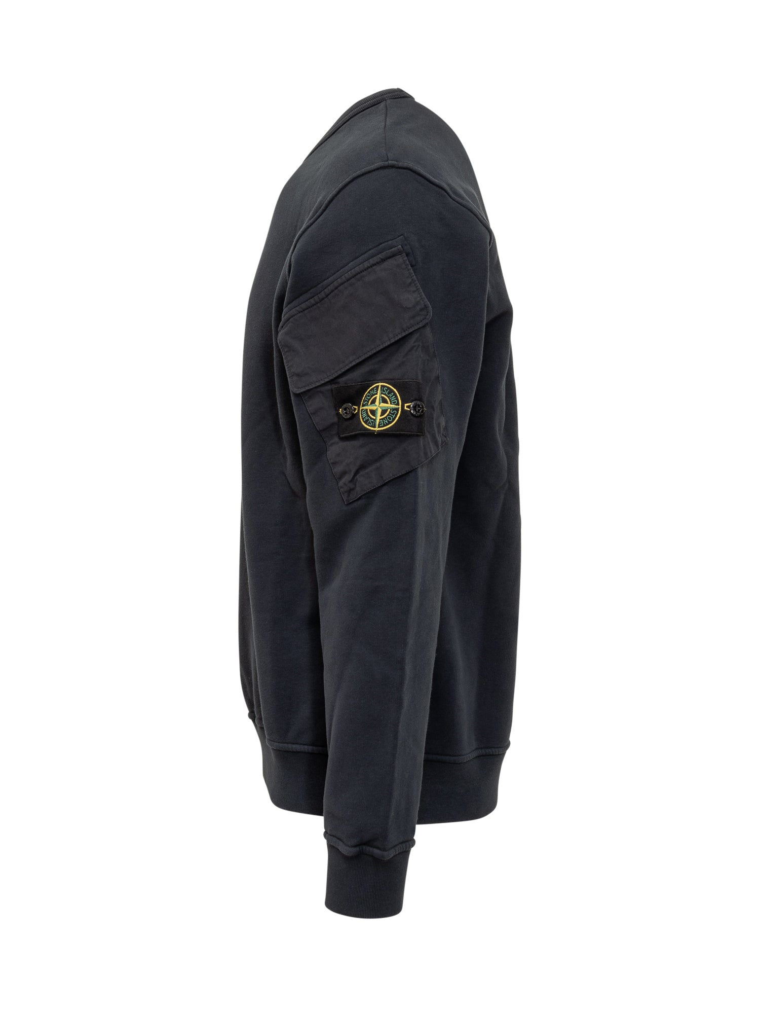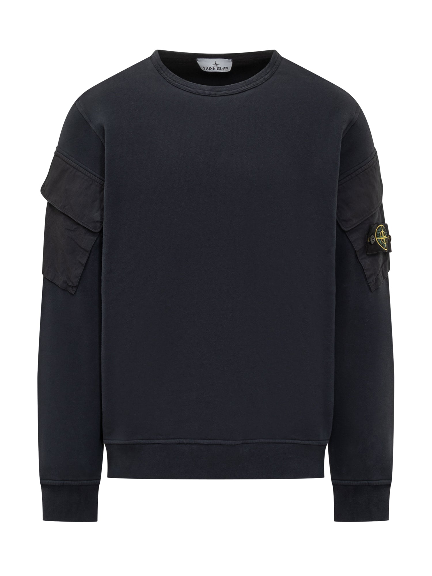Stone Island black sweatshirt with cargo sleeve pockets and iconic logo patch.