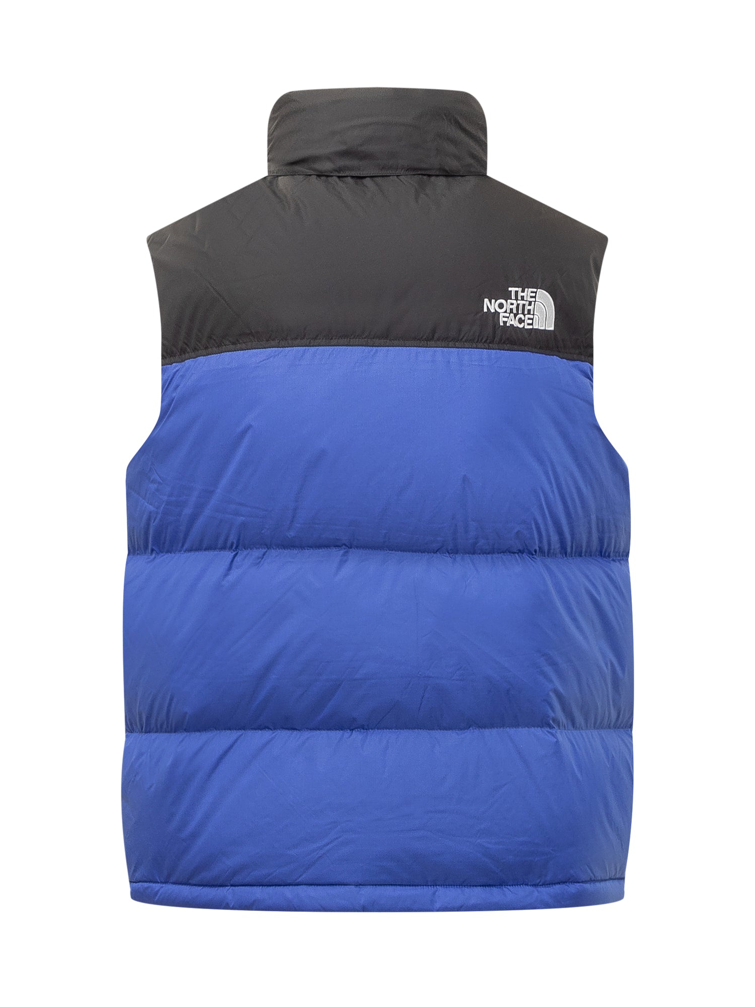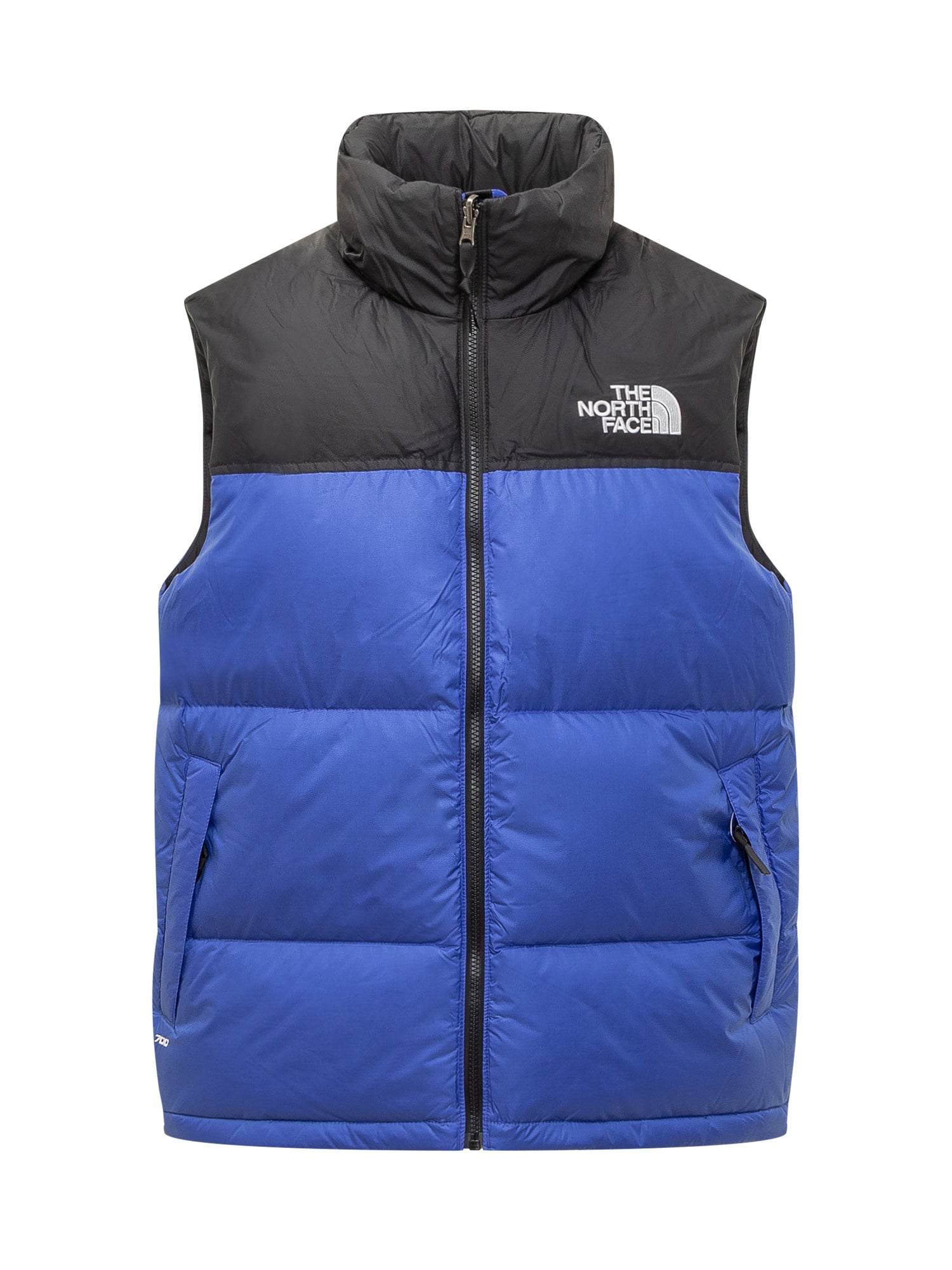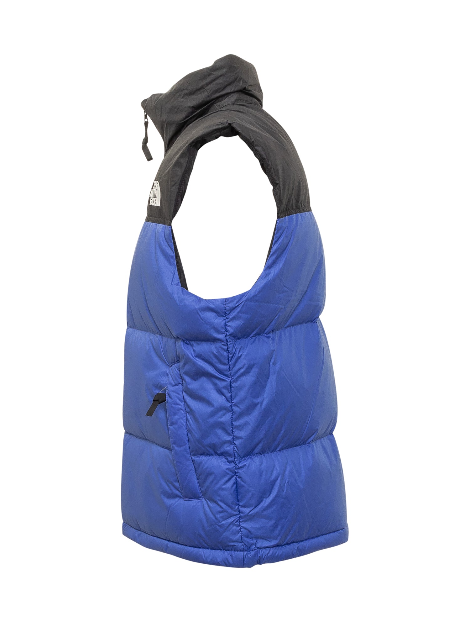 Blue sleeveless down jacket. High collar. Front zipper closure. Embroidered logo on chest and back. Side pockets with zippers. Hood with removable visor.