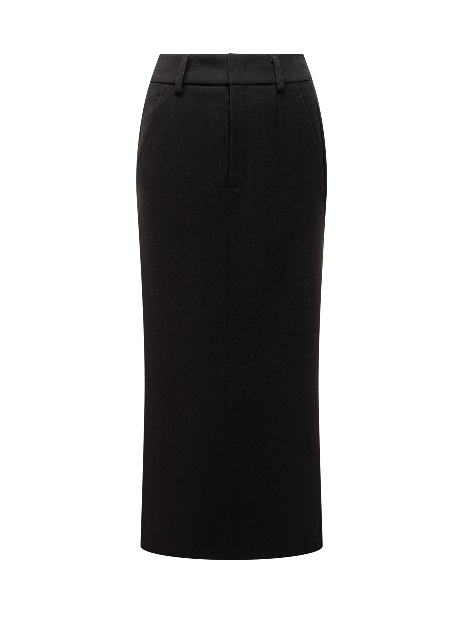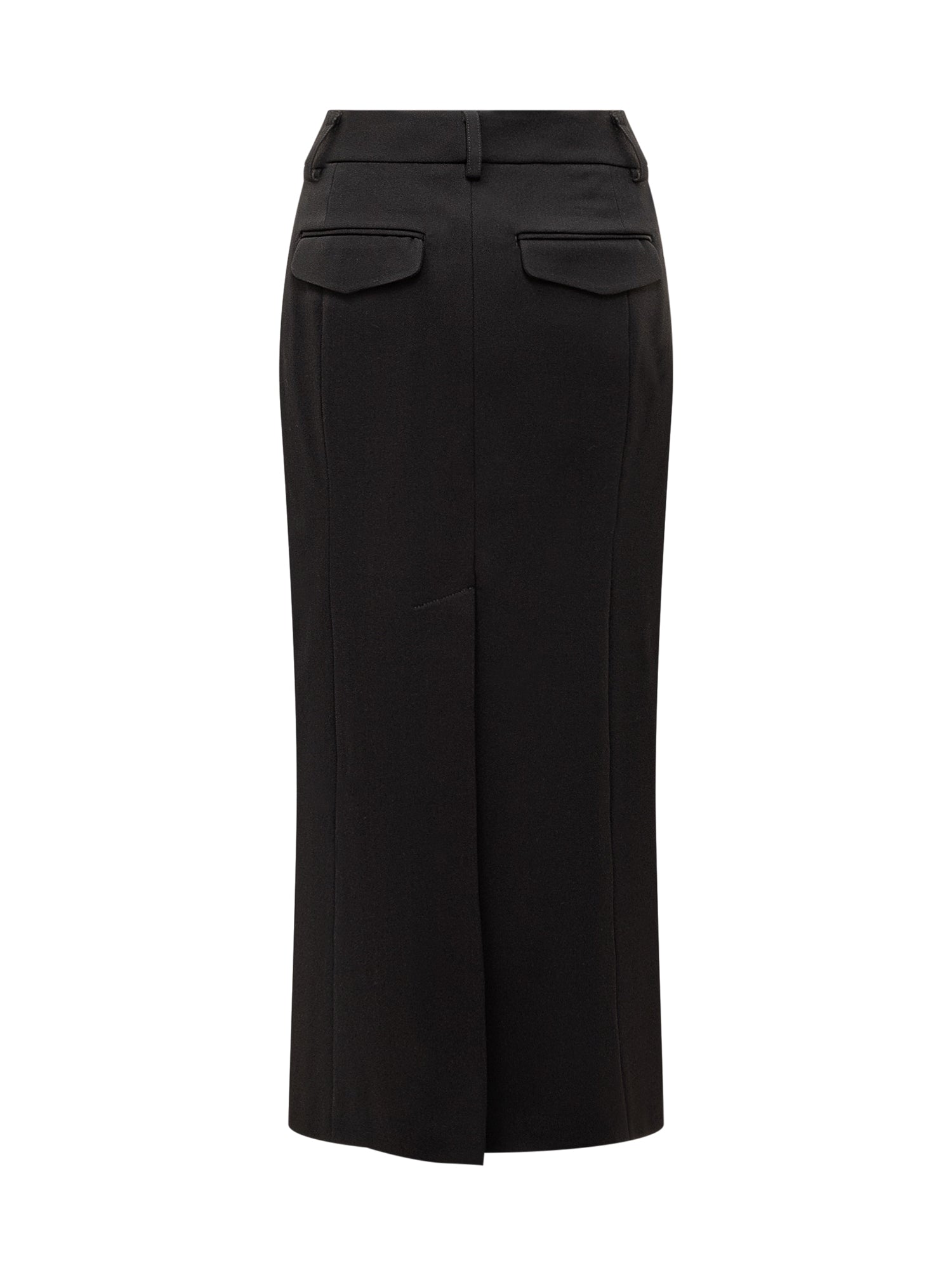 Longuette skirt. Zipper and hook-and-eye closure. Belt loops. Four pockets. Back slit.