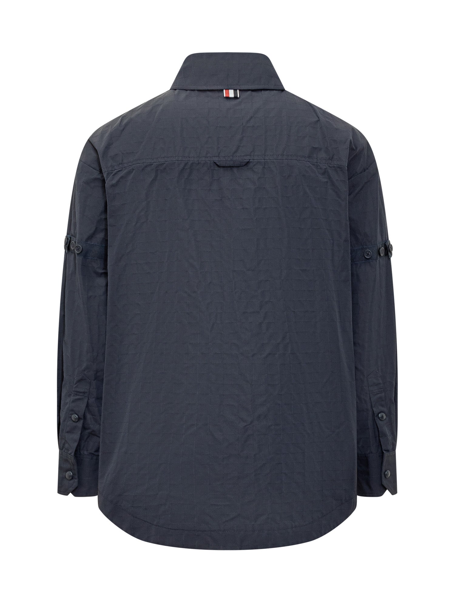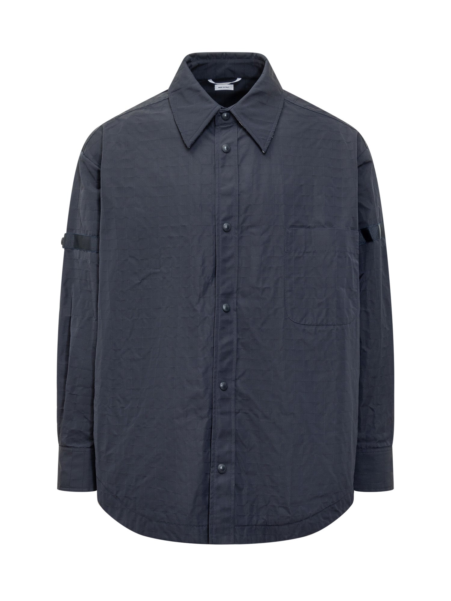 Oversize long sleeve shirt. Classic collar. Snap button closure. Button cuffs. Chest pocket. Adjustable straps on the sleeves. Tongue with grosgrain loop in striped signed on the back. All over stitching.