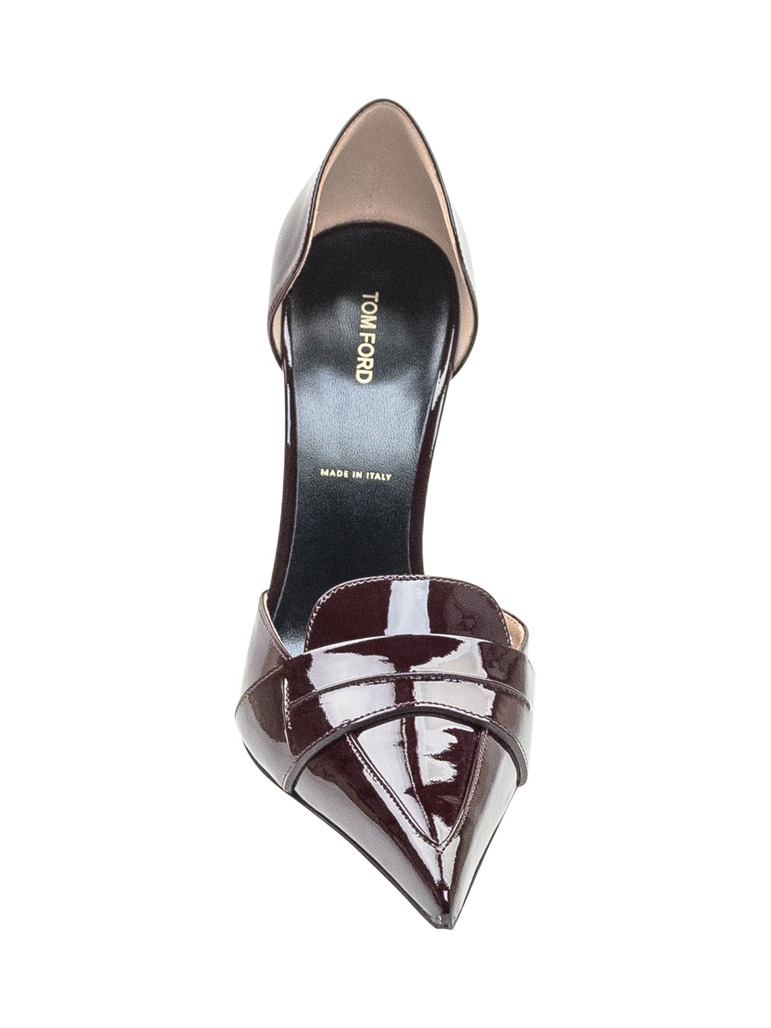 Elegant Tom Ford pumps in burgundy patent leather with pointed toe and stiletto heel. The loafer-inspired detail adds sophistication.