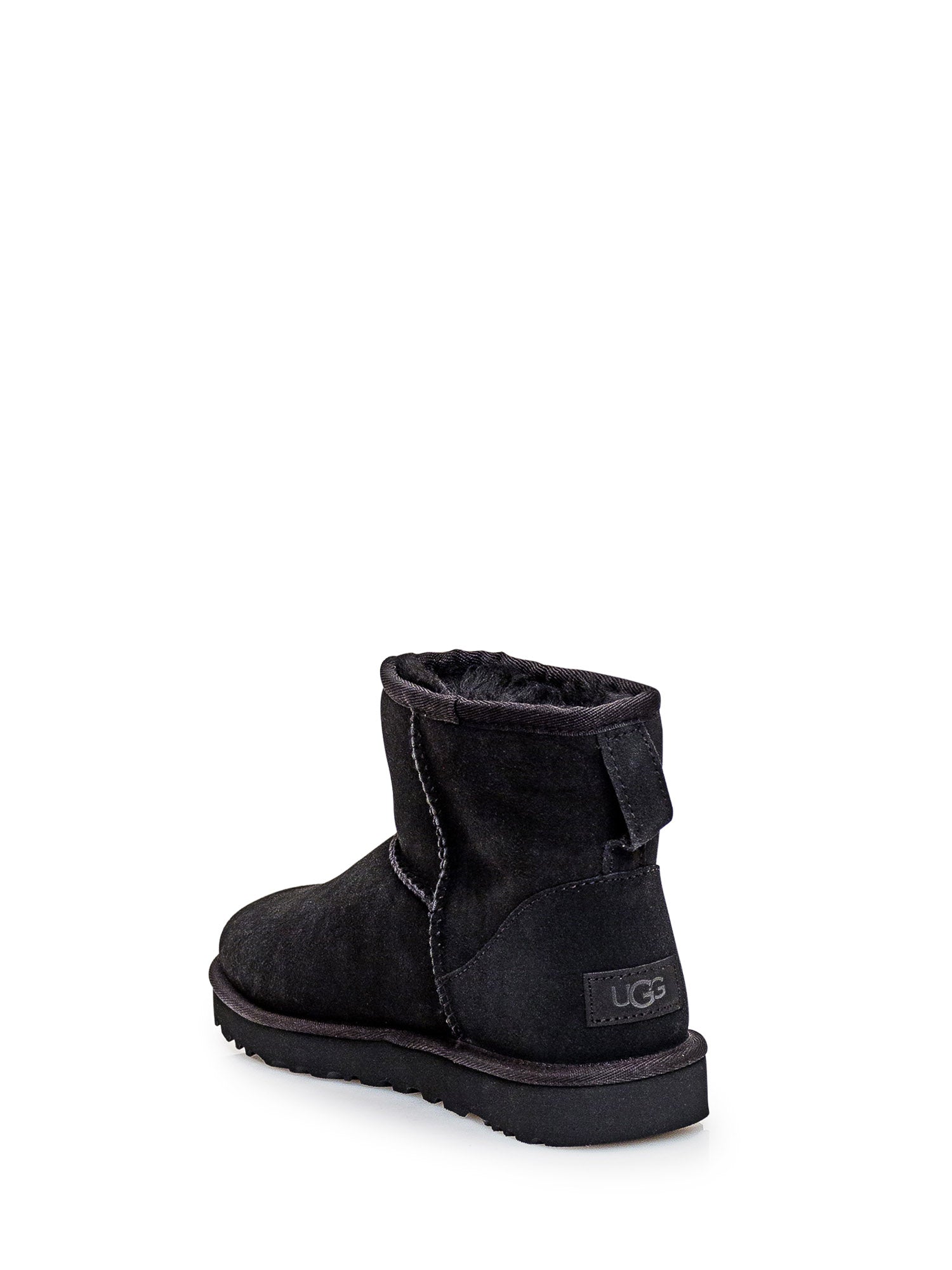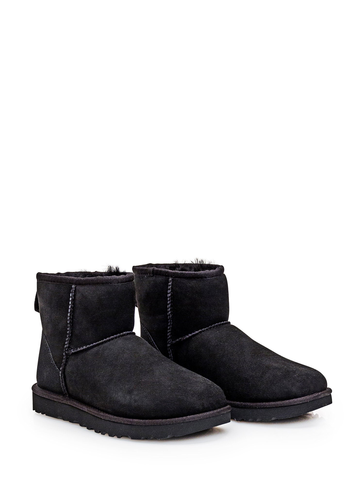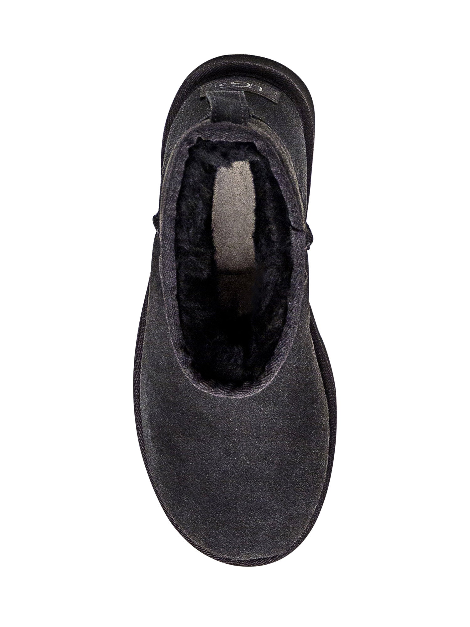 Black suede boot. Slip-on. Sheepskin lining. Logo patch on the heel.